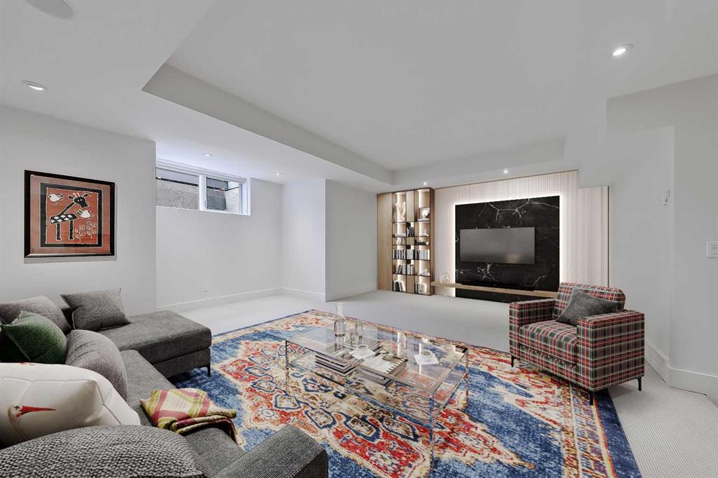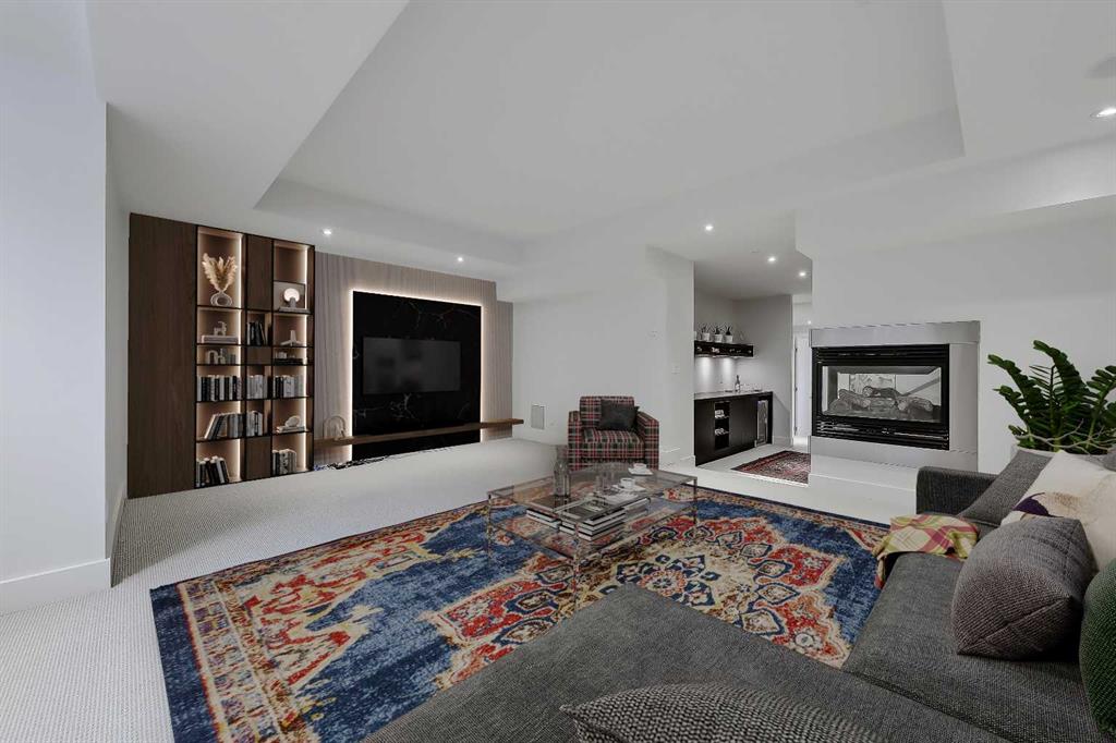 The fully finished BASEMENT has 9’ ceilings and a large media/rec room with 5.1 surround sound/built-in speakers, a full bar area, ( mechanical room behind offers possibility for bar sink), guest bedroom, and 3 piece. bath with zoned in-floor heating throughout. House interior was repainted end of 2024, and new roof 2020. Double high velocity furnaces, provide more efficient heat/air distribution, and soft “flex” ducting reduces noise and dust.