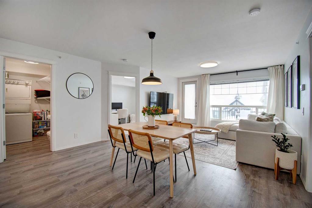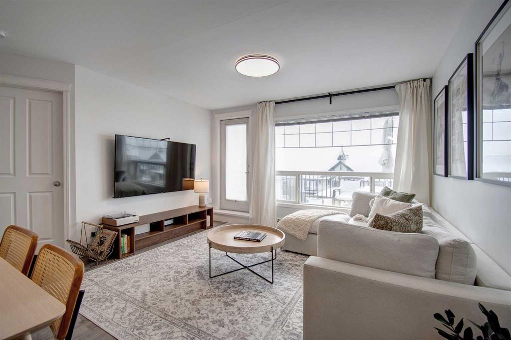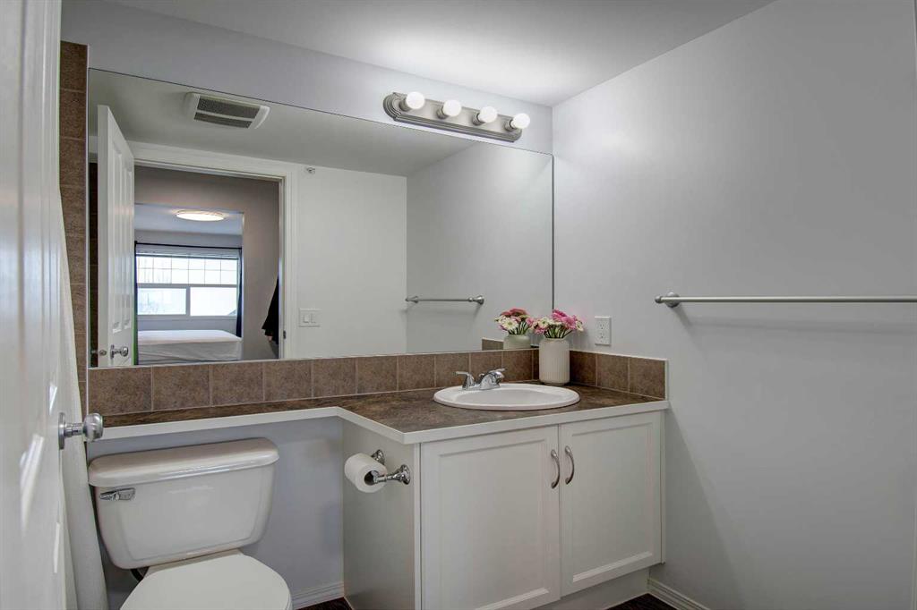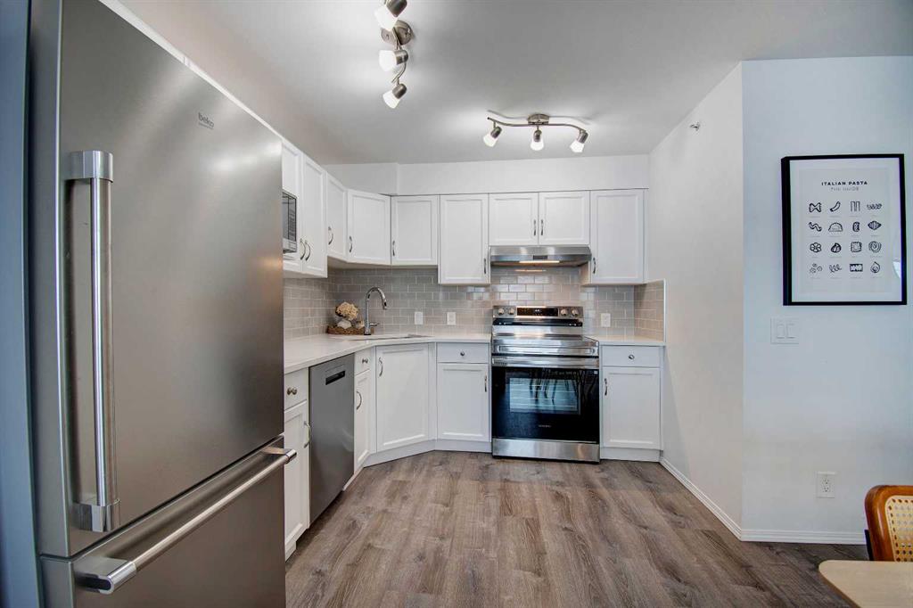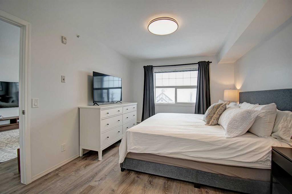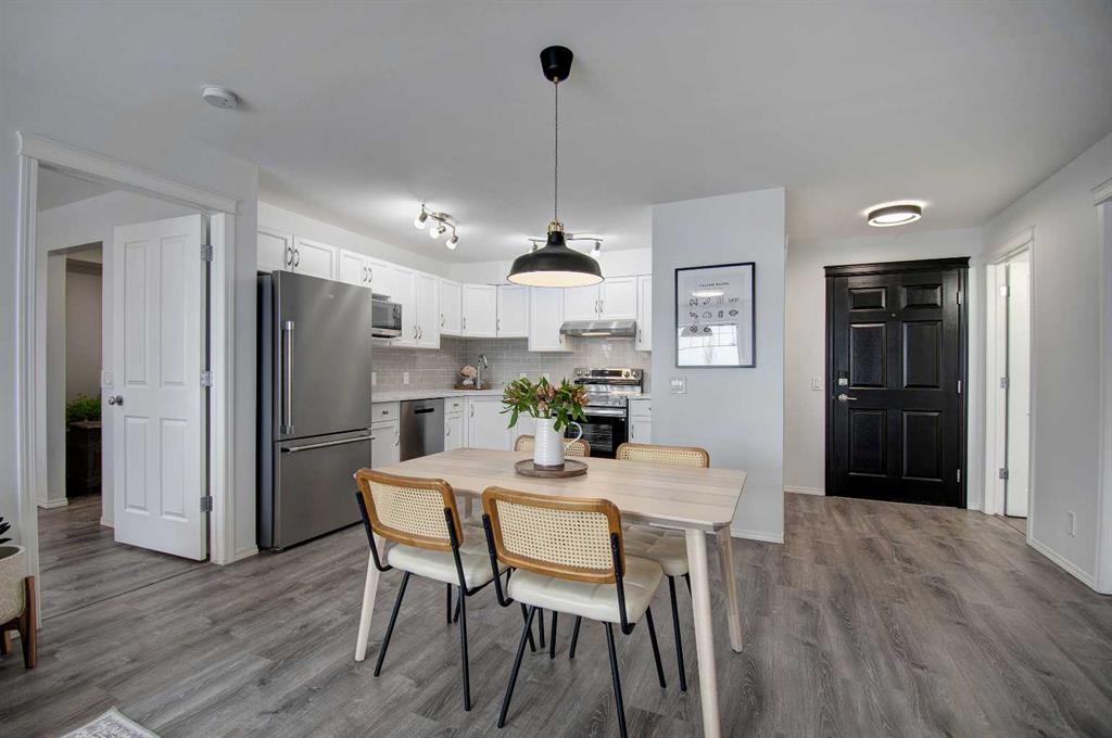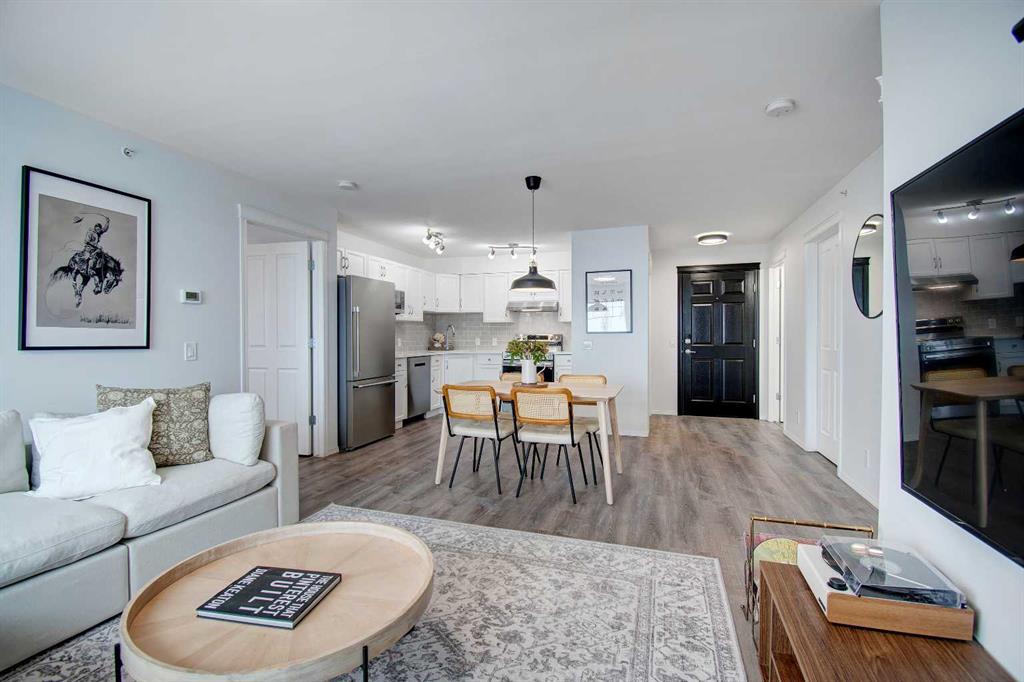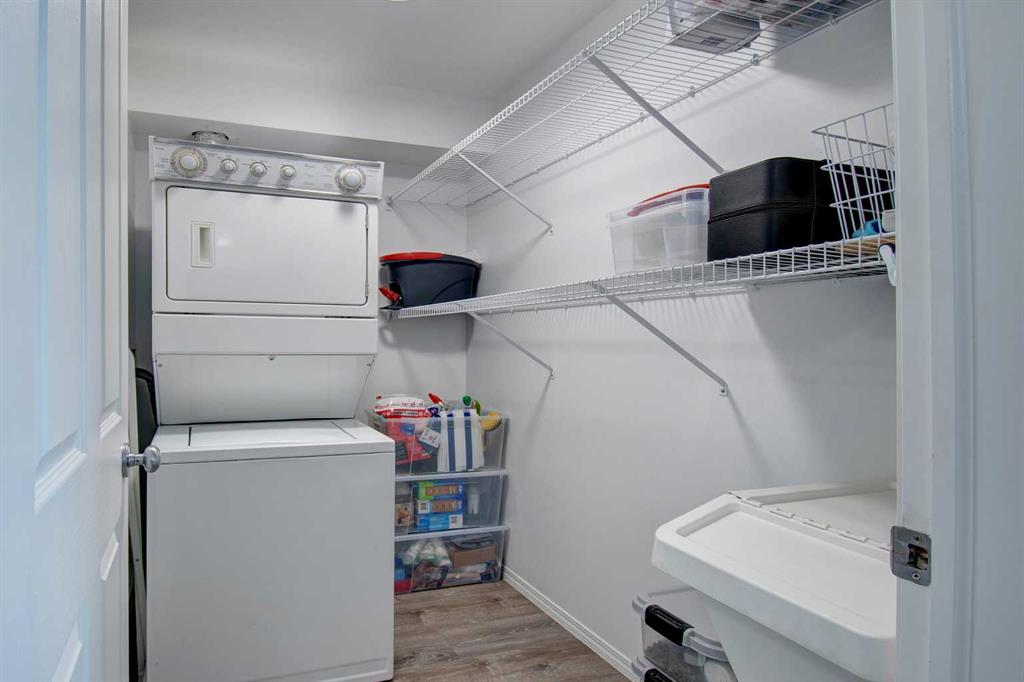 Welcome to Sage in NW Airdrie! This cozy top floor, South-facing unit has been thoughtfully updated and renovated and is move-in ready. Enter the open concept living/dining/kitchen and the first thing you notice is the huge windows overlooking the deck. Updated flooring and fresh paint add to the cozy feel. The updated kitchen includes lots of cabinet space, newer countertops, and updated appliances. The living/dining space easily fits a full-sized table and sectional without feeling crowded. A door off the living room leads to the over-sized deck with plenty of space for a patio set and barbeque. The primary bedroom is bright and sunny and large enough for a king-sized bed! A walkthrough closet leads to the 4-piece ensuite. Across the apartment, a second bedroom is currently being used as an office, with a large closet and easy access to the second 4-piece bathroom. The oversized laundry room off the main living space provides a stacked washer/dryer plus plenty of space for additional storage.
