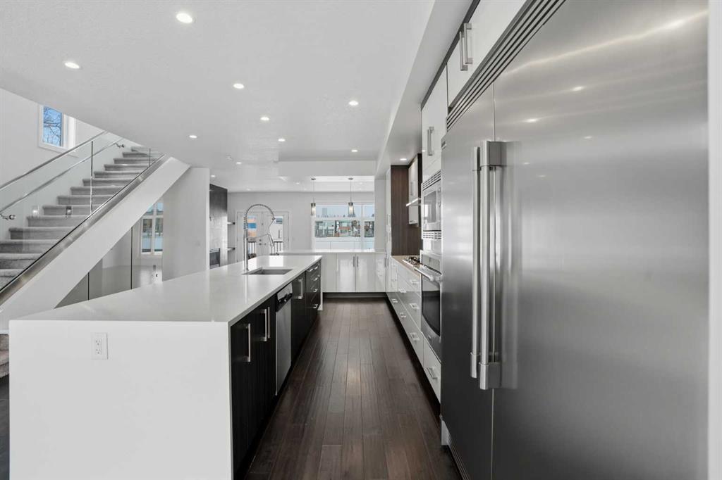 Step inside to a bright, open concept main floor flooded with natural light. The front dining area is perfect for hosting and opens to a sunny balcony, creating an effortless indoor outdoor flow. At the centre of the home, the gourmet kitchen impresses with stainless steel appliances, a gas cooktop, built in oven and microwave, two tone cabinetry, and a large quartz island that invites casual meals and lively gatherings. Sleek glass railings and clean modern finishes elevate the space throughout.