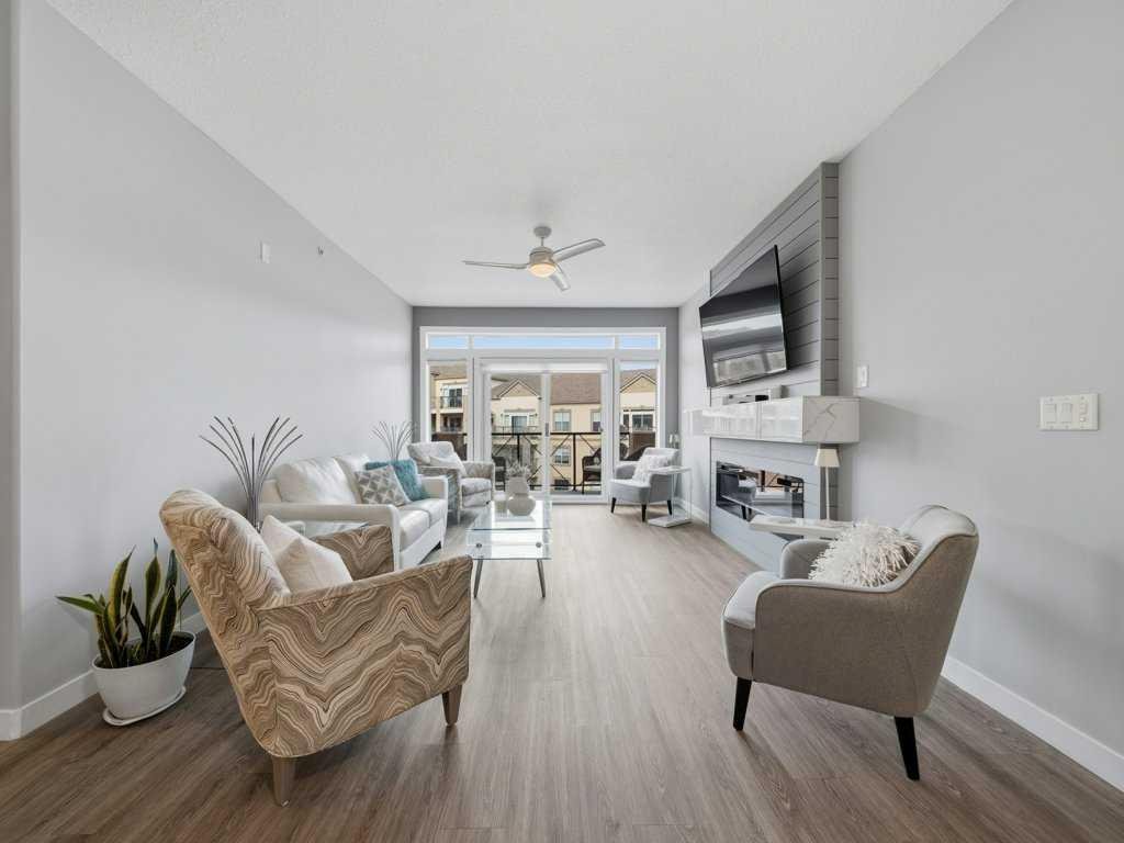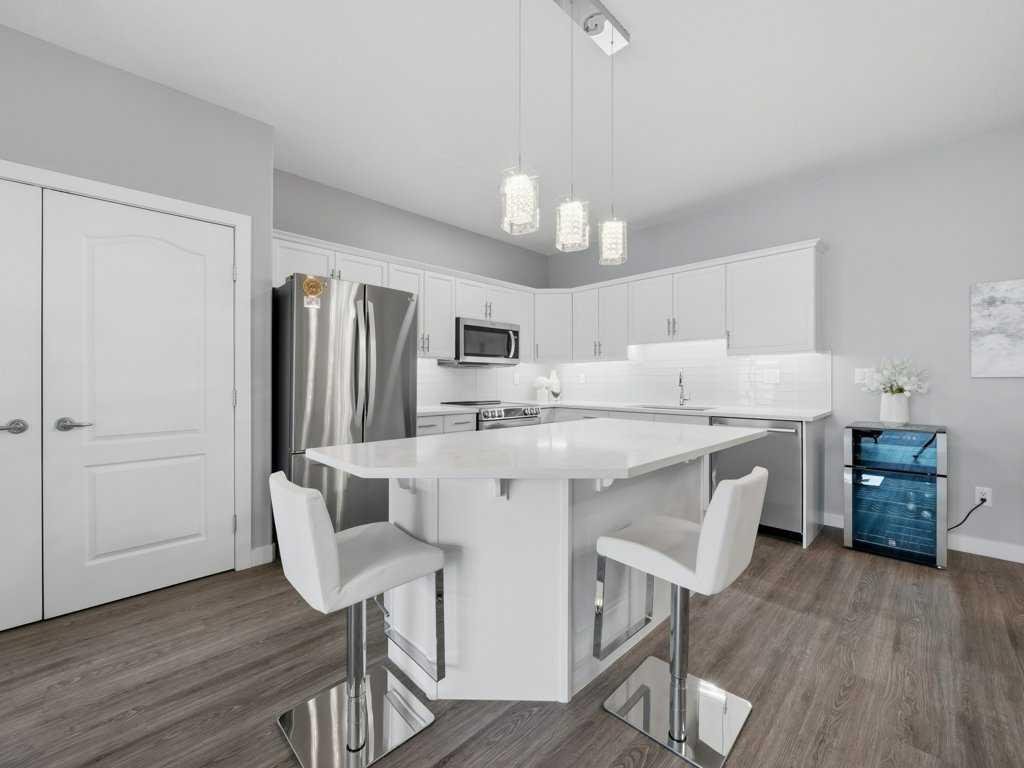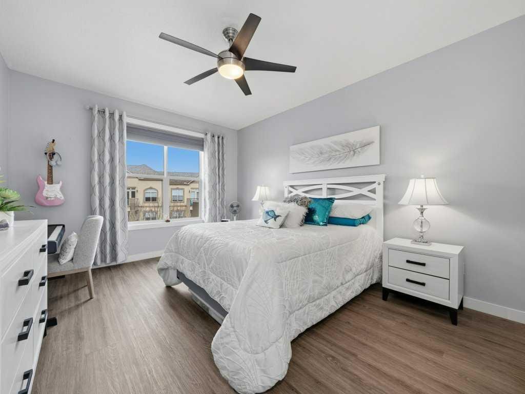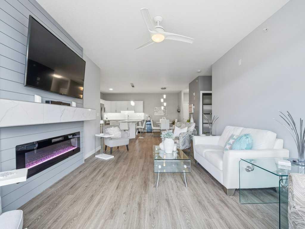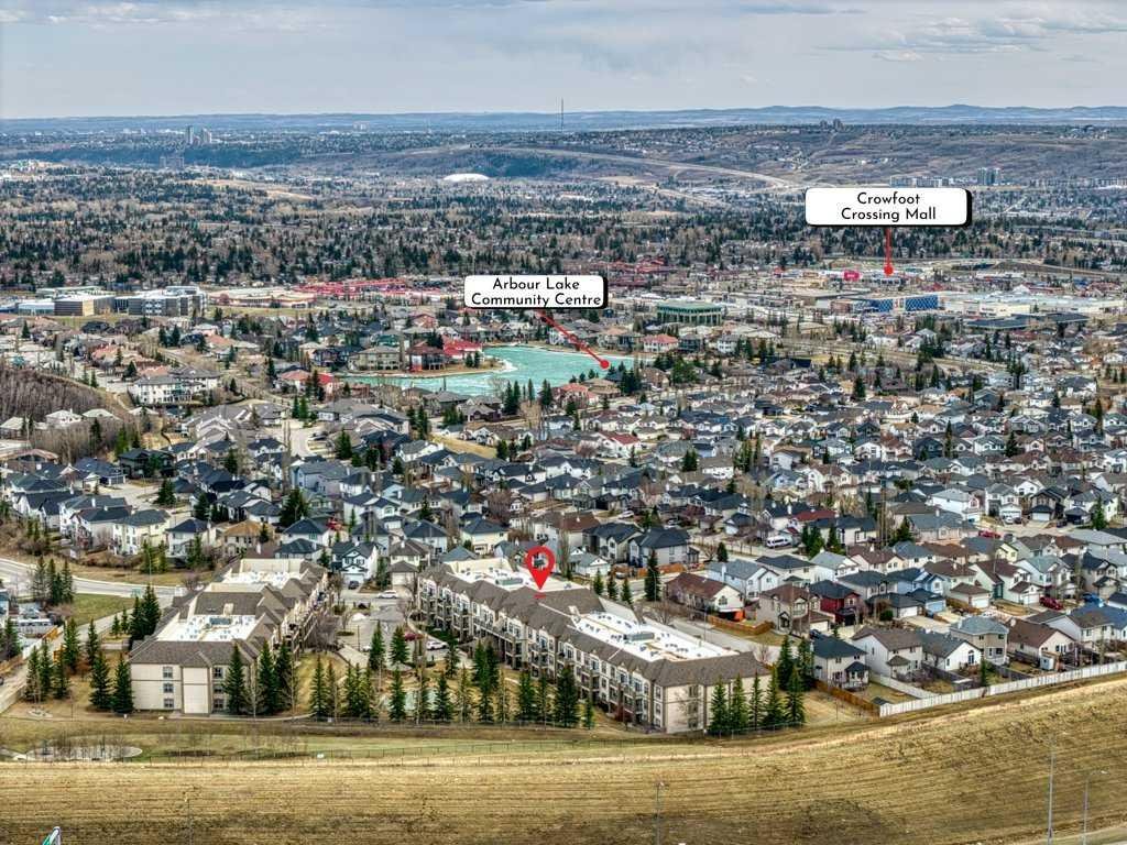 Welcome to this beautifully updated 2 bedroom, 2 bathroom condo in the sought after Chateaux at Arbour Lake, an 18+ adult complex known for its quiet setting, well maintained grounds, and strong sense of community. This top floor unit offers just over 1,130 sq ft with a functional, open layout and 9’ ceilings that create a bright, comfortable living space. The kitchen has been extensively updated with painted cabinetry, quartz countertops, a new backsplash, granite sink, and newer fridge and stove, all centered around a large island with plenty of prep and storage space. The living and dining areas flow seamlessly together and are anchored by a modern electric fireplace with a custom built mantle and surround, creating a clean, contemporary focal point, with direct access to a private balcony with views toward the landscaped courtyard, pond and fountain. The primary bedroom is generously sized and features a walk-through closet and 4 piece ensuite, while the second bedroom is well positioned for guests or a home office and sits next to a 3 piece bathroom. Additional upgrades include vinyl plank flooring throughout, new baseboards and trim, all new light fixtures, updated toilets, new closet doors, and fresh paint completed in 2022, giving the unit a clean, move-in ready feel. In-suite laundry and a dedicated storage room add to the overall functionality. This unit also includes titled underground heated parking, with storage cage, and access to a convenient car wash bay. Residents of the Chateaux enjoy a range of amenities including a fitness room, recreation and games room, and a private outdoor park space with gazebo, all just minutes to Crowfoot shopping, LRT access, and the lake amenities that make Arbour Lake one of Calgary’s most desirable communities.