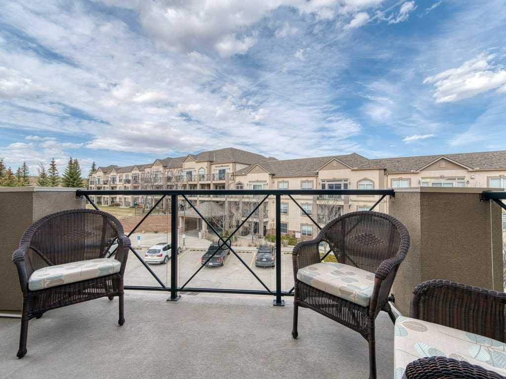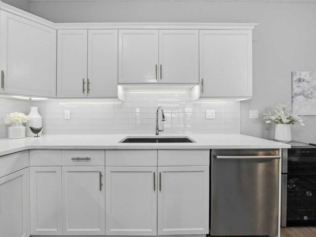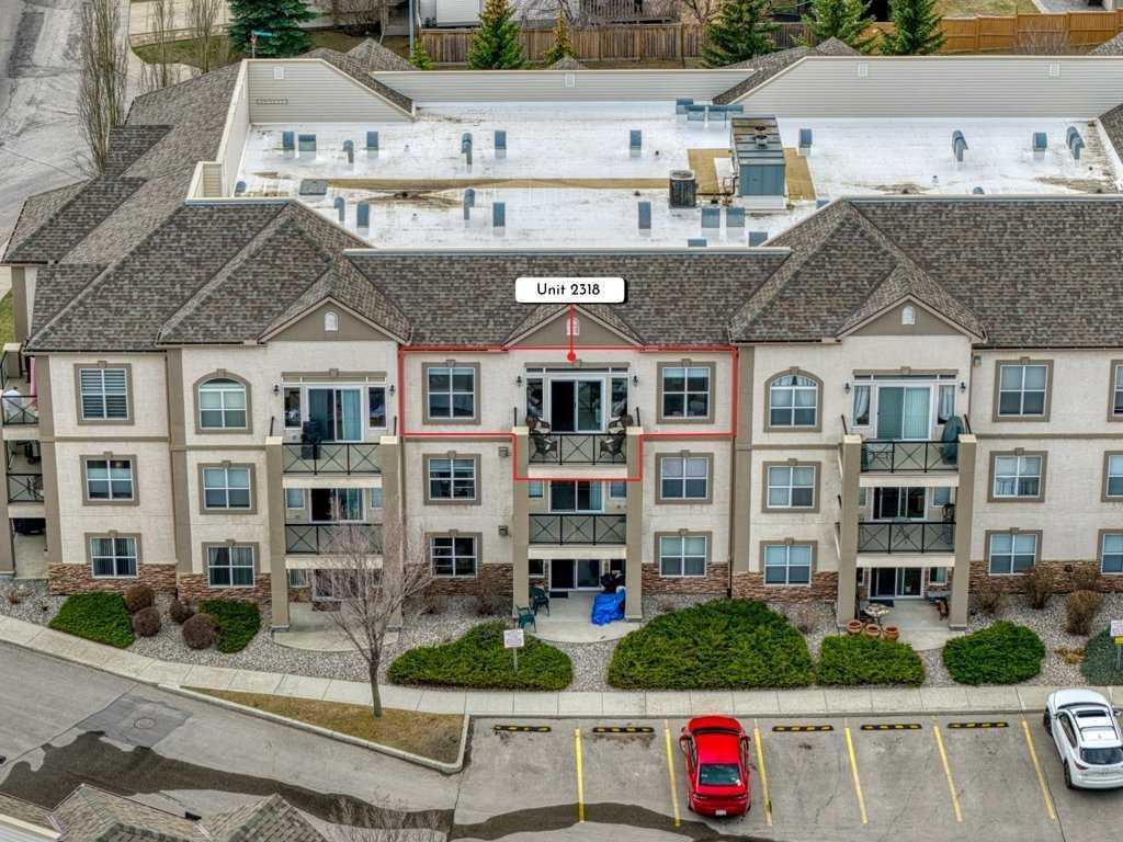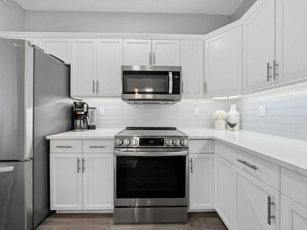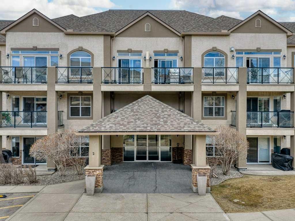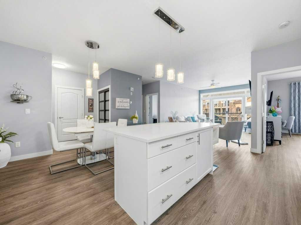 Welcome to this beautifully updated 2 bedroom, 2 bathroom condo in the sought after Chateaux at Arbour Lake, an 18+ adult complex known for its quiet setting, well maintained grounds, and strong sense of community. This top floor unit offers just over 1,130 sq ft with a functional, open layout and 9’ ceilings that create a bright, comfortable living space. The kitchen has been extensively updated with painted cabinetry, quartz countertops, a new backsplash, granite sink, and newer fridge and stove, all centered around a large island with plenty of prep and storage space. The living and dining areas flow seamlessly together and are anchored by a modern electric fireplace with a custom built mantle and surround, creating a clean, contemporary focal point, with direct access to a private balcony with views toward the landscaped courtyard, pond and fountain. The primary bedroom is generously sized and features a walk-through closet and 4 piece ensuite, while the second bedroom is well positioned for guests or a home office and sits next to a 3 piece bathroom. Additional upgrades include vinyl plank flooring throughout, new baseboards and trim, all new light fixtures, updated toilets, new closet doors, and fresh paint completed in 2022, giving the unit a clean, move-in ready feel. In-suite laundry and a dedicated storage room add to the overall functionality. This unit also includes titled underground heated parking, with storage cage, and access to a convenient car wash bay. Residents of the Chateaux enjoy a range of amenities including a fitness room, recreation and games room, and a private outdoor park space with gazebo, all just minutes to Crowfoot shopping, LRT access, and the lake amenities that make Arbour Lake one of Calgary’s most desirable communities.