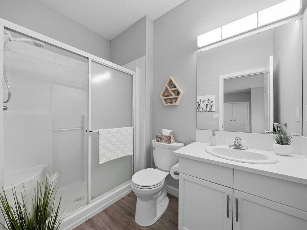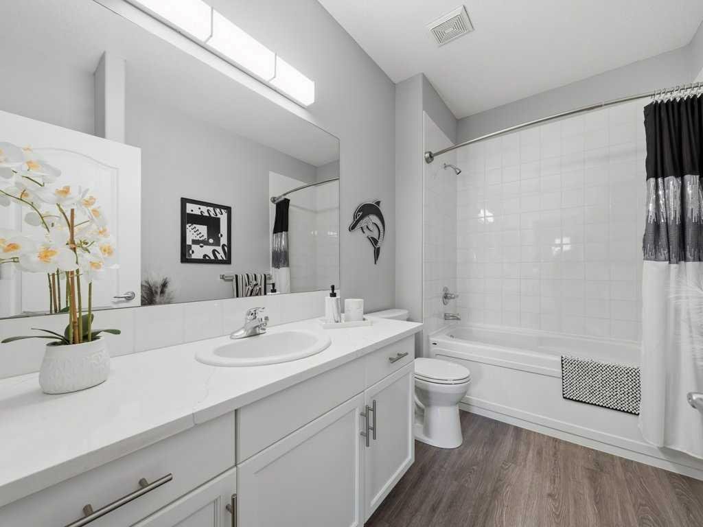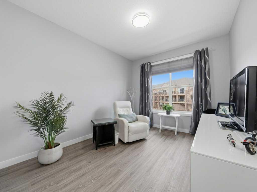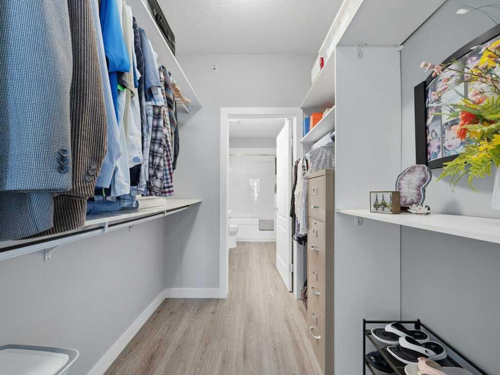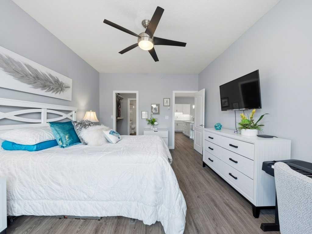 Welcome to this beautifully updated 2 bedroom, 2 bathroom condo in the sought after Chateaux at Arbour Lake, an 18+ adult complex known for its quiet setting, well maintained grounds, and strong sense of community. This top floor unit offers just over 1,130 sq ft with a functional, open layout and 9’ ceilings that create a bright, comfortable living space. The kitchen has been extensively updated with painted cabinetry, quartz countertops, a new backsplash, granite sink, and newer fridge and stove, all centered around a large island with plenty of prep and storage space. The living and dining areas flow seamlessly together and are anchored by a modern electric fireplace with a custom built mantle and surround, creating a clean, contemporary focal point, with direct access to a private balcony with views toward the landscaped courtyard, pond and fountain. The primary bedroom is generously sized and features a walk-through closet and 4 piece ensuite, while the second bedroom is well positioned for guests or a home office and sits next to a 3 piece bathroom. Additional upgrades include vinyl plank flooring throughout, new baseboards and trim, all new light fixtures, updated toilets, new closet doors, and fresh paint completed in 2022, giving the unit a clean, move-in ready feel. In-suite laundry and a dedicated storage room add to the overall functionality. This unit also includes titled underground heated parking, with storage cage, and access to a convenient car wash bay. Residents of the Chateaux enjoy a range of amenities including a fitness room, recreation and games room, and a private outdoor park space with gazebo, all just minutes to Crowfoot shopping, LRT access, and the lake amenities that make Arbour Lake one of Calgary’s most desirable communities.