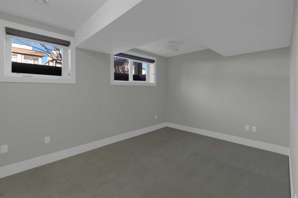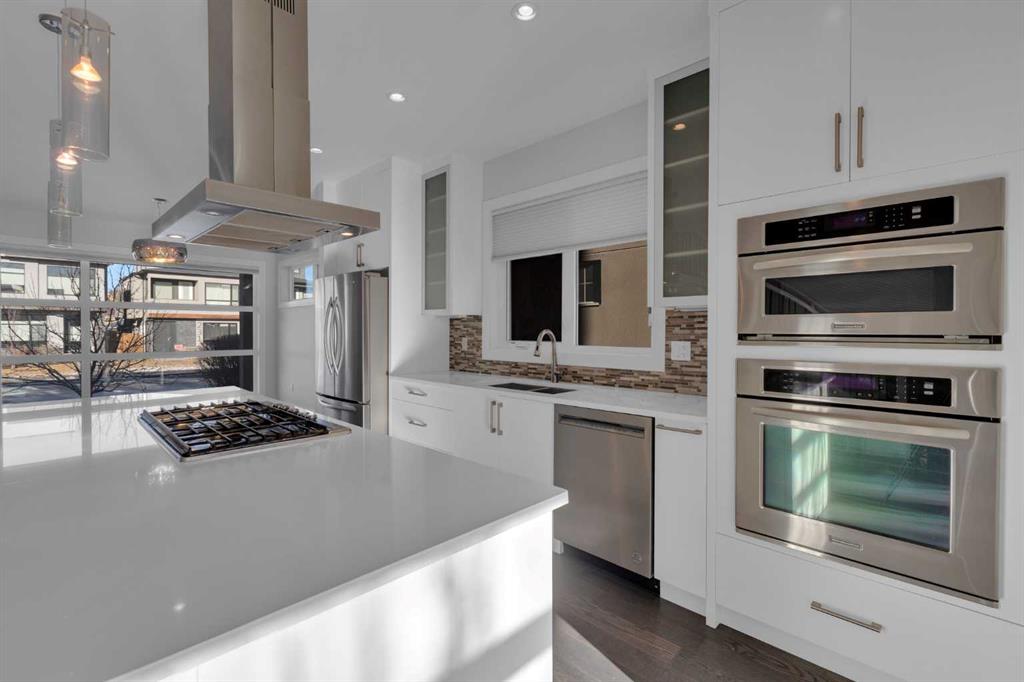 Welcome to Richmond/Knob Hill! This beautifully finished home offers 4 bedrooms, 3.5 bathrooms, a thoughtful layout, and a fully developed basement—truly a standout property. The bright, open-concept main floor features 9-foot ceilings, hardwood floors, and oversized windows that fill the space with natural light. The tiled front entry includes a spacious closet with French doors and custom organizers (no wire shelving in this house!), leading into a generous living room perfect for entertaining or settling in for a movie night. The chef-inspired kitchen boasts quartz countertops, a large island, ceiling-height cabinetry, a gas cooktop, built-in wall oven and microwave, and a pantry with custom shelving. It flows seamlessly into the dining area, which comfortably seats eight and is anchored by a gas fireplace with built-ins and a south-facing window. A discreetly positioned 2-piece powder room and a mud room with French door closet and additional built-ins complete the main level. Upstairs, an extra-wide staircase and skylight create an inviting transition to the second floor, where you’ll find 9-foot ceilings and an ideal layout. The private primary suite overlooks the backyard and includes a spacious 5-piece ensuite with dual vanities, a deep soaker tub, an oversized shower, and a dreamy walk-in closet with extensive built-ins. Two additional large bedrooms sit at the opposite end of the home, each with built-in closets, large windows, and a shared balcony complete with soffit lighting. A 4-piece bathroom with quartz countertop and a dedicated laundry room with soft-close cabinetry complete this level. The basement feels anything but below-grade, thanks to large windows and cozy in-floor heat. The rec room offers a great space for family time and includes a well-appointed wet bar. A fourth bedroom with two windows and a huge walk-in closet sits next to a full 4-piece bathroom. Additional highlights include a linen closet, ample storage, and an exceptionally tidy utility room. Outside, the sunny south facing backyard features a lovely deck and leads to a detached double garage (insulated and drywalled). *BONUS – central vac rough-in, sump pump, freshly painted, professionally cleaned and move-in ready!