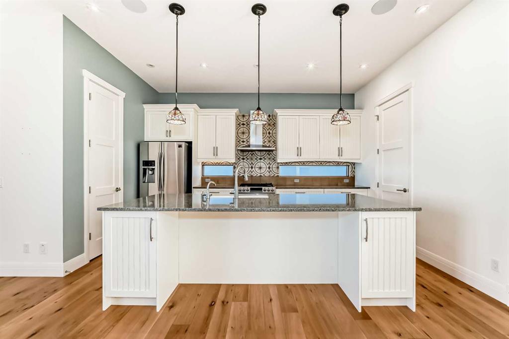 The main floor delivers an effortless flow with a wide open layout, ideal for both grand entertaining and refined daily living. Highlights include wide-plank hardwood flooring, a formal front living room with a stunning stone fireplace, a dedicated dining area with custom lighting, and elegant custom doors that open onto the deck. The chef’s kitchen is equipped with stainless steel appliances, granite countertops, an oversized island with a breakfast bar, and a walk-in pantry.