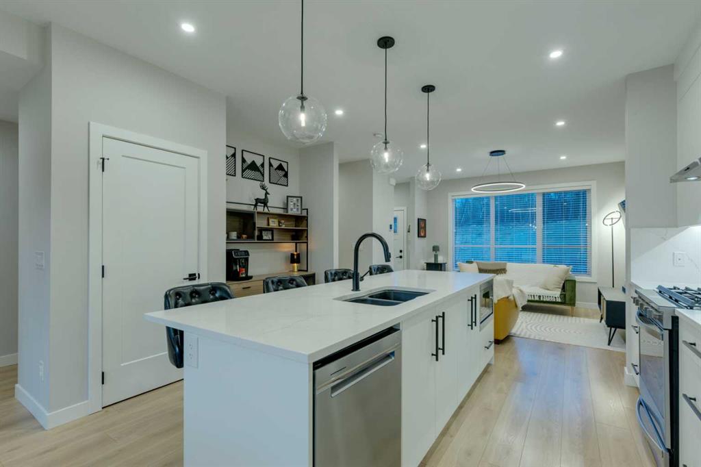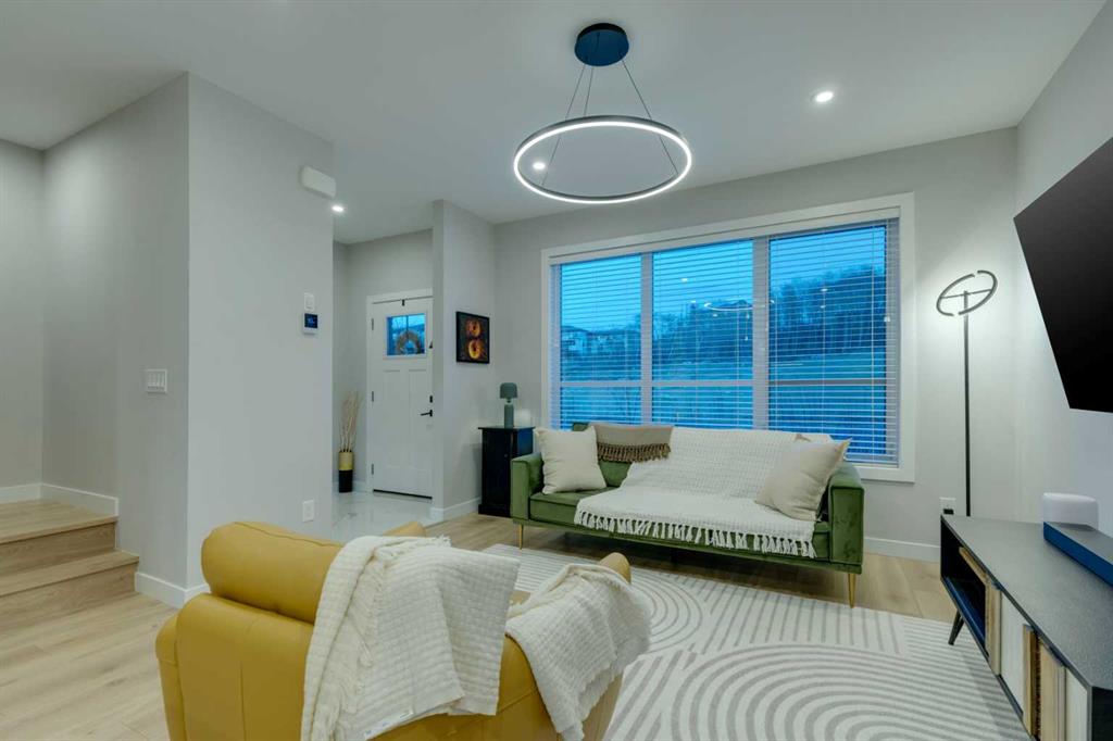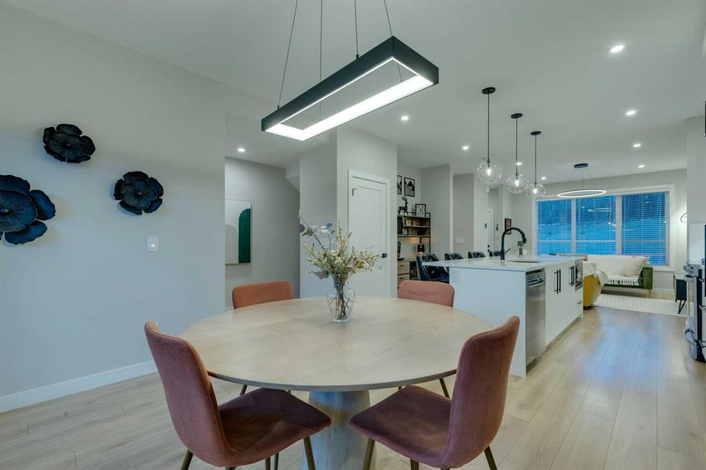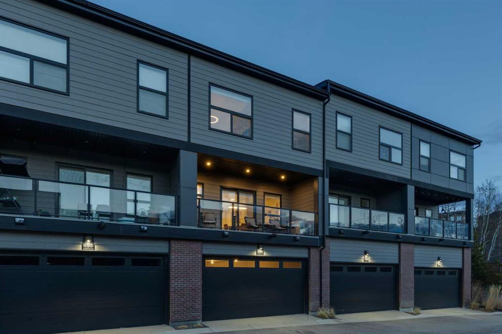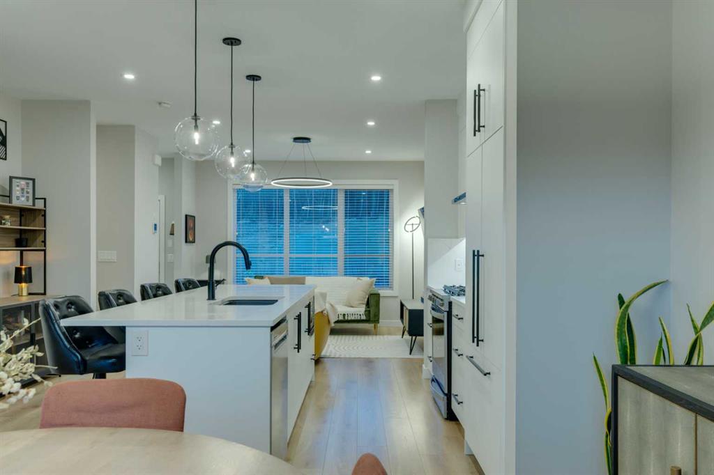 This beautifully designed 3-bedroom townhome blends modern style with warm, boho-inspired touches throughout. The focal brick facade leads to the welcoming entry with a bright foyer, mirrored closet, and clean white tile, before opening into a spacious main floor with soft, light luxury hardwood laminate flooring and sleek black accents. 9ft flat panel ceilings with recessed led lighting allow for ample front to back natural light. The living room sits to the left, while the central kitchen offers white cabinetry, under-cabinet lighting, a long flush top granite island with seating for four, a black modern sink, pendant lighting, gas range, and a built-in panelled fridge for a seamless designer look. To the right, the dining area features contemporary LED lighting and patio doors leading to a balcony with stunning sunset skies and a peaceful treed view to the side. A discrete, stylish half bath finishes the main level and provides lower access to the double width, TRIPLE attached garage(tandem depth on one side). Upstairs, the primary bedroom captures beautiful light and mountain views above the rooftops, with a gorgeous tray ceiling, a walk-in closet and a modern ensuite featuring white finishes, black fixtures, and a fully tiled walk-in shower. Two additional bedrooms with peaked ceilings & full windows offer versatility, including a charming nursery with a soft woodland mural, and the other with a flexible Murphy bed, all centered with a lovely 4-piece bathroom, upper laundry, and space in the hallway for an accent table or open tech area. Offering central A/C, an incredible accessible location near the C-Train station(s), and many desirable schools nearby, along with the excellent premier shops in Aspen Landing, this home offers enduring value and ideal location. With its thoughtful design, absolutely immaculate condition, and twilight views that make every evening feel special, this home delivers a perfect blend of comfort, style, and convenience. Even convenient shopping is nearby. This like-new townhome offers a fresh, modern lifestyle with a welcoming sense of personality from the moment you step through the front door. Offered in pristine move-in ready condition with flexible possession. Welcome home!