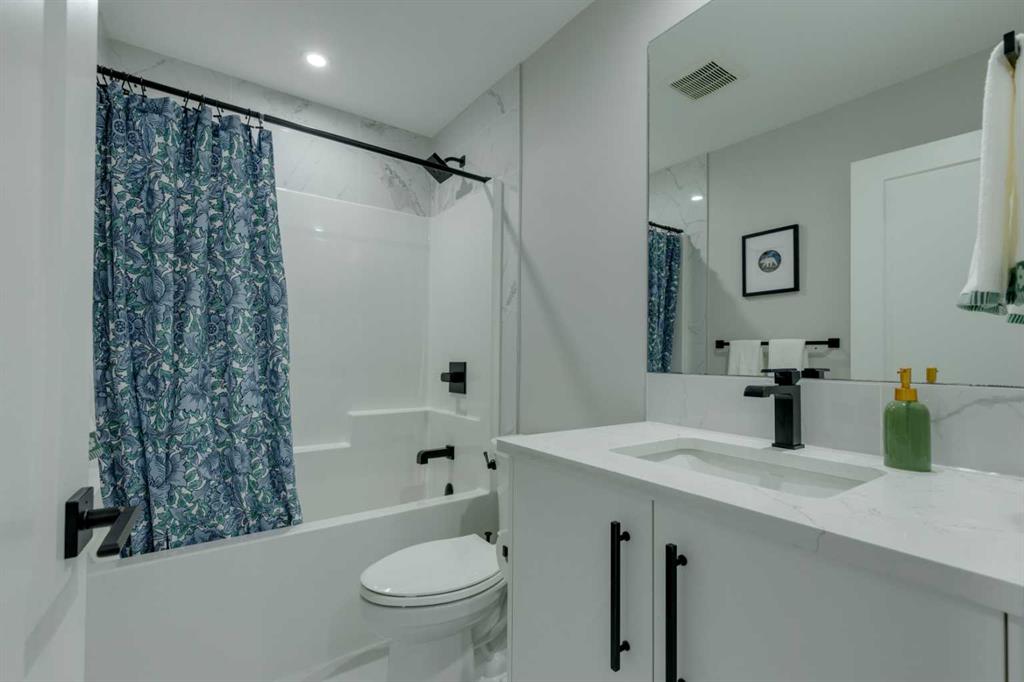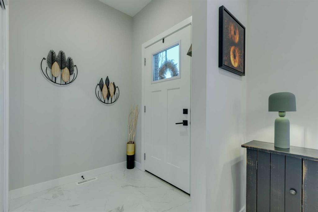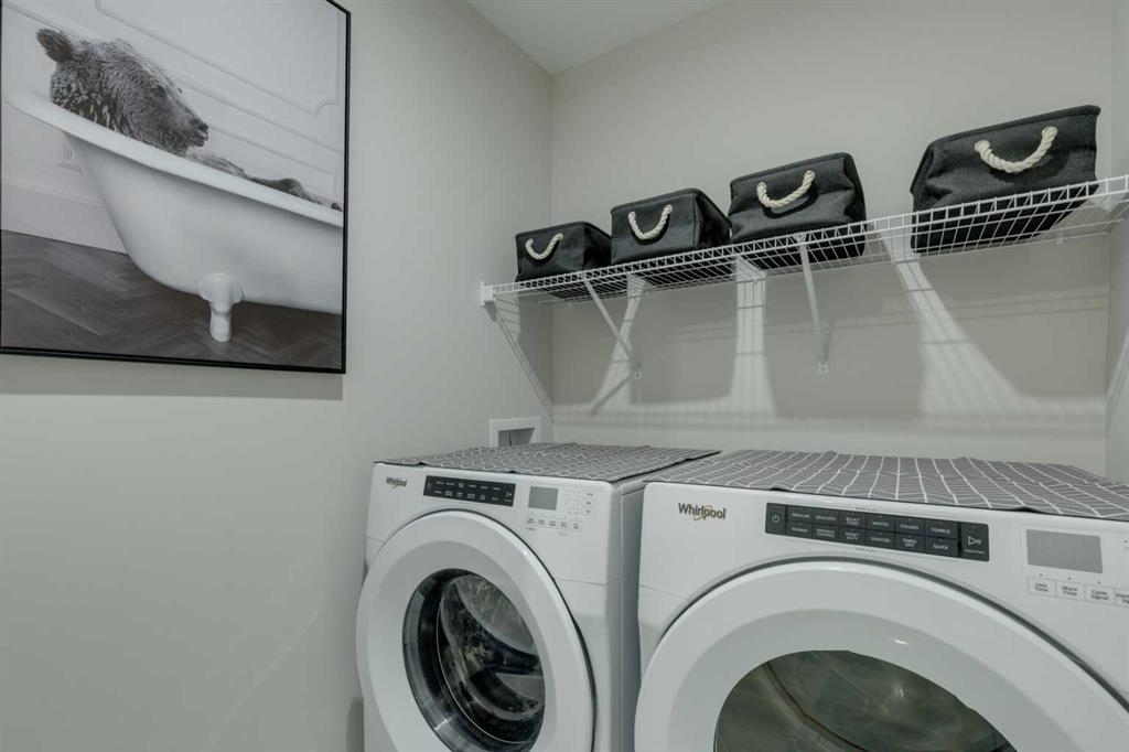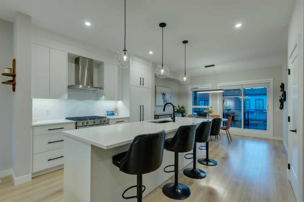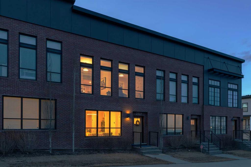 This beautifully designed 3-bedroom townhome blends modern style with warm, boho-inspired touches throughout. The focal brick facade leads to the welcoming entry with a bright foyer, mirrored closet, and clean white tile, before opening into a spacious main floor with soft, light luxury hardwood laminate flooring and sleek black accents. 9ft flat panel ceilings with recessed led lighting allow for ample front to back natural light. The living room sits to the left, while the central kitchen offers white cabinetry, under-cabinet lighting, a long flush top granite island with seating for four, a black modern sink, pendant lighting, gas range, and a built-in panelled fridge for a seamless designer look. To the right, the dining area features contemporary LED lighting and patio doors leading to a balcony with stunning sunset skies and a peaceful treed view to the side. A discrete, stylish half bath finishes the main level and provides lower access to the double width, TRIPLE attached garage(tandem depth on one side). Upstairs, the primary bedroom captures beautiful light and mountain views above the rooftops, with a gorgeous tray ceiling, a walk-in closet and a modern ensuite featuring white finishes, black fixtures, and a fully tiled walk-in shower. Two additional bedrooms with peaked ceilings & full windows offer versatility, including a charming nursery with a soft woodland mural, and the other with a flexible Murphy bed, all centered with a lovely 4-piece bathroom, upper laundry, and space in the hallway for an accent table or open tech area. Offering central A/C, an incredible accessible location near the C-Train station(s), and many desirable schools nearby, along with the excellent premier shops in Aspen Landing, this home offers enduring value and ideal location. With its thoughtful design, absolutely immaculate condition, and twilight views that make every evening feel special, this home delivers a perfect blend of comfort, style, and convenience. Even convenient shopping is nearby. This like-new townhome offers a fresh, modern lifestyle with a welcoming sense of personality from the moment you step through the front door. Offered in pristine move-in ready condition with flexible possession. Welcome home!