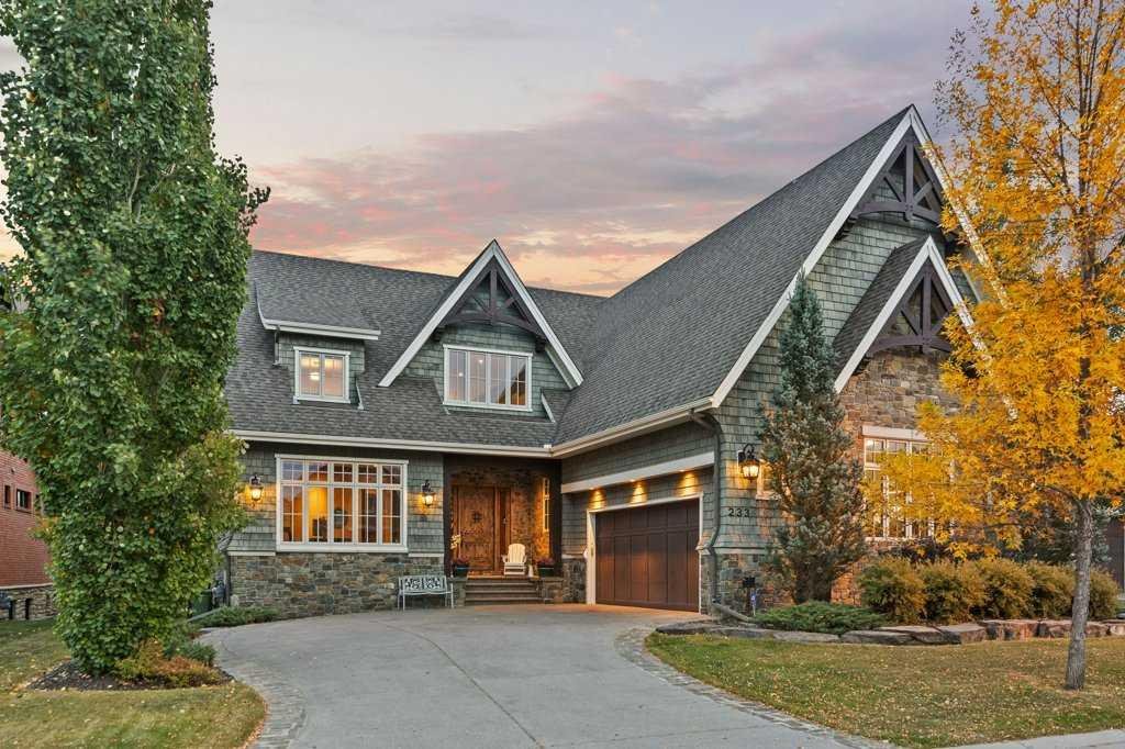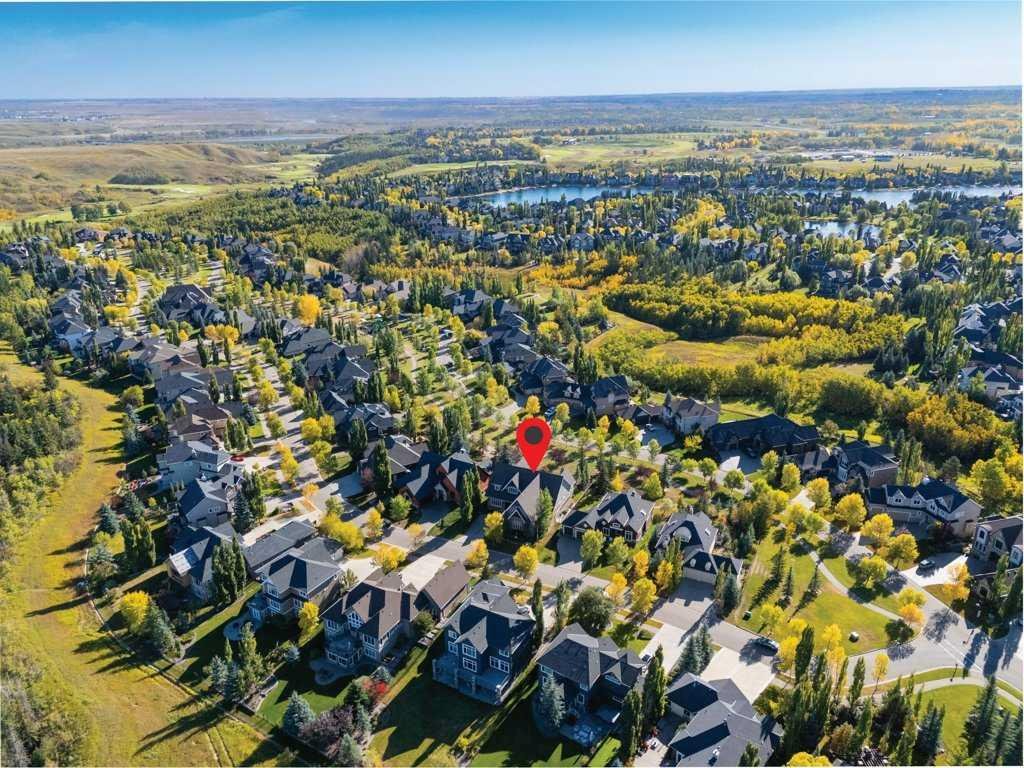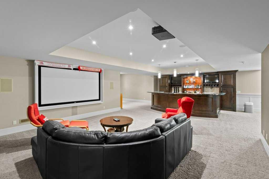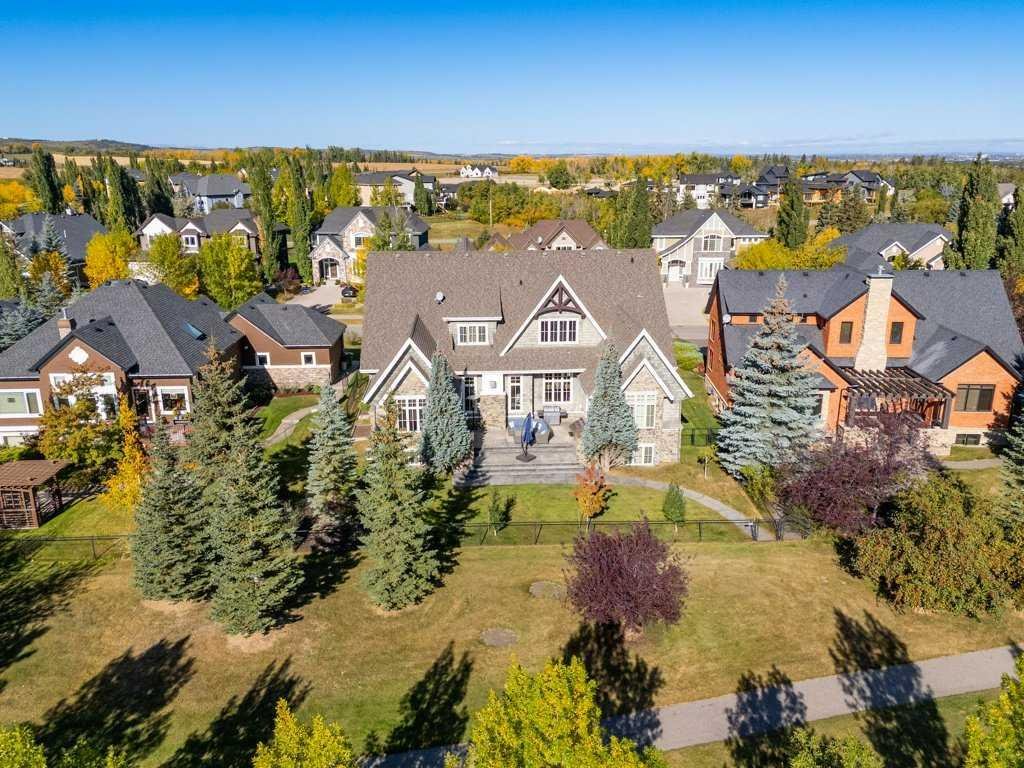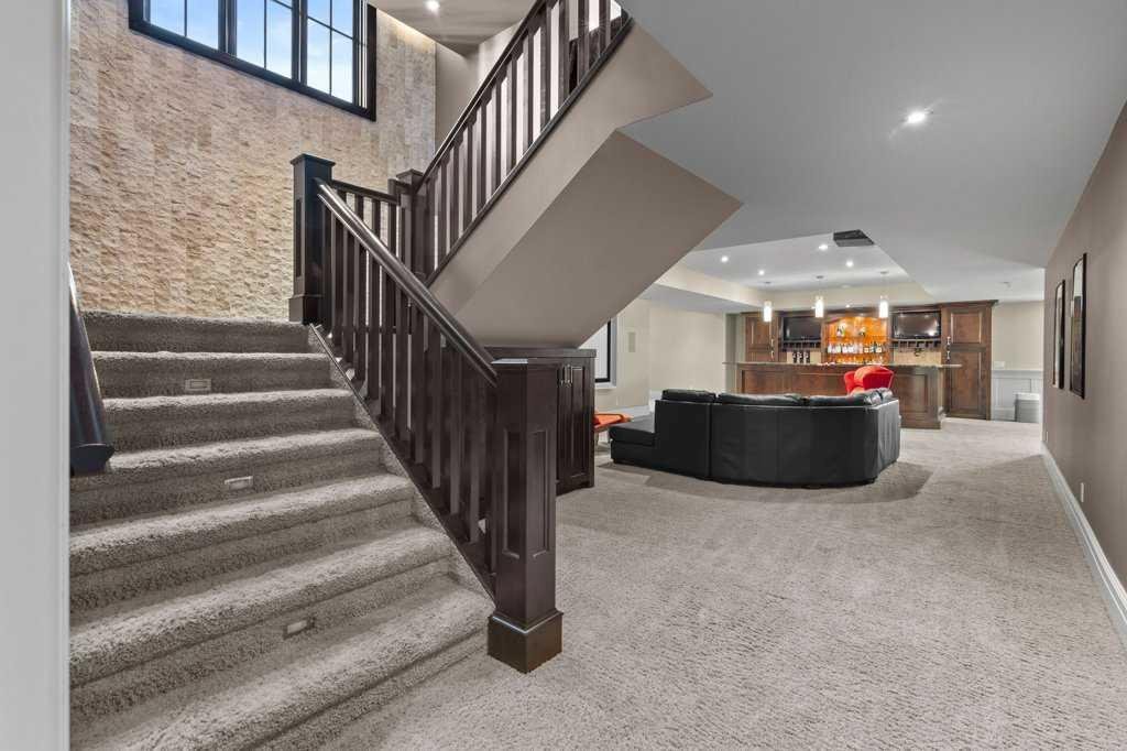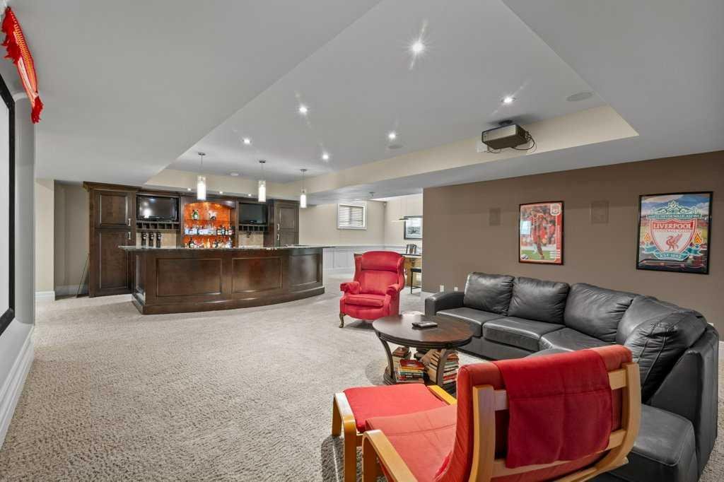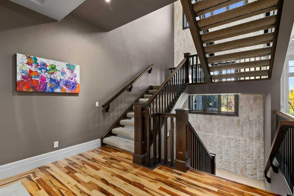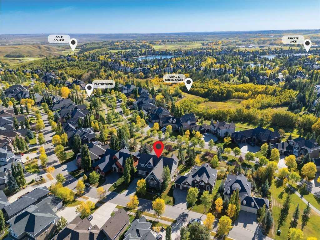 A Fabulous Family Home of architectural significance & exceptional quality, offering over 5,000 sq. ft. in the prestigious community of Heritage Pointe. From the moment you arrive, this residence makes a striking impression with its timber-accented exterior, cedar shakes, stone detailing, and solid wood front door. The double stamped concrete driveway, quad heated garage with epoxy floors, and professionally landscaped yard set the stage for what’s inside. Step into a grand gallery style foyer with limestone inlaid floors, drawing your eye to the open staircase framed by a two-storey stone feature wall. The coffered ceiling in the great room and polished stone fireplace create a warm, luxurious atmosphere that flows seamlessly into the heart of the home. The custom two-tone kitchen is a true showpiece, showcasing stacked light boxes, Sub-Zero and Wolf appliances, exotic stone countertops, and ambient lighting that elevates the overall elegance. The adjoining dining nook opens to a rear deck overlooking a park-like yard — ideal for entertaining or quiet family moments. The main-level primary suite is a serene retreat with doors to the backyard and a spa-inspired ensuite featuring a steam shower, soaker tub, and dual vanities, all finished in refined materials. A private den with rich custom millwork provides an elegant workspace, while the oversized mudroom and laundry area offer everyday convenience with direct garage access. Upstairs, two additional bedrooms, a full bath with dual sinks, and a spacious bonus room provide comfort and versatility. The fully developed lower level is designed for recreation and relaxation, featuring a fourth bedroom and full bath, fitness studio, walk-behind bar, games and rec area, and a projection theatre room perfect for family movie nights. This exceptional home is also equipped with Control4 Smart Home Automation,. Ideally located just steps from playgrounds and green spaces, this home beautifully combines architectural artistry, luxurious finishes, and family functionality — truly a masterpiece in Heritage Pointe. Residents also enjoy year-round lake privileges including paddle boarding, fishing, beach access, pickleball courts, summer camps, community events, and scenic ravines to explore in every season.