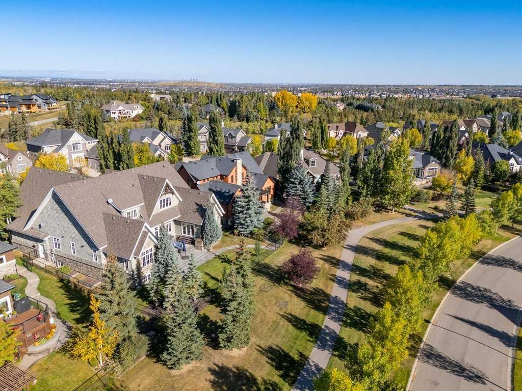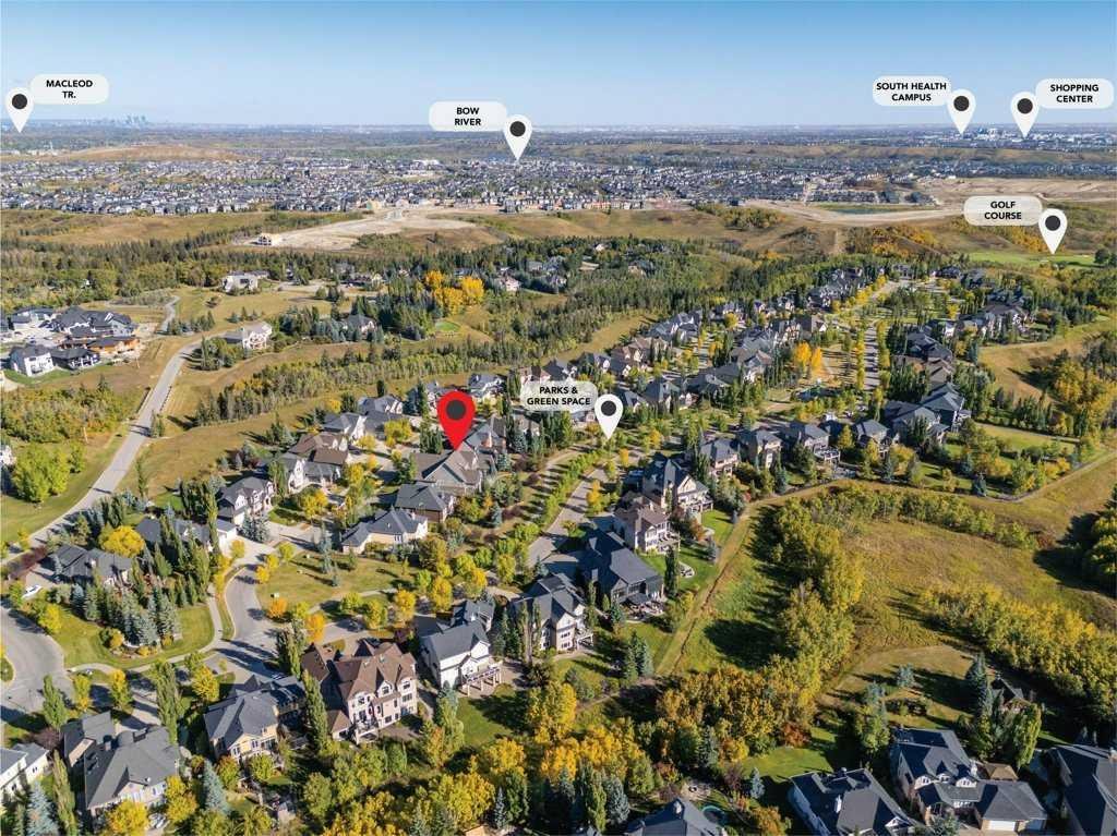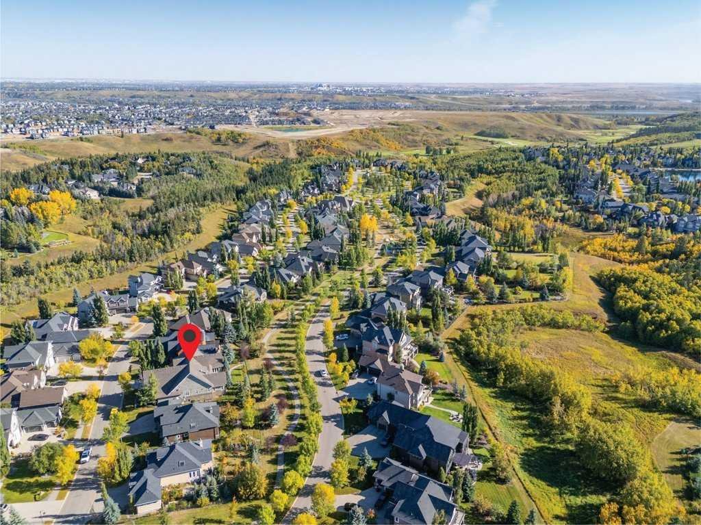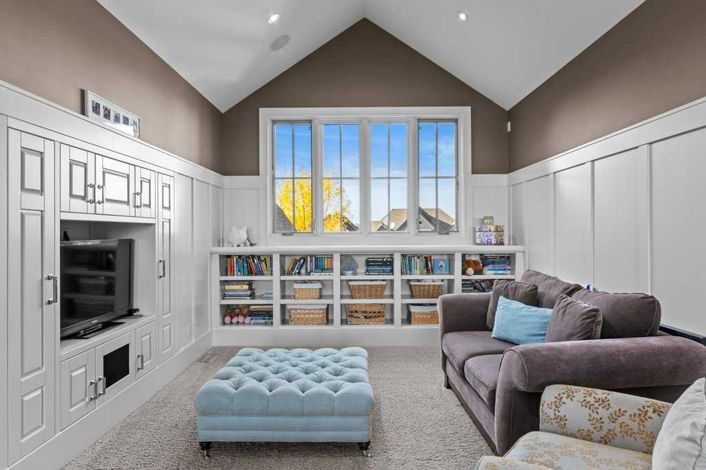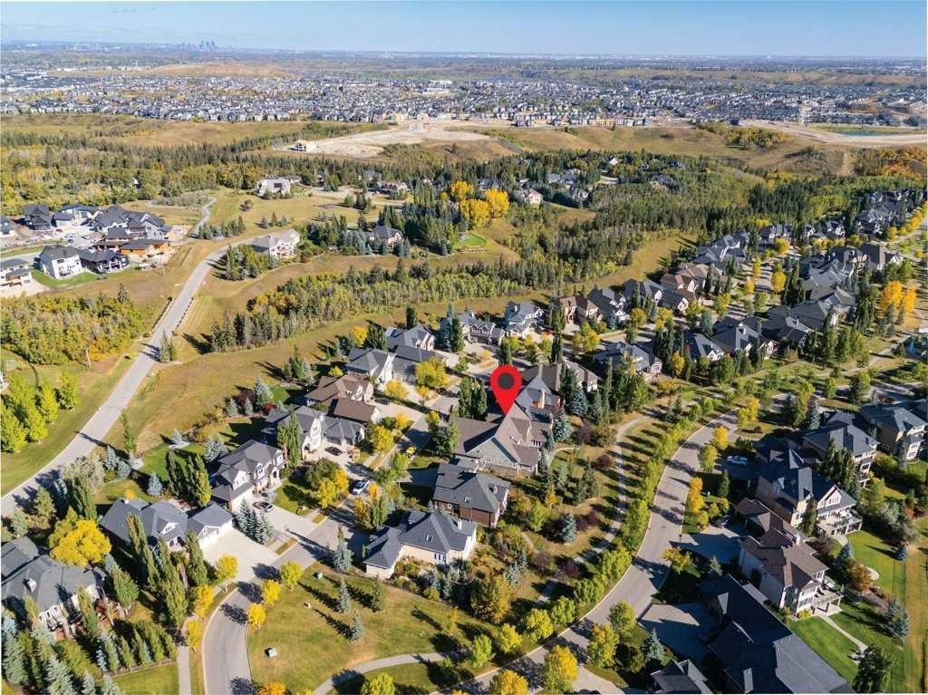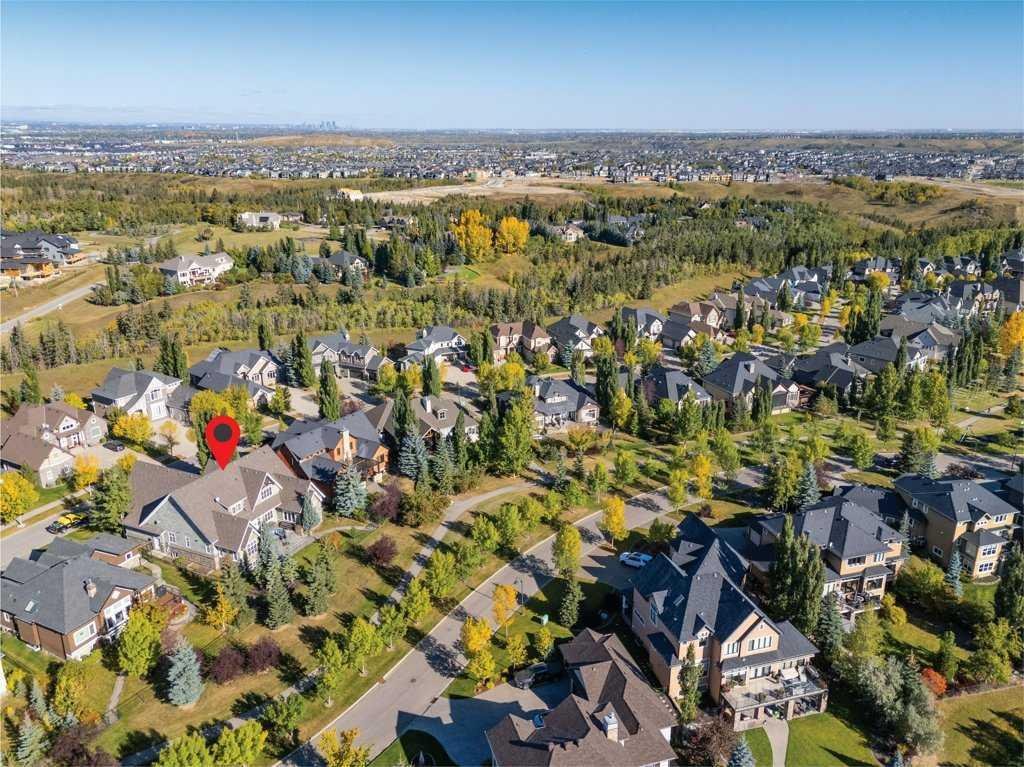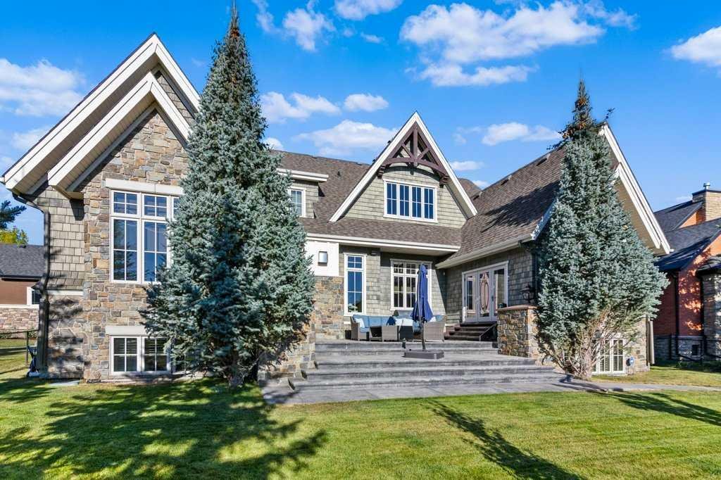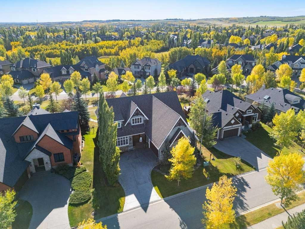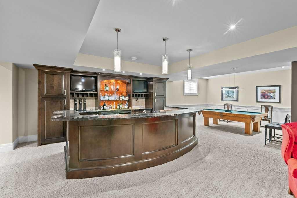 A Fabulous Family Home of architectural significance & exceptional quality, offering over 5,000 sq. ft. in the prestigious community of Heritage Pointe. From the moment you arrive, this residence makes a striking impression with its timber-accented exterior, cedar shakes, stone detailing, and solid wood front door. The double stamped concrete driveway, quad heated garage with epoxy floors, and professionally landscaped yard set the stage for what’s inside. Step into a grand gallery style foyer with limestone inlaid floors, drawing your eye to the open staircase framed by a two-storey stone feature wall. The coffered ceiling in the great room and polished stone fireplace create a warm, luxurious atmosphere that flows seamlessly into the heart of the home. The custom two-tone kitchen is a true showpiece, showcasing stacked light boxes, Sub-Zero and Wolf appliances, exotic stone countertops, and ambient lighting that elevates the overall elegance. The adjoining dining nook opens to a rear deck overlooking a park-like yard — ideal for entertaining or quiet family moments. The main-level primary suite is a serene retreat with doors to the backyard and a spa-inspired ensuite featuring a steam shower, soaker tub, and dual vanities, all finished in refined materials. A private den with rich custom millwork provides an elegant workspace, while the oversized mudroom and laundry area offer everyday convenience with direct garage access. Upstairs, two additional bedrooms, a full bath with dual sinks, and a spacious bonus room provide comfort and versatility. The fully developed lower level is designed for recreation and relaxation, featuring a fourth bedroom and full bath, fitness studio, walk-behind bar, games and rec area, and a projection theatre room perfect for family movie nights. This exceptional home is also equipped with Control4 Smart Home Automation,. Ideally located just steps from playgrounds and green spaces, this home beautifully combines architectural artistry, luxurious finishes, and family functionality — truly a masterpiece in Heritage Pointe. Residents also enjoy year-round lake privileges including paddle boarding, fishing, beach access, pickleball courts, summer camps, community events, and scenic ravines to explore in every season.