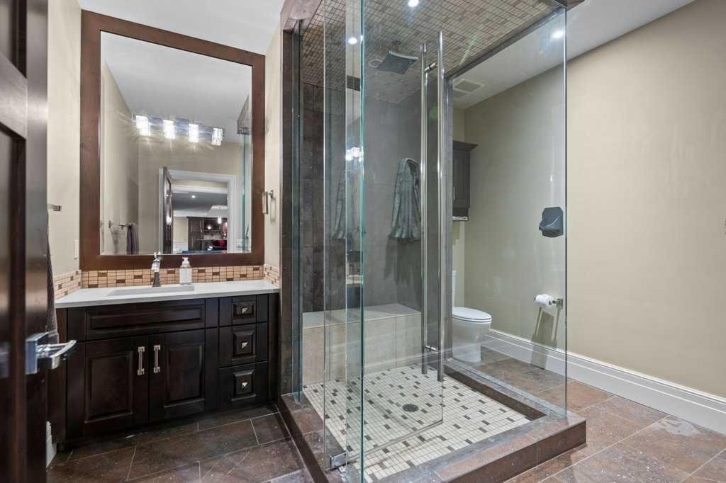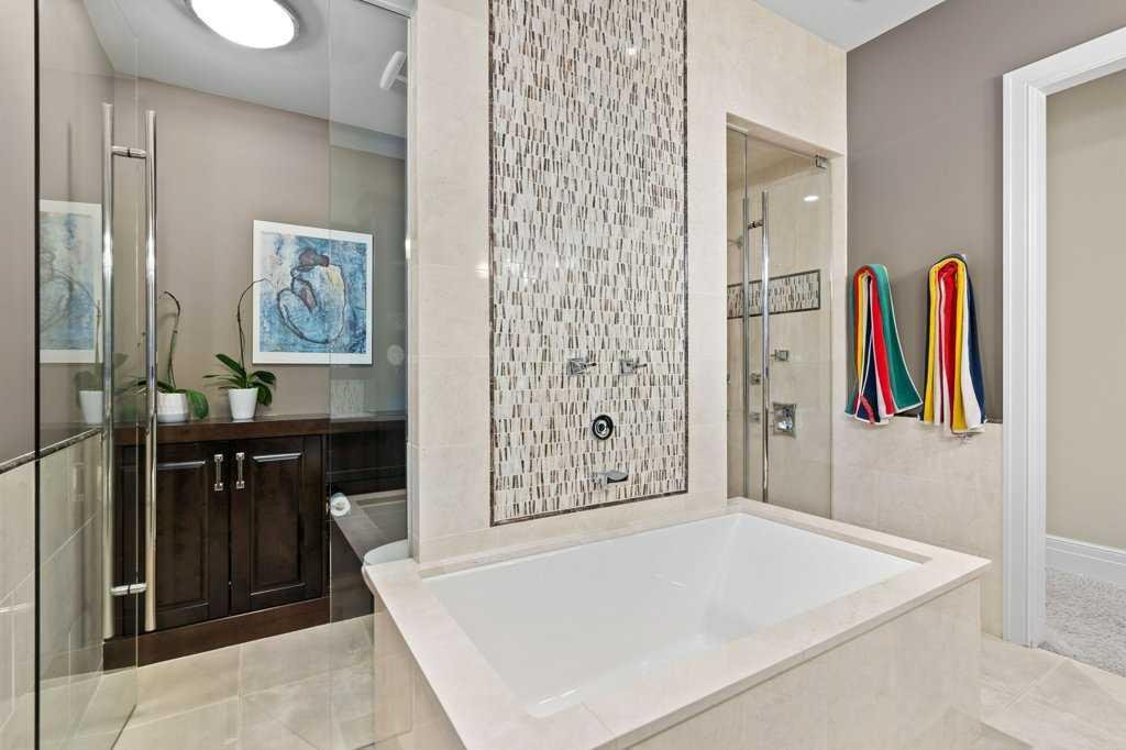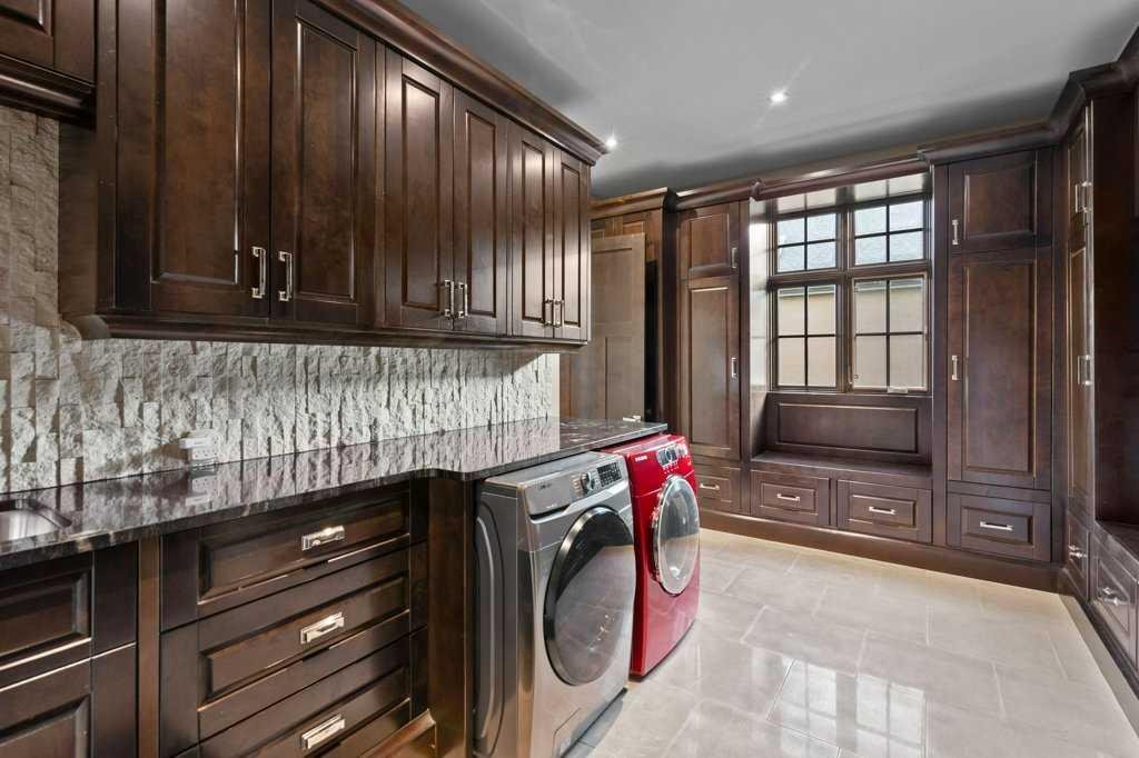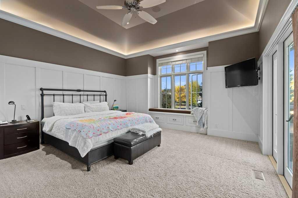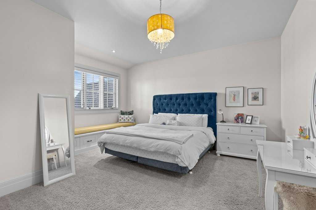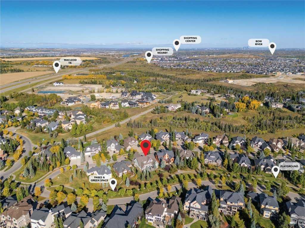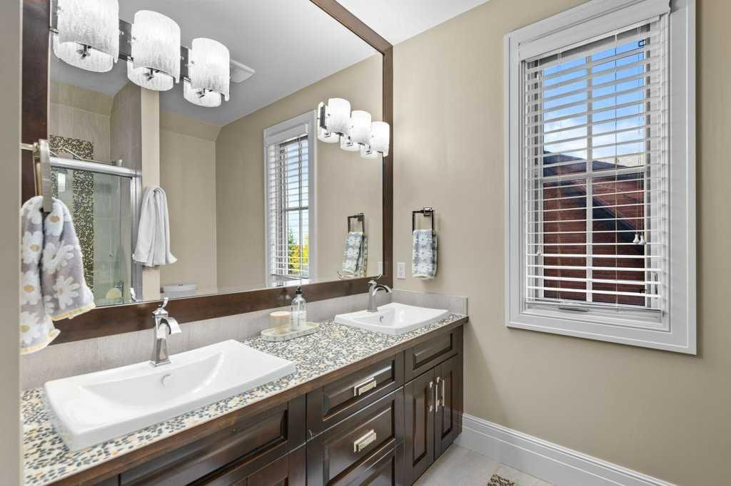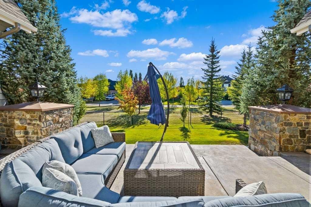 A Fabulous Family Home of architectural significance & exceptional quality, offering over 5,000 sq. ft. in the prestigious community of Heritage Pointe. From the moment you arrive, this residence makes a striking impression with its timber-accented exterior, cedar shakes, stone detailing, and solid wood front door. The double stamped concrete driveway, quad heated garage with epoxy floors, and professionally landscaped yard set the stage for what’s inside. Step into a grand gallery style foyer with limestone inlaid floors, drawing your eye to the open staircase framed by a two-storey stone feature wall. The coffered ceiling in the great room and polished stone fireplace create a warm, luxurious atmosphere that flows seamlessly into the heart of the home. The custom two-tone kitchen is a true showpiece, showcasing stacked light boxes, Sub-Zero and Wolf appliances, exotic stone countertops, and ambient lighting that elevates the overall elegance. The adjoining dining nook opens to a rear deck overlooking a park-like yard — ideal for entertaining or quiet family moments. The main-level primary suite is a serene retreat with doors to the backyard and a spa-inspired ensuite featuring a steam shower, soaker tub, and dual vanities, all finished in refined materials. A private den with rich custom millwork provides an elegant workspace, while the oversized mudroom and laundry area offer everyday convenience with direct garage access. Upstairs, two additional bedrooms, a full bath with dual sinks, and a spacious bonus room provide comfort and versatility. The fully developed lower level is designed for recreation and relaxation, featuring a fourth bedroom and full bath, fitness studio, walk-behind bar, games and rec area, and a projection theatre room perfect for family movie nights. This exceptional home is also equipped with Control4 Smart Home Automation,. Ideally located just steps from playgrounds and green spaces, this home beautifully combines architectural artistry, luxurious finishes, and family functionality — truly a masterpiece in Heritage Pointe. Residents also enjoy year-round lake privileges including paddle boarding, fishing, beach access, pickleball courts, summer camps, community events, and scenic ravines to explore in every season.