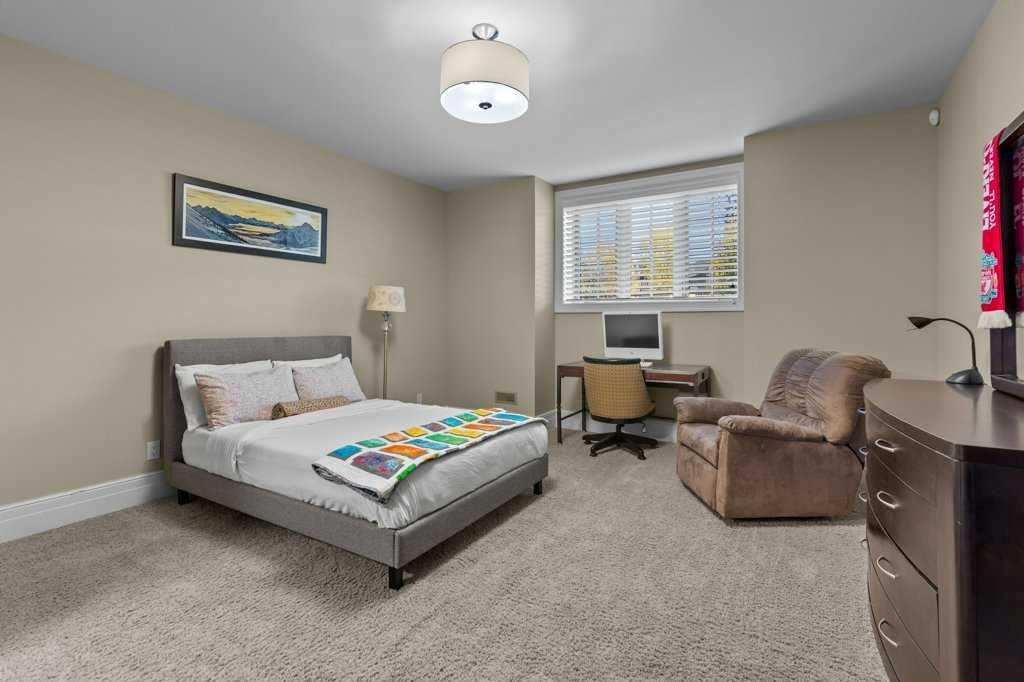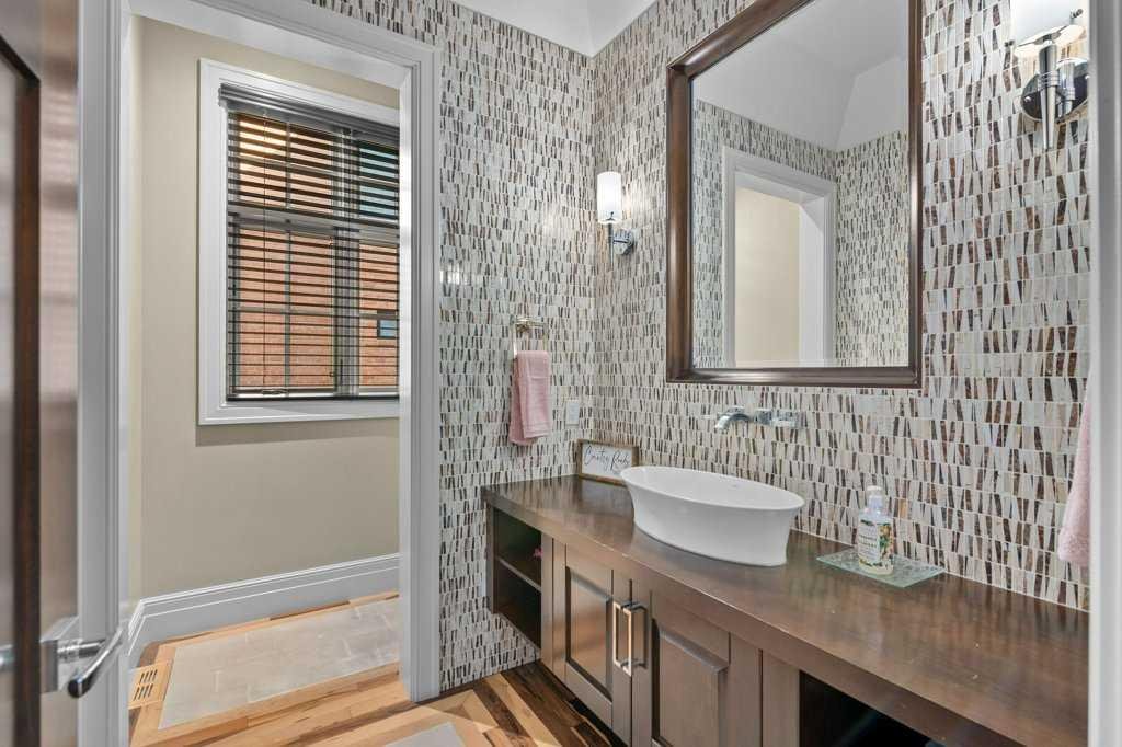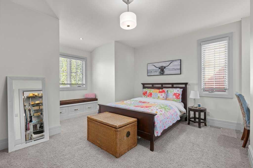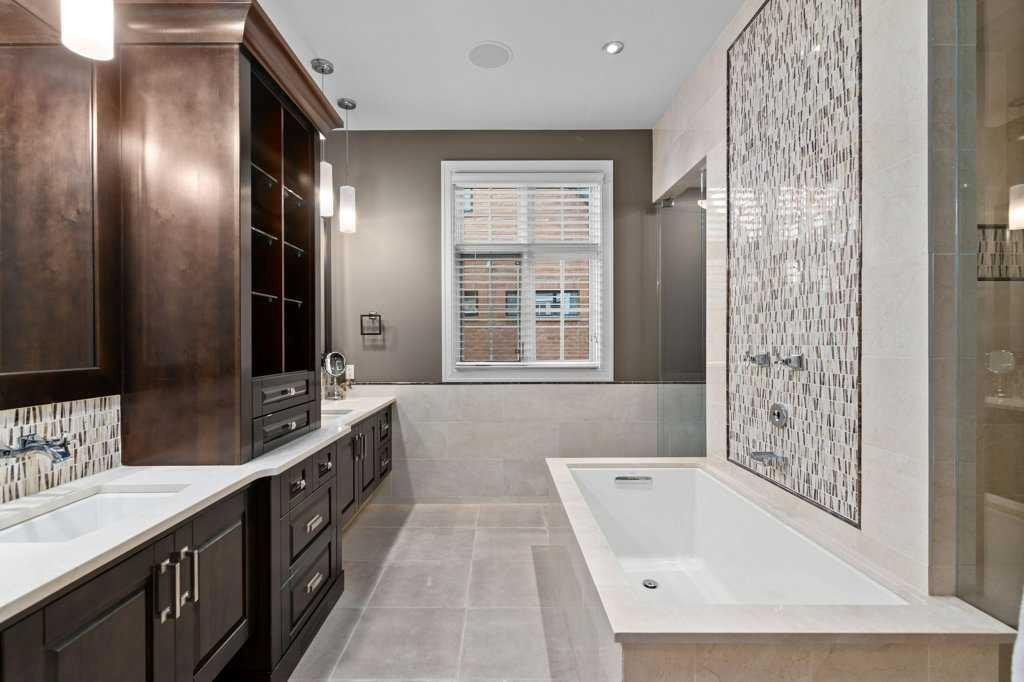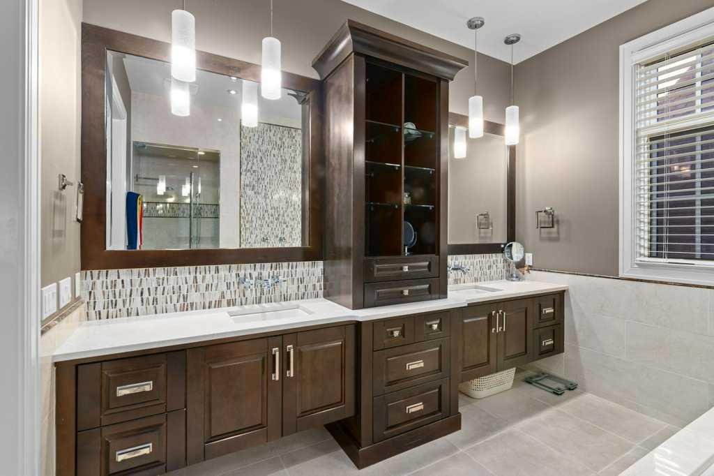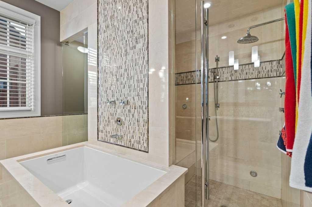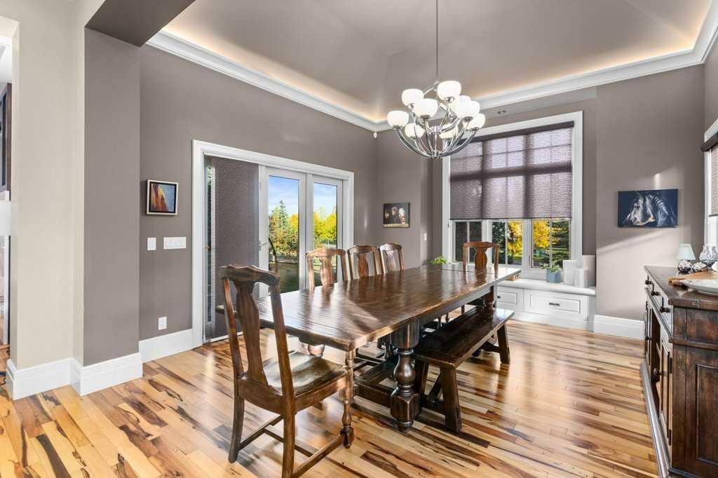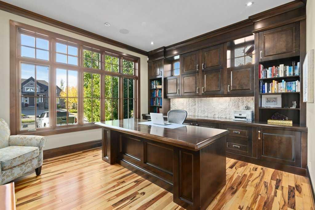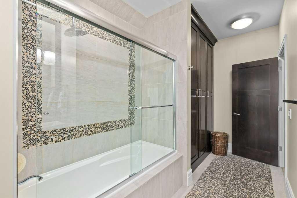 A Fabulous Family Home of architectural significance & exceptional quality, offering over 5,000 sq. ft. in the prestigious community of Heritage Pointe. From the moment you arrive, this residence makes a striking impression with its timber-accented exterior, cedar shakes, stone detailing, and solid wood front door. The double stamped concrete driveway, quad heated garage with epoxy floors, and professionally landscaped yard set the stage for what’s inside. Step into a grand gallery style foyer with limestone inlaid floors, drawing your eye to the open staircase framed by a two-storey stone feature wall. The coffered ceiling in the great room and polished stone fireplace create a warm, luxurious atmosphere that flows seamlessly into the heart of the home. The custom two-tone kitchen is a true showpiece, showcasing stacked light boxes, Sub-Zero and Wolf appliances, exotic stone countertops, and ambient lighting that elevates the overall elegance. The adjoining dining nook opens to a rear deck overlooking a park-like yard — ideal for entertaining or quiet family moments. The main-level primary suite is a serene retreat with doors to the backyard and a spa-inspired ensuite featuring a steam shower, soaker tub, and dual vanities, all finished in refined materials. A private den with rich custom millwork provides an elegant workspace, while the oversized mudroom and laundry area offer everyday convenience with direct garage access. Upstairs, two additional bedrooms, a full bath with dual sinks, and a spacious bonus room provide comfort and versatility. The fully developed lower level is designed for recreation and relaxation, featuring a fourth bedroom and full bath, fitness studio, walk-behind bar, games and rec area, and a projection theatre room perfect for family movie nights. This exceptional home is also equipped with Control4 Smart Home Automation,. Ideally located just steps from playgrounds and green spaces, this home beautifully combines architectural artistry, luxurious finishes, and family functionality — truly a masterpiece in Heritage Pointe. Residents also enjoy year-round lake privileges including paddle boarding, fishing, beach access, pickleball courts, summer camps, community events, and scenic ravines to explore in every season.
