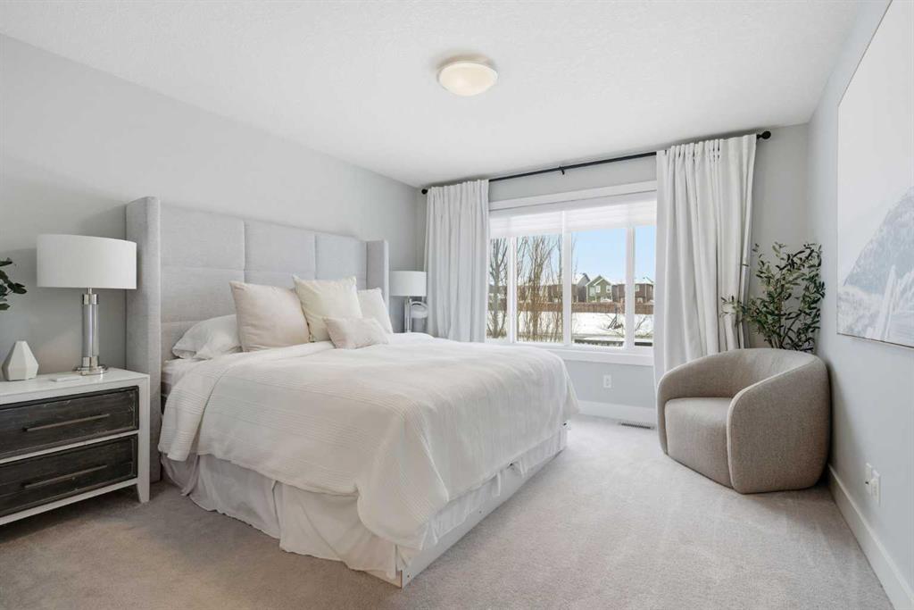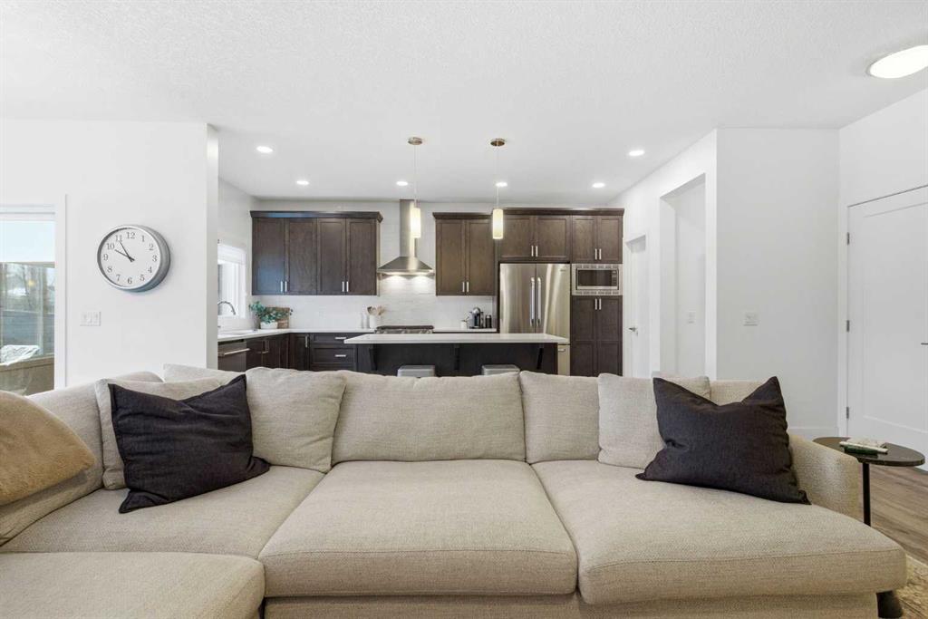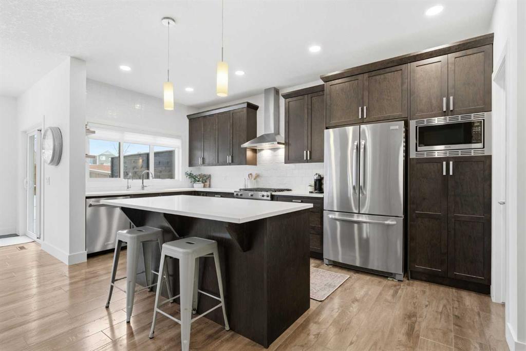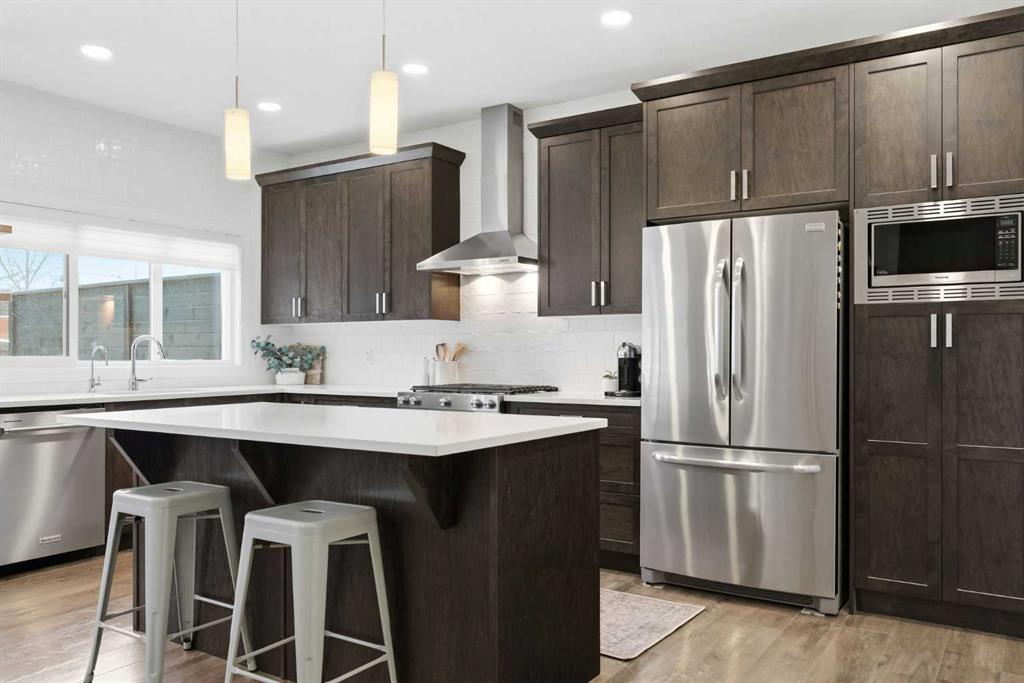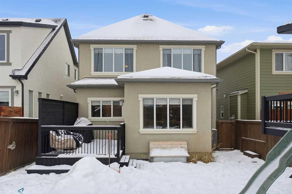 Welcome to beautiful Mahogany, one of Calgary’s most sought-after, family-friendly lake communities. This thoughtfully updated and well-maintained two-storey home reflects true pride of ownership and offers a functional layout with generous living space, making it an excellent option for families. The main floor features a kitchen with dark maple cabinetry, white quartz countertops, full counter-to-ceiling tile backsplash, and a gas range with hood fan. Additional highlights include 9 ft ceilings, upgraded baseboards, central A/C, Hunter Douglas window coverings, and a gas fireplace. Upstairs, the primary bedroom includes a spacious ensuite with raised quartz countertops. Two additional bedrooms and upper-floor laundry complete the level. The basement has been professionally developed and adds a fourth bedroom, a full bathroom, and a large rec room. Outside, the west-facing backyard is fully landscaped and includes a natural gas line on the deck. An extended driveway and concrete walkway provide convenient backyard access. Residents enjoy year-round lake access with private beach use, clubhouse amenities, and skating rinks in the winter months. Located close to schools, playgrounds, and everyday amenities, this home is a great opportunity to live in one of Calgary’s premier lake communities.