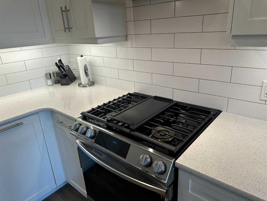 Step inside this immaculate, like-new suite and you’ll immediately appreciate the thoughtful open-concept design, soaring 9.5-foot ceilings, and high-end finishes throughout. The spacious foyer leads to a gourmet kitchen featuring quartz countertops, elegant Santino Bianco porcelain tile backsplash, Blanco Precis double undermount sink, and a full suite of premium stainless steel appliances including a gas range, stainless hood fan, Bosch dishwasher, microwave drawer, and French-door refrigerator with water and ice.
