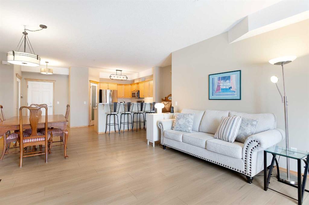 2 BED 2 BATH | UPDATED | AIR CONDITIONING | 55+ Adult living | The unit you have been waiting for! Offering 2 beds & 2 Bathrooms this nearly 1100 sqft unit in the sought after ‘Sierras of Evergreen’ provides a wonderful opportunity to the right buyer. This unit has been tastefully updated with luxury vinyl plank floors, quartz counter tops in the kitchen and bathrooms providing you an updated modern look while providing ease of cleaning. Primary bedroom is a great size and includes a 4piece ensuite and large walk-in closet with shelves. the 2nd bedroom would be a perfect spot for an office or guest room and is separated from the primary by the living room providing greater privacy in each room. Laundry room features solid wood built-in shelving, prefect for storing all of your cleaning supplies or extra pantry items and features a newer high efficiency washer and dryer! The kitchen provides ample counter and cupboard space, corner pantry, raised eating bar, stainless steel appliances and pristine maple cabinetry. Within this well appointed building you can find a significant amount of amenities including an indoor pool, hot tub, fitness facility, wood working room, multiple games/billiards rooms, rentable party/banquet room, 7 rentable guest suites, craft room, movie theatre room, car wash, multiple libraries along with numerous meeting and sitting areas. This building offers a wonderful community of owners who have pride of ownership and provides many opportunities to connect and converse with your fellow neighbors through numerous organized activities. Enjoy walks outside around the walking paths or take a trip on foot to the nearby shopping center for quick access to shops, restaurants and grocery store. Easy access to Stoney Trail, Macleod Trail, 6 mins to Shawnessy shopping centre, nearby bus stop with access to Shawnessy LRT station. This unit also offers titled parking and a secure storage unit in front of the stall. Electricity, heat and water/sewer included in condo fees! This is a well maintained unit that needs to be seen to be appreciated! Book your viewing today!