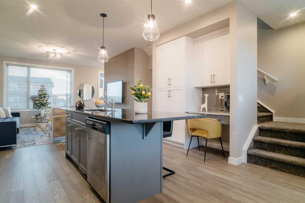 END UNIT, THIS HOME IS UNDER CONSTRUCTION, 30 TO 45 DAYS TO COMPLETION. DOUBLE DETACHED GARAGE, DECK, FENCED AND LANDSCAPED, NO CONDO FEES. PICTURES ARE OF SAME MODEL, NOT SUBJECT PROPERTY. Welcome to the “Glasgow” townhome, by Award winning, Master Builder, Douglas Homes Ltd. From the front covered porch, the entry opens onto the spacious great room with 9ft ceiling and gleaming hardwood floors throughout the main floor. The aspiring chef will appreciate the well planned “island” kitchen. From the upgraded 42 inch, soft close cabinets, to the gorgeous quartz countertops, everything is within easy reach. The sparkling stainless steel fridge, the glass top, self cleaning electric range, dishwasher, and over the range microwave/hoodfan are all just an arms length from the kitchen sink. Opposite side of the island, provides a convenient pantry, and desk with upper cabinet for all those recipe books you will collect. The spacious dining area features a large picture window looking out upon the back yard with room for the kids to play, with a rear entry door to the deck for those summer bbq’s. Here also is a 2pc powder room for your guests convenience, Upstairs includes 2 good sized secondary bedrooms, a 4pce bathroom with quartz vanity and tile floors, a convenient upstairs laundry, and a spacious primary bedroom with large upsized window and ensuite bath, with walk in shower, with glass front, tile floor and twin sinks and quartz vanity. The full basement provides rough in plumbing for a future bath, one window for future bedroom, and enough space remaining for a spacious future family room if you decide your family needs room to spread. All this in the desirable new subdivision Cobblestone Creek, with tennis courts, playgrounds, future school reserve, pathways and numerous green spaces, on the western edge of Airdrie, with wide open country side, and views to the west.