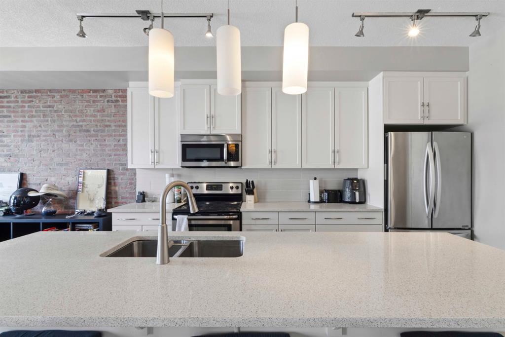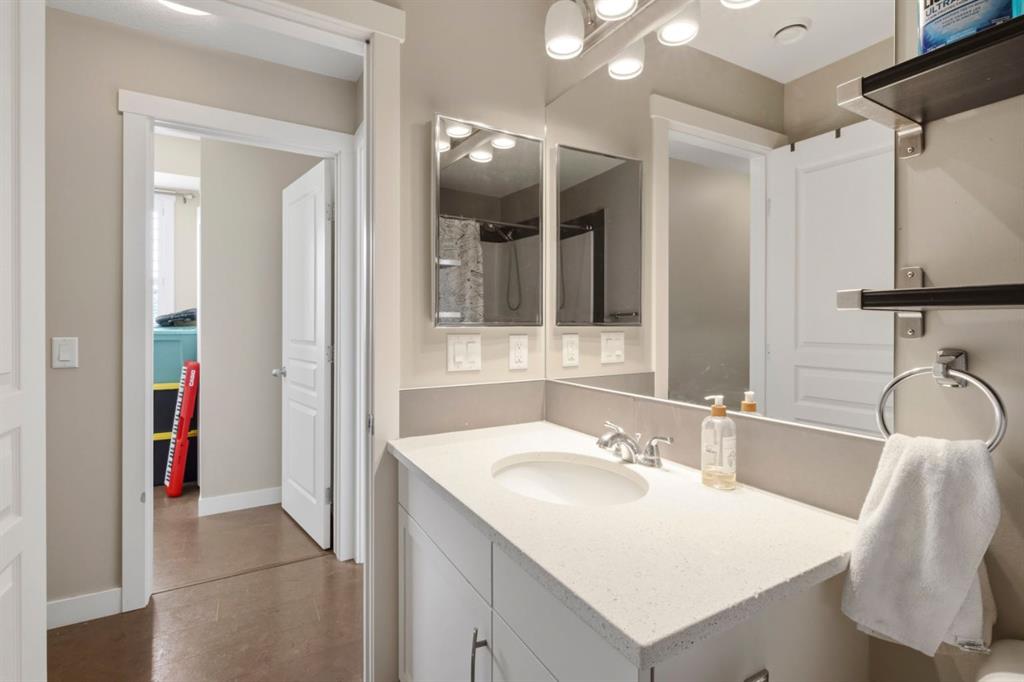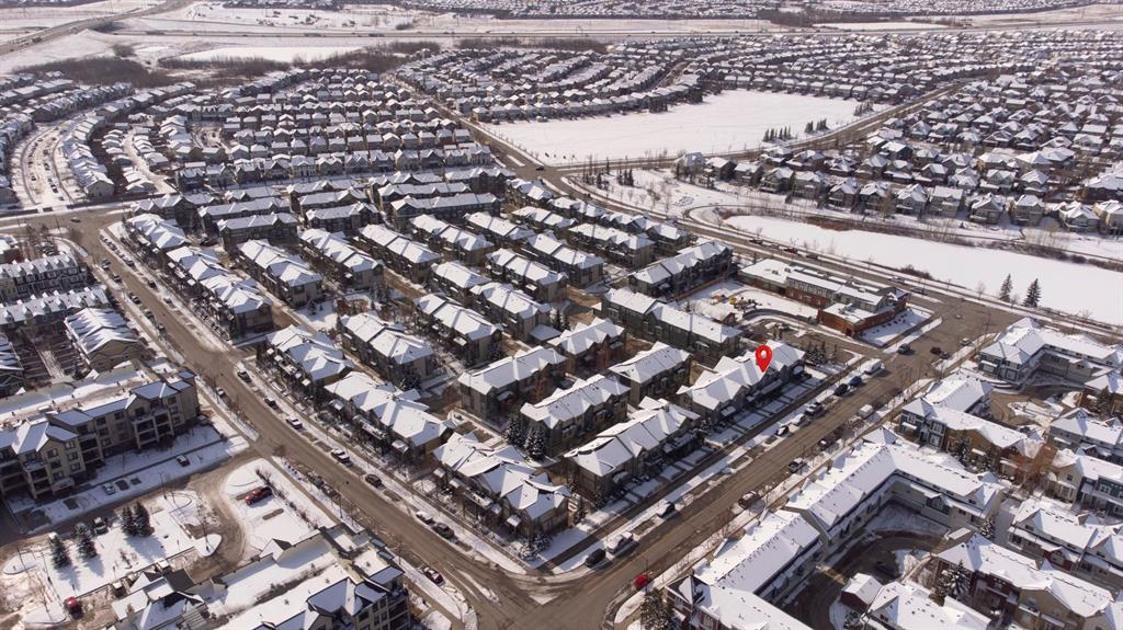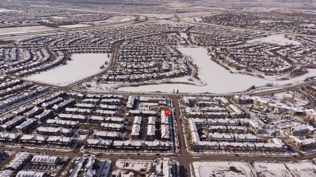 This home offers the perfect trifecta of maintenance-free living, an exceptional location (shopping, entertainment and transportation), and modern styling at an affordable price. The heart of the home, the kitchen, will inspire your culinary creativity with white cabinets, stainless steel appliances, a full-height tile backsplash, a beautiful quartz massive centre island and a space-saving microwave-hood fan. The open concept seamlessly connects the kitchen to the adjacent great room with brick feature wall and dining area, with all main-floor spaces featuring durable and stylish cork flooring. The great room is completed with a cozy gas fireplace wrapped in Brick and a 25-foot-wide, west-facing sun-drenched deck, perfect for enjoying the summer. Central air conditioning ensures comfort during hot summer days. The private master retreat features a walk-in closet and a four-piece ensuite, complete with a stylish quartz countertop, an easy-to-clean one-piece tub/shower and white stained wood cabinetry. The second and third bedrooms are ideal for children, a flex room or a dedicated home office, and are adjacent to the second four-piece bathroom. Convenient laundry facilities complete the upper level, with additional built-in storage and a laundry sink. The basement (entry level) has been completed with laminated flooring and could serve as an exceptional home office, equipped with track lighting for adjustable lighting and additional built-in storage. Car enthusiasts will appreciate the double attached garage with epoxy flooring. The well-managed condo corporation has kept fees low. This home is located in an exceptional area with multiple pathways, including the 2.5-km Inverness Pond loop, just steps away. It is also close to shopping, schools and easy access to Stoney Trail and Deerfoot.