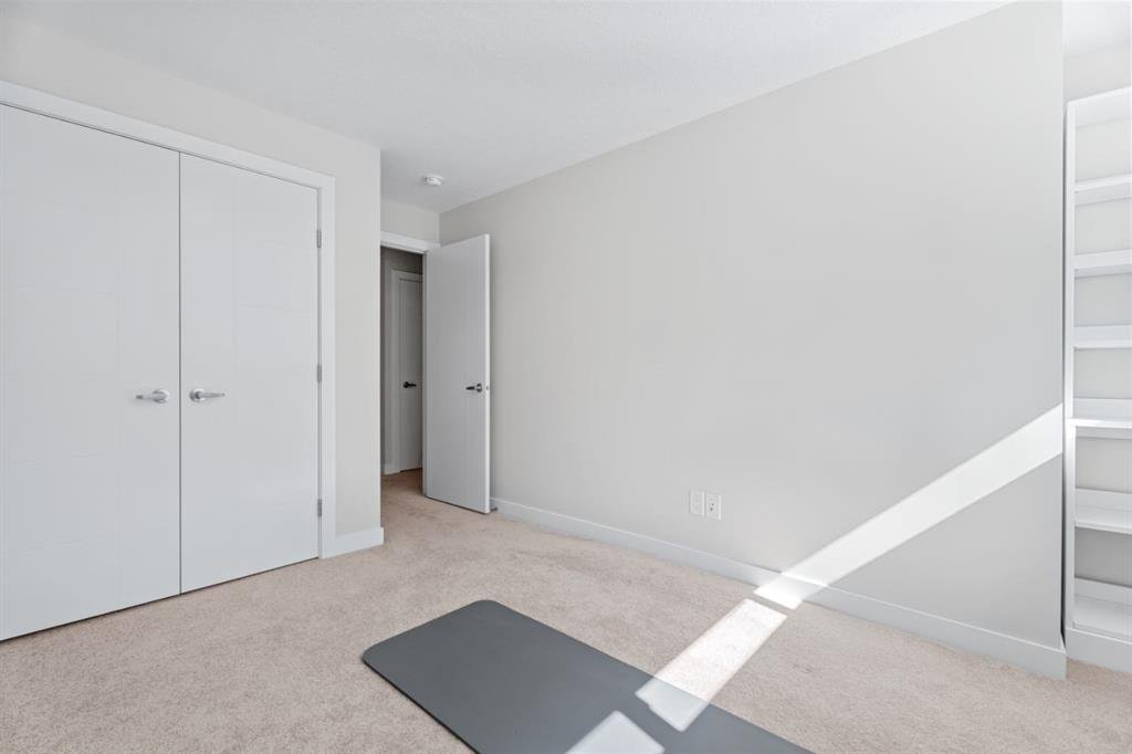 This upgraded END UNIT bungalow combines modern design, superior finishes, and a convenient location. Perfectly set in the middle of the street, away from the traffic circle and main road, you’ll enjoy a quieter setting with plenty of street parking and easy access to nearby walking paths. Inside, soaring VAULTED and cathedral ceilings paired with oversized windows create an incredible sense of light and space. The fabulous floor plan is open yet functional, featuring luxury vinyl plank flooring, a spacious living room, and a full sized dining area that’s bathed in natural light with the additional windows (end unit). The kitchen is a showpiece with a gas stove, upgraded hood fan, ceiling height soft close cabinetry, a PANTRY, quartz countertops, and an island. The primary suite is a true retreat with 13’ ceilings that add space for even the largest furniture pieces. A generous walk-in closet and ensuite with quartz counters & dual vanity complete the space. A main floor powder room and laundry add convenience, while the back entrance includes a built in bench with ample storage. Classic iron railings lead to the fully finished basement which is fabulous- featuring a huge family room, two oversized bedrooms, and a full bathroom. Large windows bring in plenty of sunshine, making the space feel bright and welcoming. You will notice all the extra features throughout, this home feels brand new and with a Built Green certification. Comfort features like a water softener and air conditioning are already in place, ensuring ease of living year round. The private backyard is maintenance free with low upkeep landscaping, perfect for people on the go, down sizers, or snowbirds. The detached DOUBLE garage is insulated and drywalled, providing excellent storage and functionality. And with absolutely NO CONDO FEES, you’ll love the freedom of ownership without extra costs. This stylish, move in ready home delivers modern upgrades, a fabulous floor plan, and a highly desirable location close to walking paths and amenities and quick access to Calgary. Check out the virtual tour!