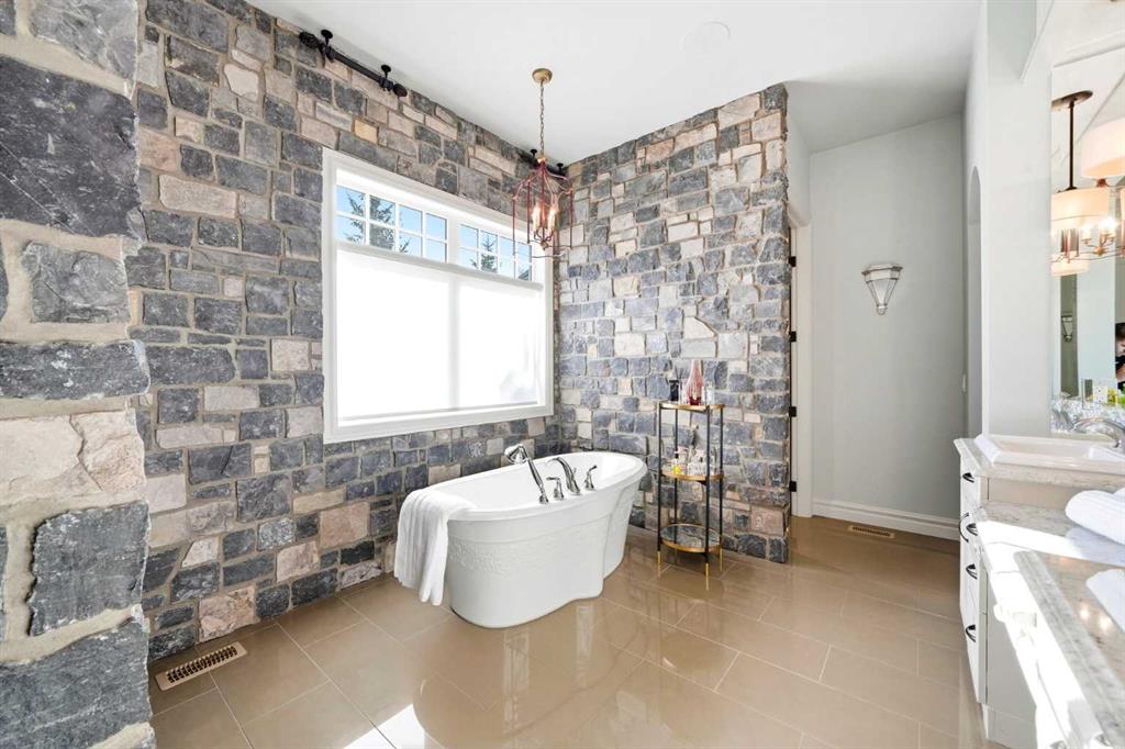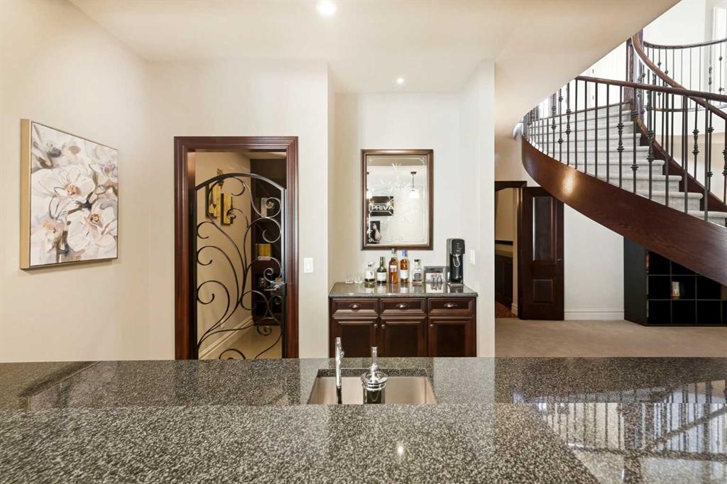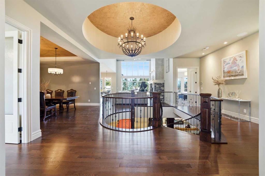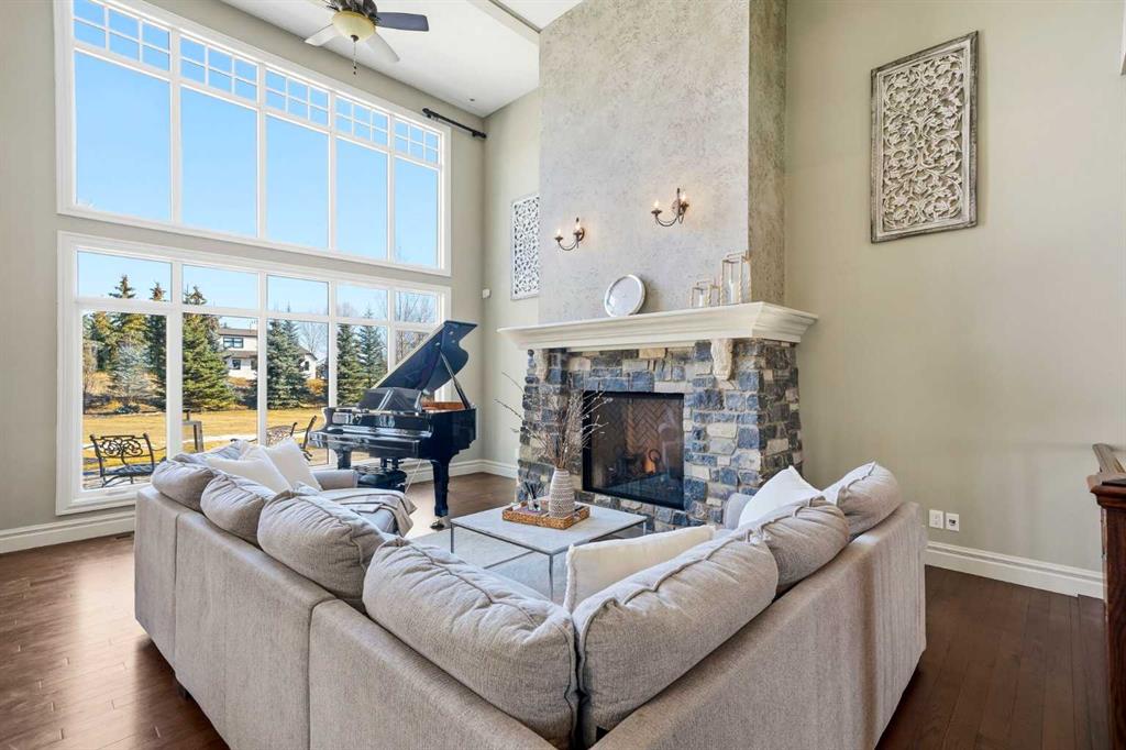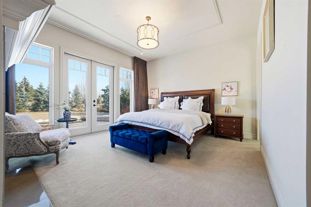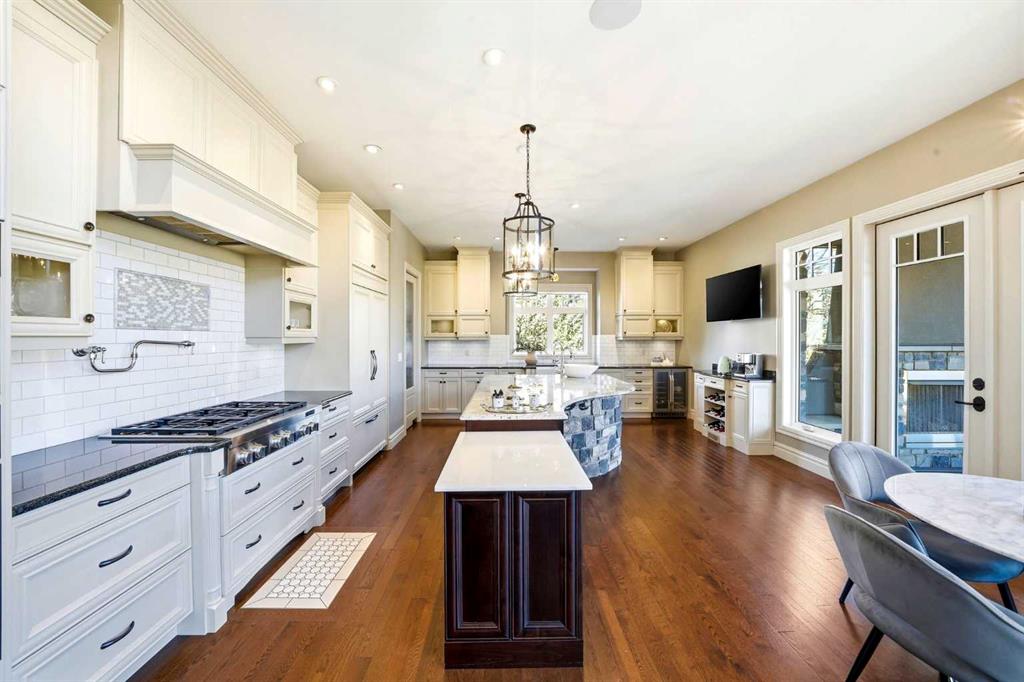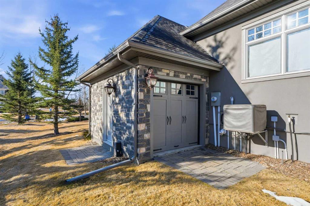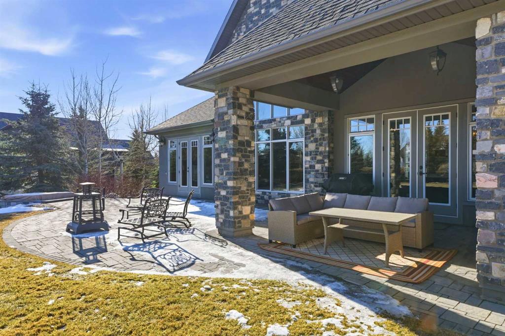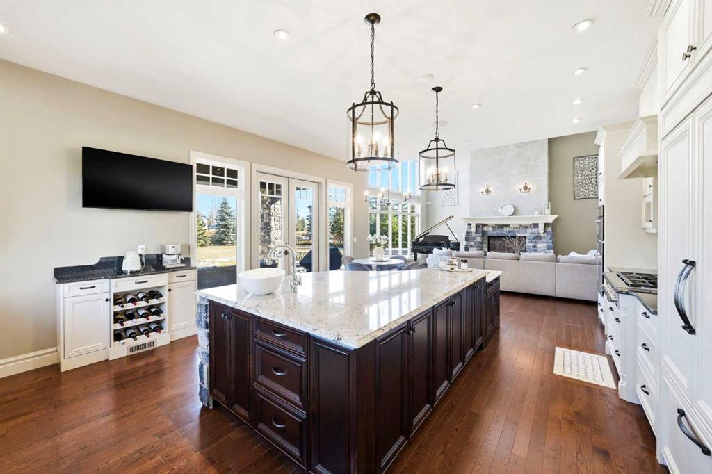 Welcome to Mackenas Estates, one of Calgary’s most exclusive gated communities, offering unparalleled privacy, security, and estate-level living. Situated on a rare 0.75-acre lot and surrounded by expansive green space and natural landscape, this exceptional custom-built bungalow by Wolf Custom Homes delivers over 4,500 sq.ft. of meticulously designed living space, perfectly balancing luxury, comfort, and functionality—all just 25 minutes from downtown Calgary. From the moment you enter, you are greeted by a dramatic 13-foot foyer that opens into a stunning great room featuring 16-foot floor-to-ceiling windows and a statement fireplace. Rich architectural detailing, site-finished hardwood flooring, custom millwork, and curated finishes showcase the craftsmanship and quality throughout. The gourmet kitchen is designed for both everyday living and elegant entertaining, featuring premium Wolf & Sub-Zero appliances, custom cabinetry, luxury stone surfaces, and seamless flow into the main living and dining areas. The main floor primary retreat offers a private, resort-inspired experience, complete with a gas fireplace, sitting area, spa-like ensuite with heated floors, and direct access to outdoor living, including a sunken hot tub. The fully developed lower level is equipped with in-floor heating throughout and is ideal for entertaining and extended family living, featuring a spacious recreation room with a two-sided fireplace, full wet bar, wine room, media/theatre room (equipment included), and multiple bedrooms including a private ensuite and a Jack & Jill bathroom. A beautifully designed curved staircase with custom iron detailing adds a striking architectural element to the home. Outdoors, enjoy your own private oasis with professionally landscaped grounds, expansive stone patios, irrigated lawns and gardens, and a European-inspired courtyard with a Rumford fireplace, perfect for year-round enjoyment. Additional features include a heated oversized triple attached garage (with in-floor heat), a well-designed mudroom with walk-through pantry, and a separate garden house with garage door for added flexibility. Located within a boutique gated community of just 21 homes and within the highly regarded Springbank school district (with school bus service to the gate), this property offers a rare opportunity to own a truly exceptional estate home in one of Calgary’s most desirable locations.