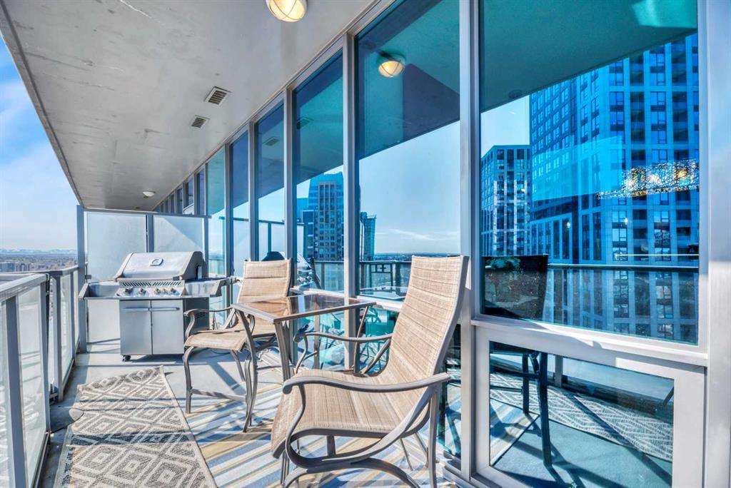The interior blends style and practicality with a thoughtfully designed kitchen featuring granite countertops, a full-height backsplash, ceiling-reaching cabinetry, upgraded appliances, and a generous island ideal for hosting. The dining area flows effortlessly onto an expansive main balcony with a gas BBQ hookup—your private perch for unforgettable sunsets and sparkling city lights.