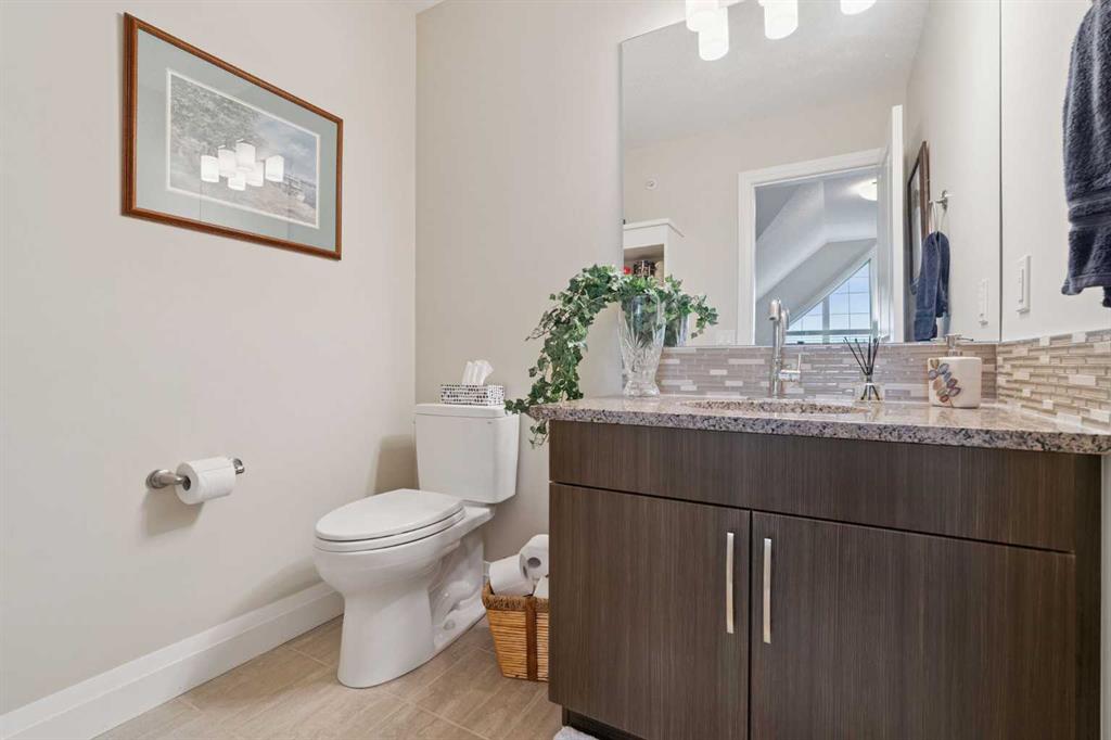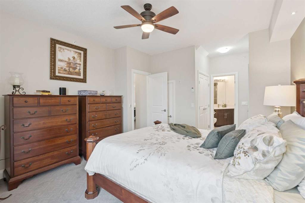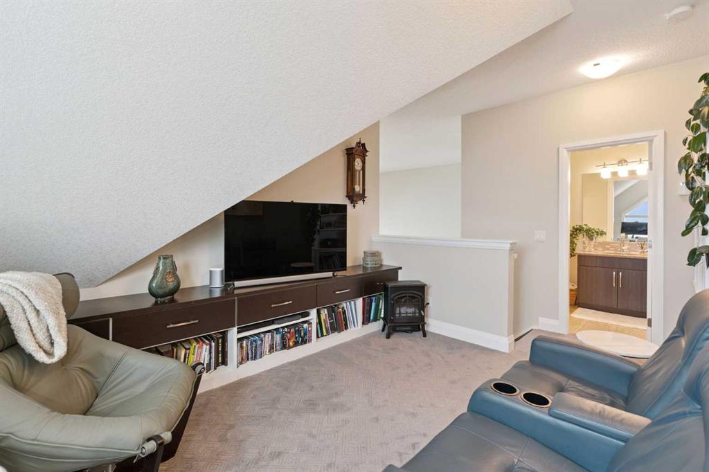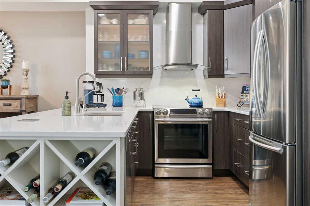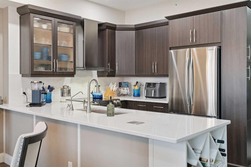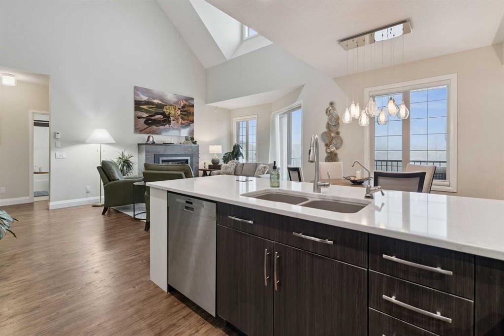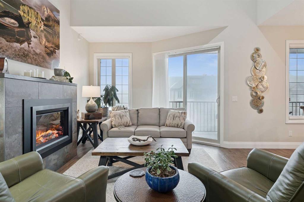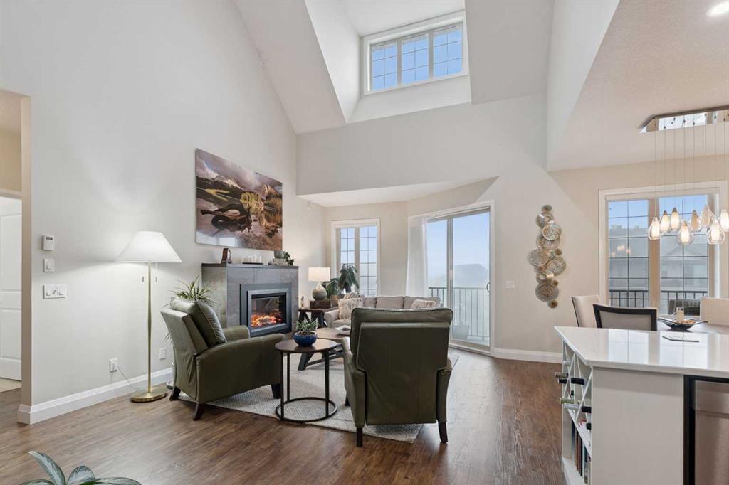 Breathtaking End Unit in One of Cochrane’s Most Luxurious Apartment Buildings. This premium 1,440 sq. ft. end unit offers 2 bedrooms and 2.5 bathrooms, showcasing a truly unique loft design with soaring ceilings that create a dramatic, high-end ambiance throughout. This unit has been meticulously cared for, upgraded and maintained. It very easy to say this is one of the nicest Apartment units in the entire town of Cochrane. Thoughtfully updated, the home features beautiful custom built-in cabinetry in the kitchen, complemented by a matching dry bar in the living room—perfect for entertaining. Quartz countertops and a full-height backsplash add a touch of modern luxury while offering durability and easy maintenance. New carpets throughout the home as well a truly breathtaking fireplace add class and charm to this lovely home. Expansive windows flood the space with natural light, enhancing the open-concept layout and emphasizing the impressive ceiling height. Step out onto the large balcony and enjoy breathtaking southeast-facing views of the mountains and rolling hills. The spacious primary bedroom offers excellent versatility, complete with dual closets and a well-appointed 3-piece ensuite. The second bedroom is exceptionally designed with high-end custom millwork, functioning perfectly as a home office while also featuring a cleverly integrated Murphy bed for guests. The loft level provides a cozy yet sophisticated retreat—ideal for relaxing with a book or enjoying a movie—highlighted by a stunning built-in entertainment unit. Multi-level apartment living is rare in Cochrane, and this residence stands out with its exceptional design and attention to detail. Additional features include in-suite laundry discreetly tucked into a well-organized front room, two titled underground heated and secure parking stalls, and a large titled storage unit. The building itself offers excellent amenities, including bicycle storage, recycling facilities, and a charming shared library. Condo fees provide exceptional value, covering all utilities except electricity and telecommunications. Ideally located close to shopping, restaurants, and schools, this meticulously maintained building reflects pride of ownership throughout. Wide, well-lit hallways and a clean, secure parkade further enhance the living experience. This is luxury living at its finest.