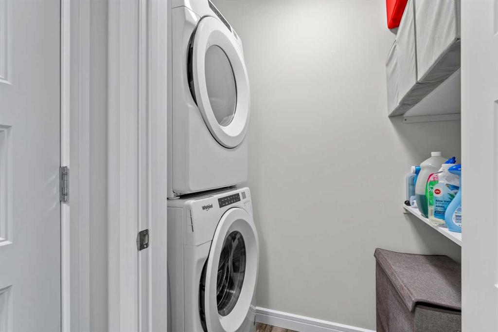 The generous primary bedroom features a walk-in closet and easy access to the well-appointed bathroom. You’ll also appreciate the full-size stacked washer and dryer, offering everyday convenience.