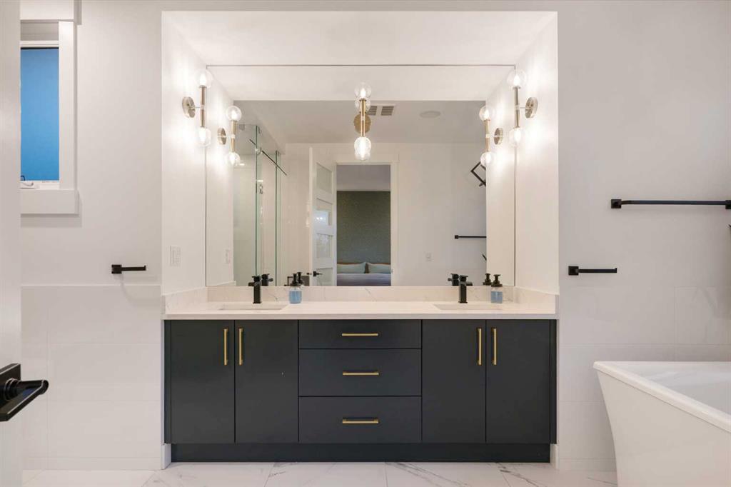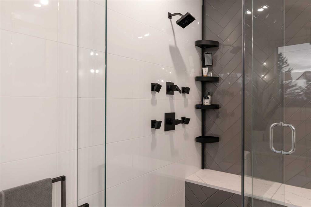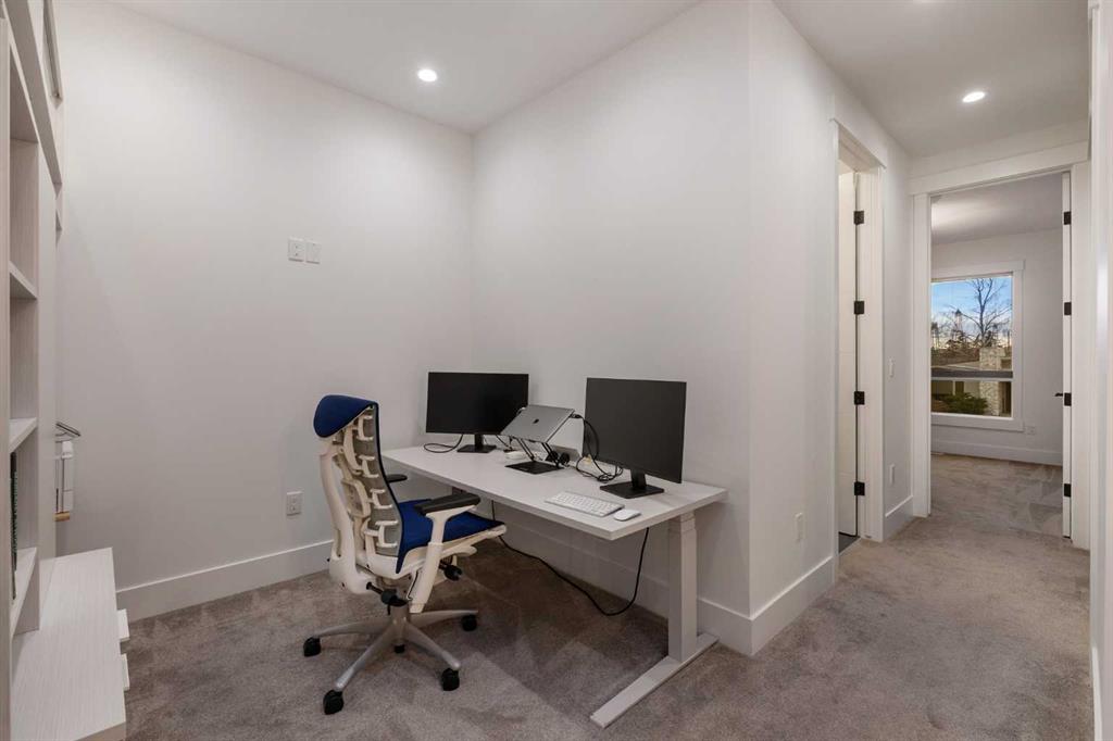 Upstairs offers a bright dedicated office area, three bedrooms, and convenient laundry. The primary suite features in-floor heating and a spa-inspired 5-piece ensuite with dual vanities, a glass shower, and a freestanding tub.