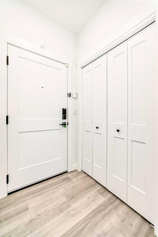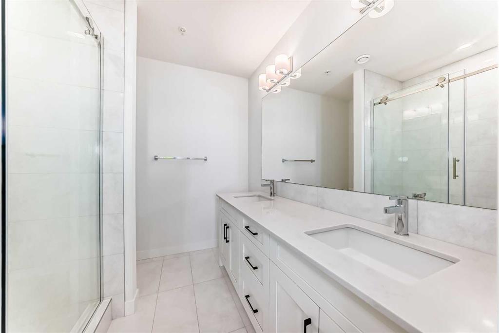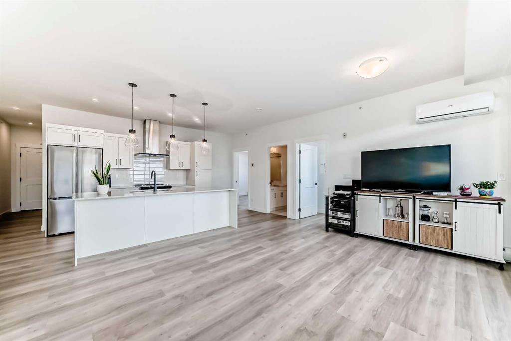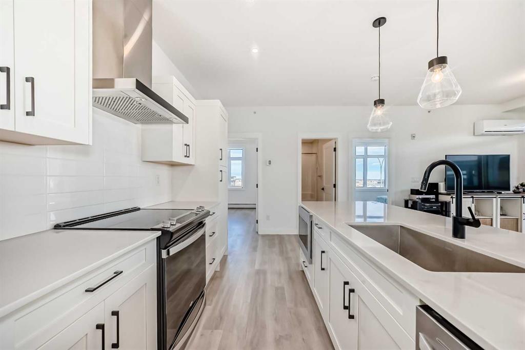 Welcome to this beautiful upgraded 2 bedrooms, 2 full baths on the top floor corner unit in the vibrant community of Seton SE area. The open concept floor plan features 9-foot ceilings, insuite laundry room with upgraded laundry doors and full side stainless steel washer & dryer, luxury vinyl floorings all over for easy mainternance & style, large windows offering plenty natural lights throughout. Modern white finished kitchen with high end kitchen shaker cabinetry package and soft-close doors and drawers, good size pot drawers; Upgraded stainless steel appliances and chimney style rang-hood, stunning Pendant lighting and huge extended central island with Quartz countertops is perfect for preparing meals,leaisurely dinning or hosting family gatherings overlooking to a spacious livinng room/dinning room combine offering a wall-mounted air conditioner unit to keep you comfortable during hot summer days, you also have patio door step out on to your private big balcony with a gas-line for a breath of fresh air after a long working day ans a glimpse of the surrounding community. Additional the bedrooms are seperate by a spacious bathroom for additional privacy. The primary bedroom is a spacious retreat with a good size walkthrough closet made by California clost company offers abundant storage for all clothing & accessories and you also have a good size 4-pc stand shower ensuite with full height titles, ceramic tile floorings & backsplash, quartz countertop on dual sinks and a elegant barn door to seperate the primary bedroom and walkthrough closet. This unit is measured at 971 sqft by the Builder floor plan. It also comes with a fresh air in-take system, one tiltle underground heated parking stall and one good size assiggned storage cage, both of these are located close to the elevator and stairs. This condo complex is conveniently located within walking distane to transit transportation, HOA, the Real Candian Superstore, Save on Foods, Cinemas, Tim Hortons, various restaurants and Pubs, the South Health Campus,the largest YMCA, Library, Schools, playground, dog park and future LRT Green line. Easy access to Deerfoot Trail, Stoney Trail and to the rest of the city. This home shows better then new and price to sell. Quick poession negotiable. Don’t miss out on this chance to make this property your own!