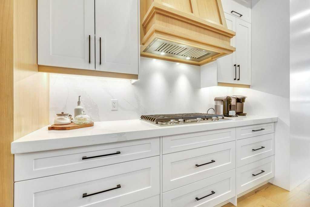 The main level is tailored for both everyday living and refined entertaining. A welcoming sitting area leads into the showpiece kitchen—the undeniable heart of the home. Anchored by an elongated island with a dramatic 2.5-inch quartz waterfall edge, this space is as functional as it is beautiful, ideal for food preparation, casual gatherings, or evening conversation. Ceiling-height lacquered cabinetry, deep pot drawers, and a premium Pro Series KitchenAid appliance package—including a gas cooktop and professional under-cabinet hood fan—deliver exceptional performance and style.