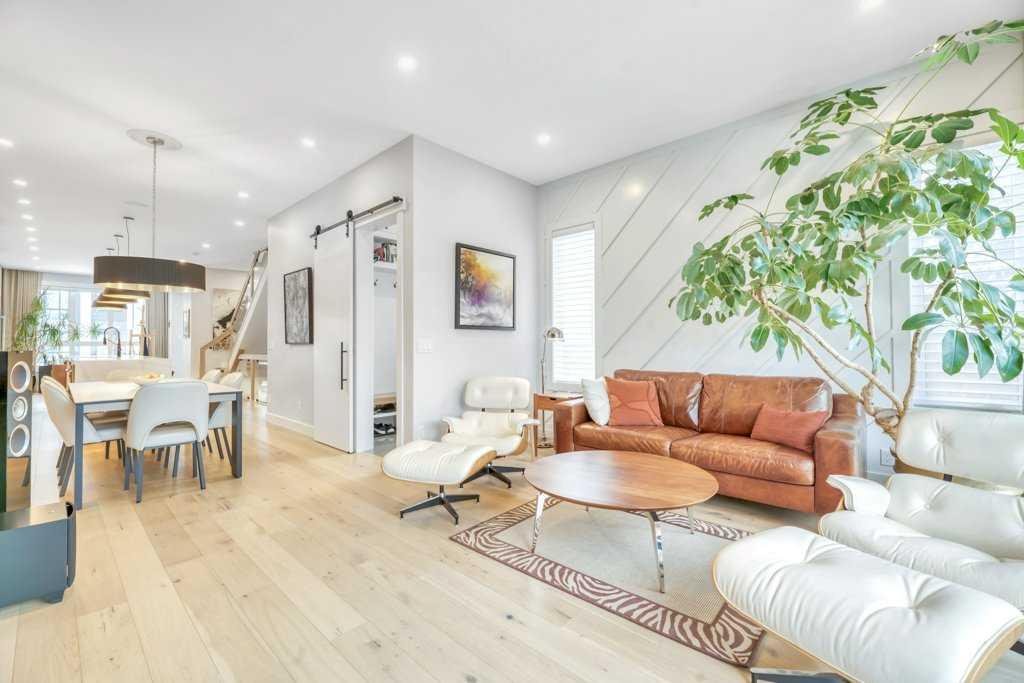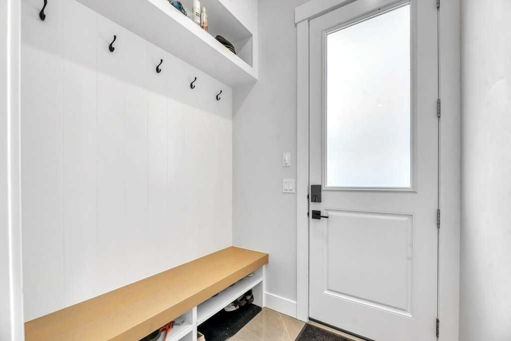 The dining area comfortably accommodates a large table, making it perfect for hosting family and friends, and flows seamlessly into the living room. Here, oversized 8-foot patio doors blur the line between indoor and outdoor living, filling the space with natural light and providing effortless access to the yard. A discreetly tucked-away mudroom with custom built-in lockers offers a polished and practical space for daily organization, winter gear, or muddy paws.