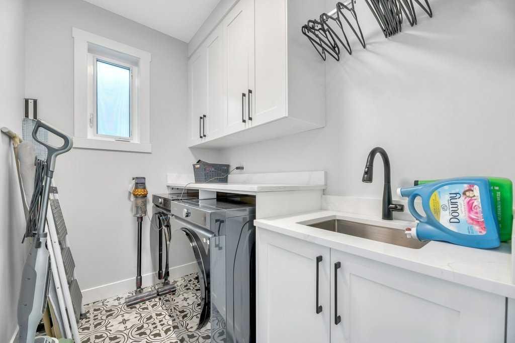 Upstairs, the private living quarters continue the home’s elevated design. The primary retreat is nothing short of stunning, featuring dramatic cathedral ceilings, a spacious walk-in closet, and a spa-inspired ensuite complete with a deep soaking tub, steam shower, water closet, and luxurious in-floor heating. The second bedroom impresses with its own soaring ceiling and walk-in closet, while the third bedroom offers versatility as a home office, nursery, or guest suite. A beautifully finished 4-piece guest bathroom and a large laundry room with custom cabinetry and sink complete the upper level.