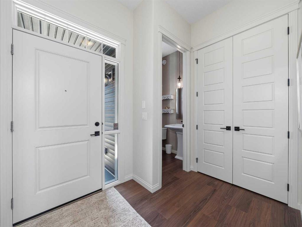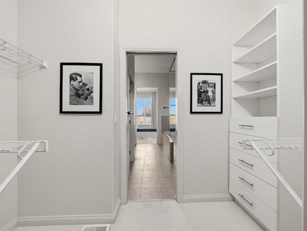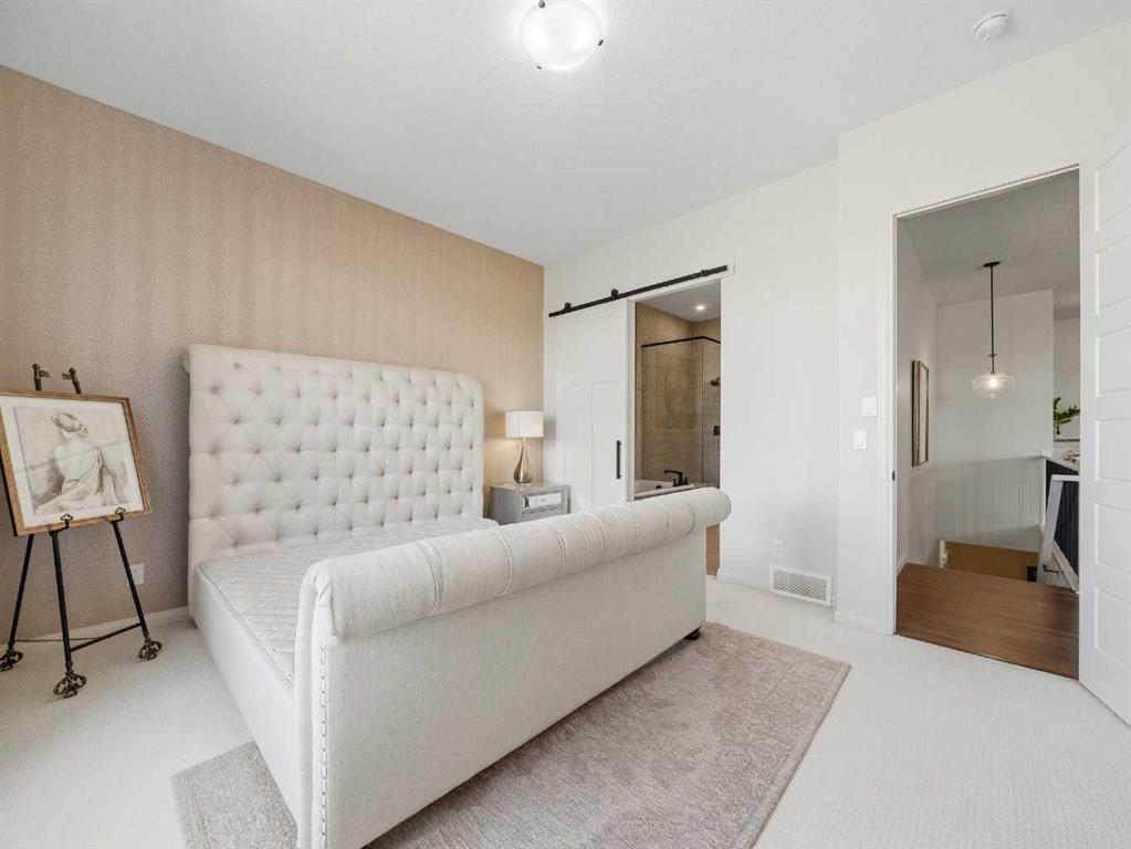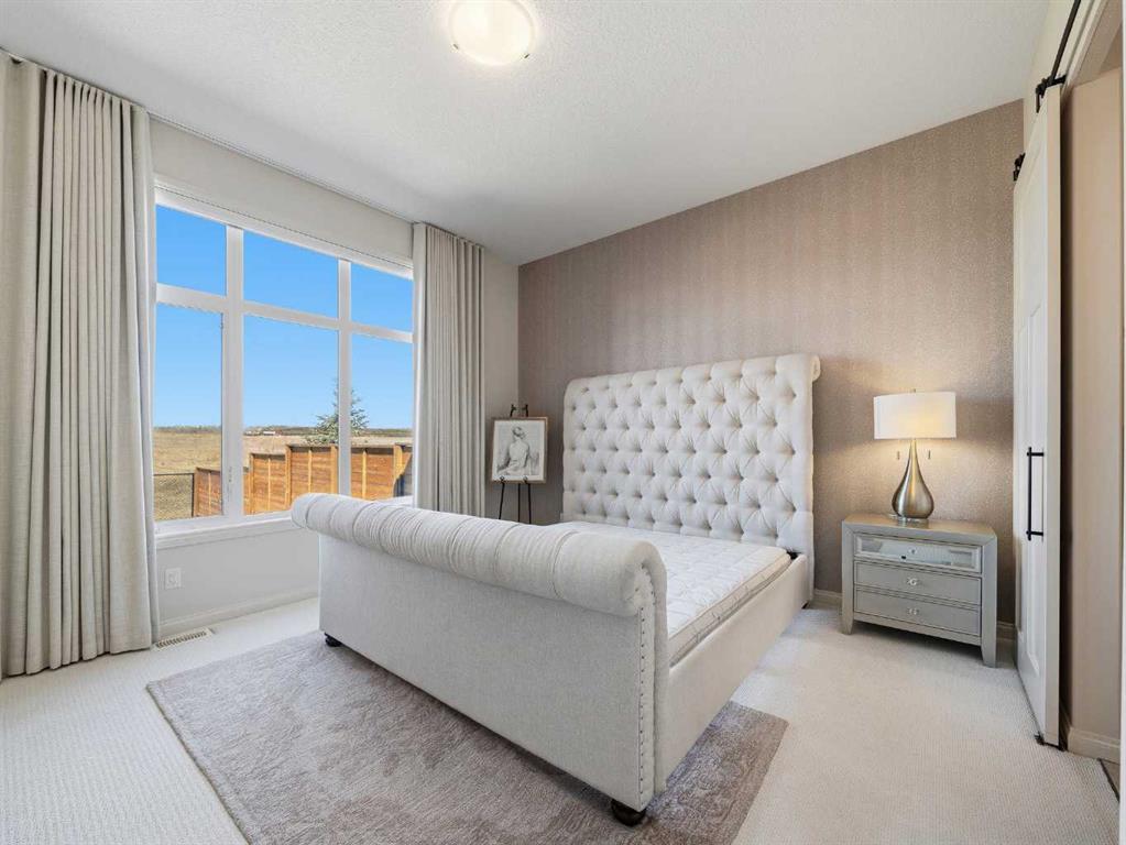 The primary retreat accommodates a king-sized bed and features a spa-like ensuite, double comfort-height sinks, oversized shower, separate WC, and a walk-through closet leading directly to the laundry room. Thoughtful design continues with a mudroom offering bench seating and access to the extra-tall garage.