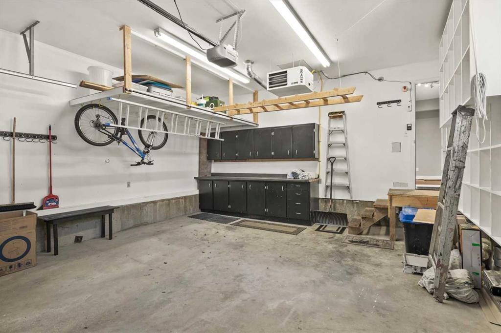 A standout feature of the home is the heated garage, complete with high ceilings, built-in shelving, cabinetry, and a mezzanine level—offering exceptional storage and workspace options.
