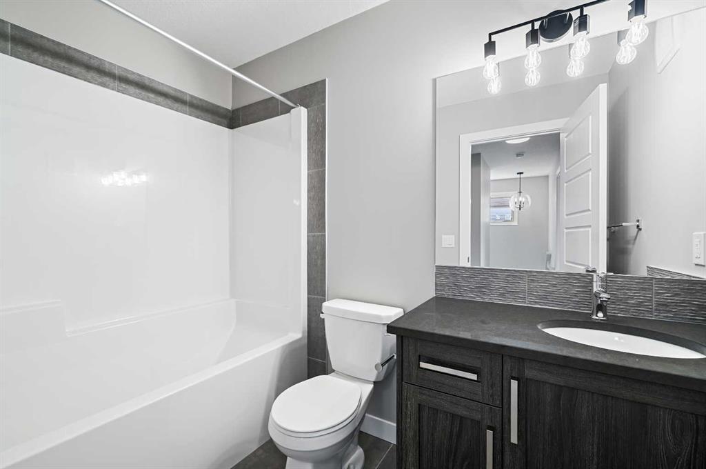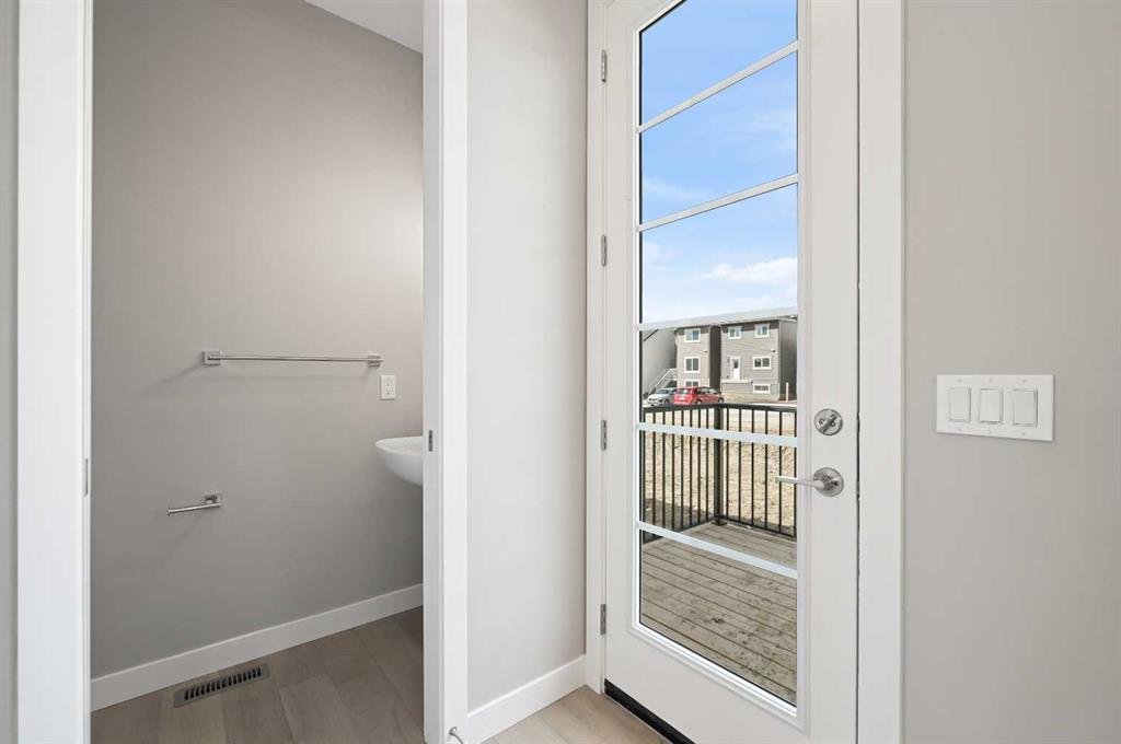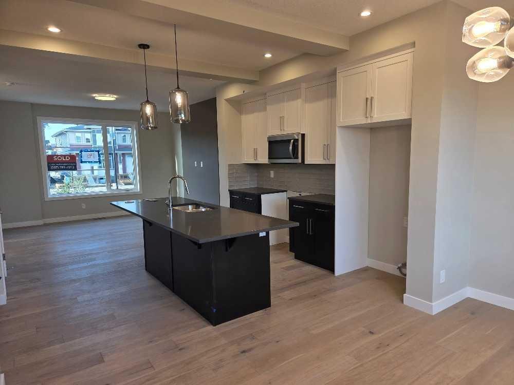 Public Remarks: IMMEDIATE POSSESSION. ,DOUBLE DETACHED GARAGE, DECK, FENCED AND LANDSCAPED, NO CONDO FEES. SOME PICTURES ARE OF SIMILAR MODEL, Welcome to the “St. Andrews” townhome, by Award winning, Master Builder, Douglas Homes Ltd. From the front covered porch, the entry opens onto the spacious great room with 9ft ceiling and gleaming hardwood floors throughout the main floor. The aspiring chef will appreciate the well planned “island” kitchen. From the upgraded 42 inch, soft close cabinets, to the gorgeous quartz countertops, everything is within easy reach. The sparkling stainless steel fridge, the glass top, self cleaning electric range, dishwasher, and over the range microwave/hoodfan are all just an arms length from the kitchen sink. Opposite side of the island, provides a convenient pantry, and desk with upper cabinet for all those recipe books you will collect. The spacious dining area features a large picture window looking out upon the back yard with room for the kids to play, with a rear entry door to the deck for those summer bbq’s. Here also is a 2pc powder room for your guests convenience, and perhaps the kids hurried need. Upstairs includes 2 good sized secondary bedrooms, a 4pce bathroom with quartz vanity and tile floors, a convenient upstairs laundry, and a spacious primary bedroom with large upsized window and ensuite bath, with walk in shower, with glass front, tile floor and again a quartz vanity. The full basement provides rough in plumbing for a future bath, one window for future bedroom, and enough space remaining for a spacious future family room if you decide your family needs room to spread. All this in the desirable new subdivision Cobblestone Creek, with tennis courts, playgrounds, future school reserve, pathways and numerous green spaces, on the western edge of Airdrie, with wide open country side, and views to the west.