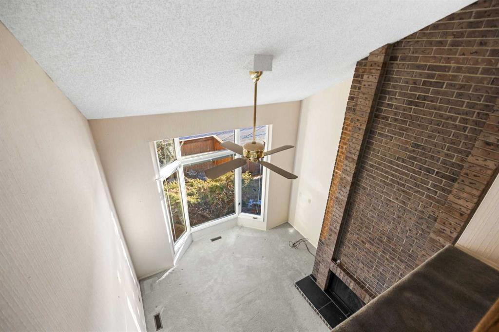 Step inside to a spacious main living area highlighted by soaring ceilings, a dramatic full-height brick fireplace (wood-burning), and a large bay window that fills the room with natural light while framing the green space beyond. The unique split-level layout creates an open, airy feel while still providing comfortable spaces for everyday living.