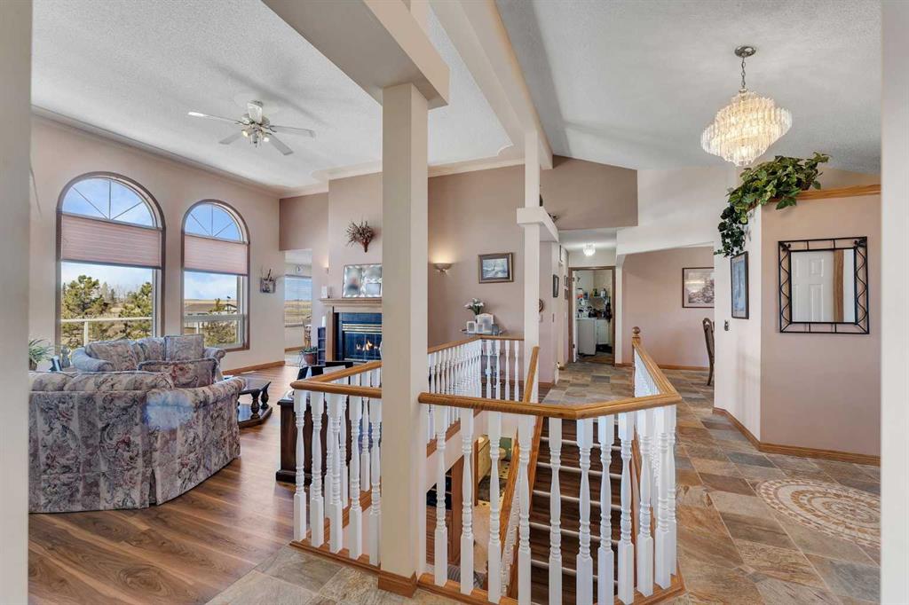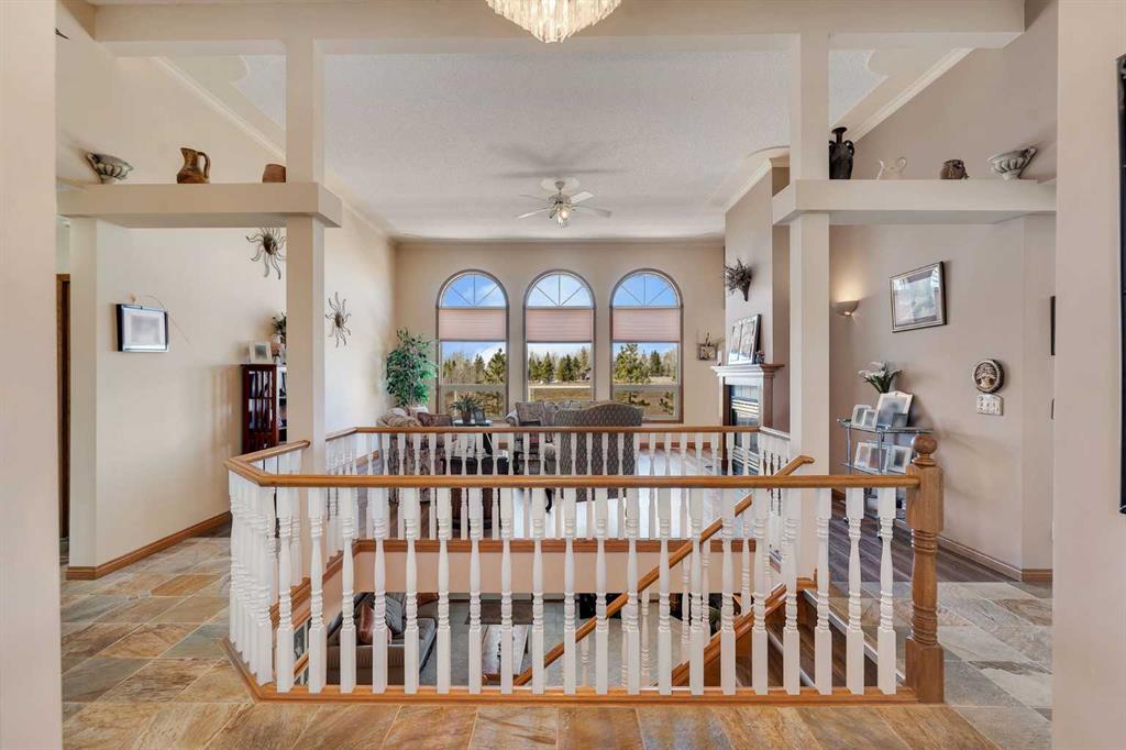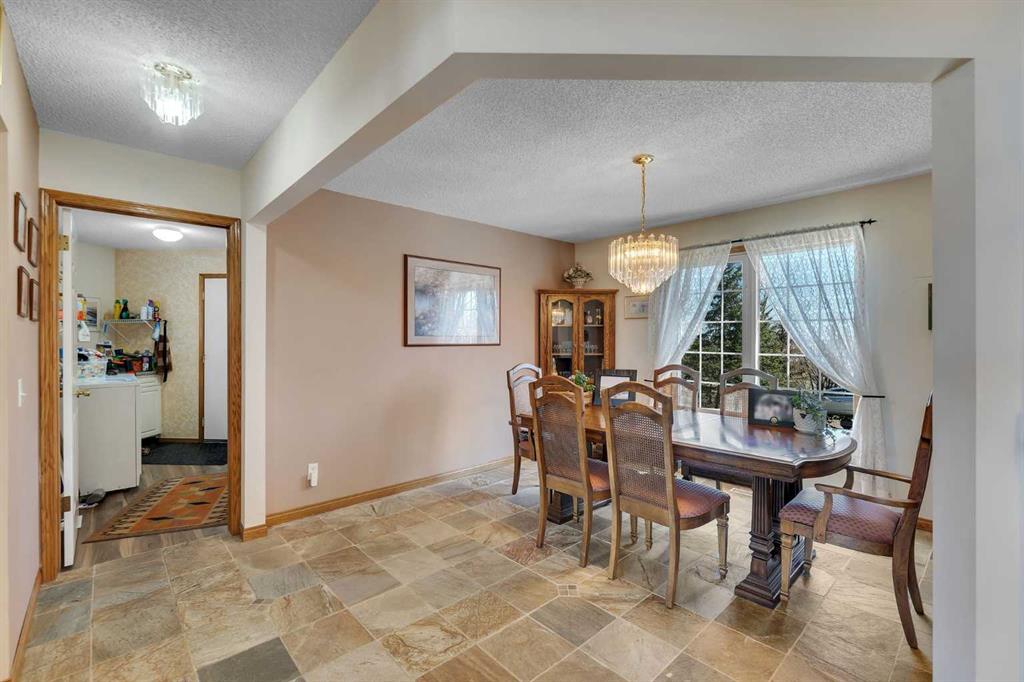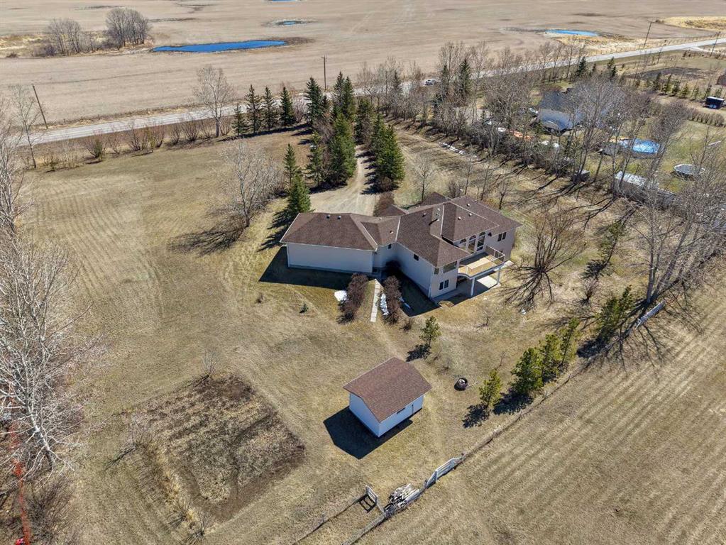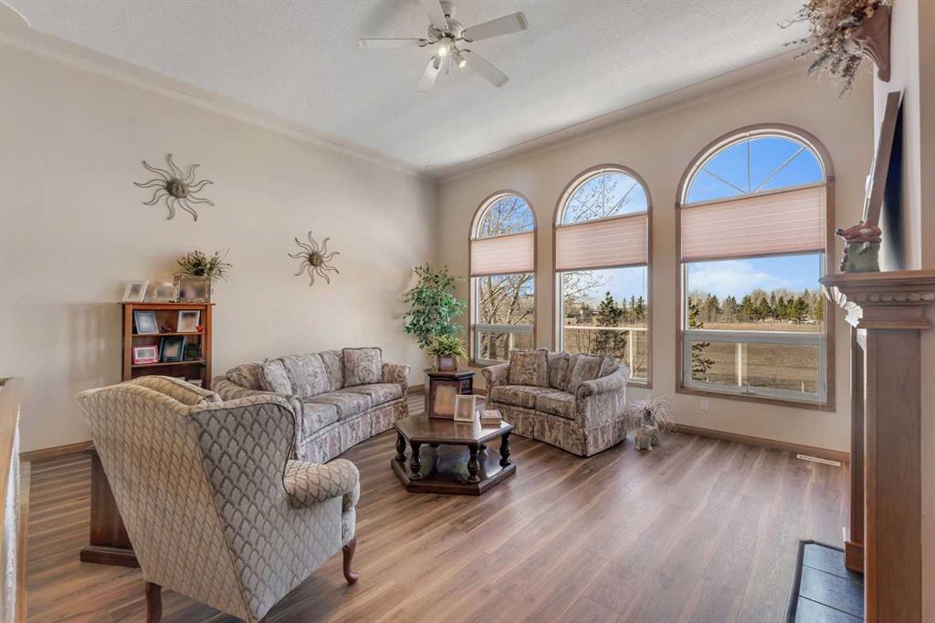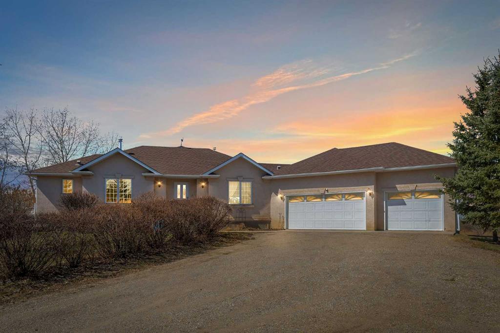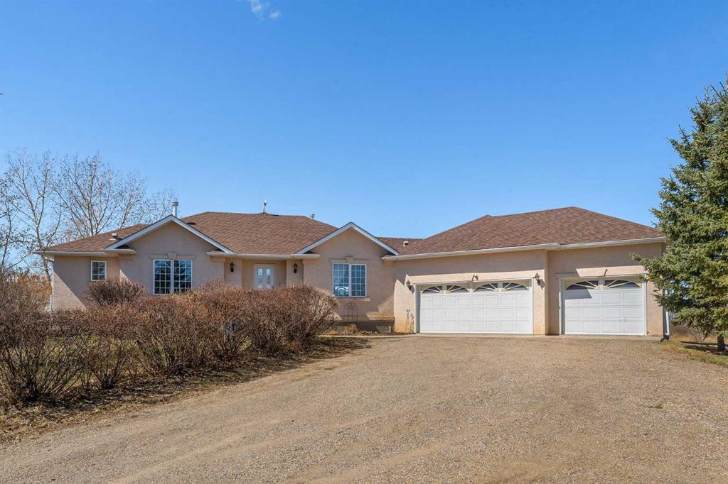 Walkout bungalow on 4 acres with a triple attached garage and over 3000 sq ft of developed living space. This is the kind of property that offers both space and flexibility—inside and out. The main floor is bright and open with high ceilings that make the entire home feel even larger. The living room is anchored by a gas fireplace and flows easily into the white kitchen, complete with ample cabinetry, generous counter space, and a sunny breakfast nook overlooking the property. A formal dining room adds the perfect spot for hosting family dinners or special occasions. There are two bedrooms on the main level, including the primary with its own ensuite, offering a comfortable and private retreat. The fully developed walkout basement expands your living space with three additional bedrooms, a large rec room, and direct access to the outdoors—ideal for guests, a growing family, or multi-generational living. Outside, the 4 acres provide endless possibilities. Enjoy the privacy, the views, and the freedom to use the land the way you want—all just a short drive from amenities.