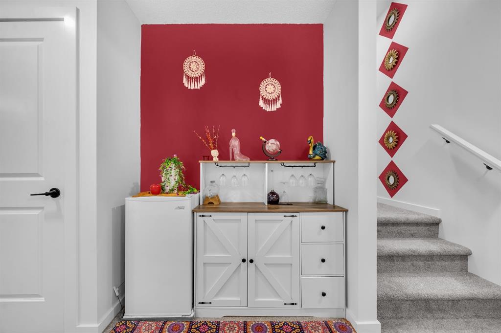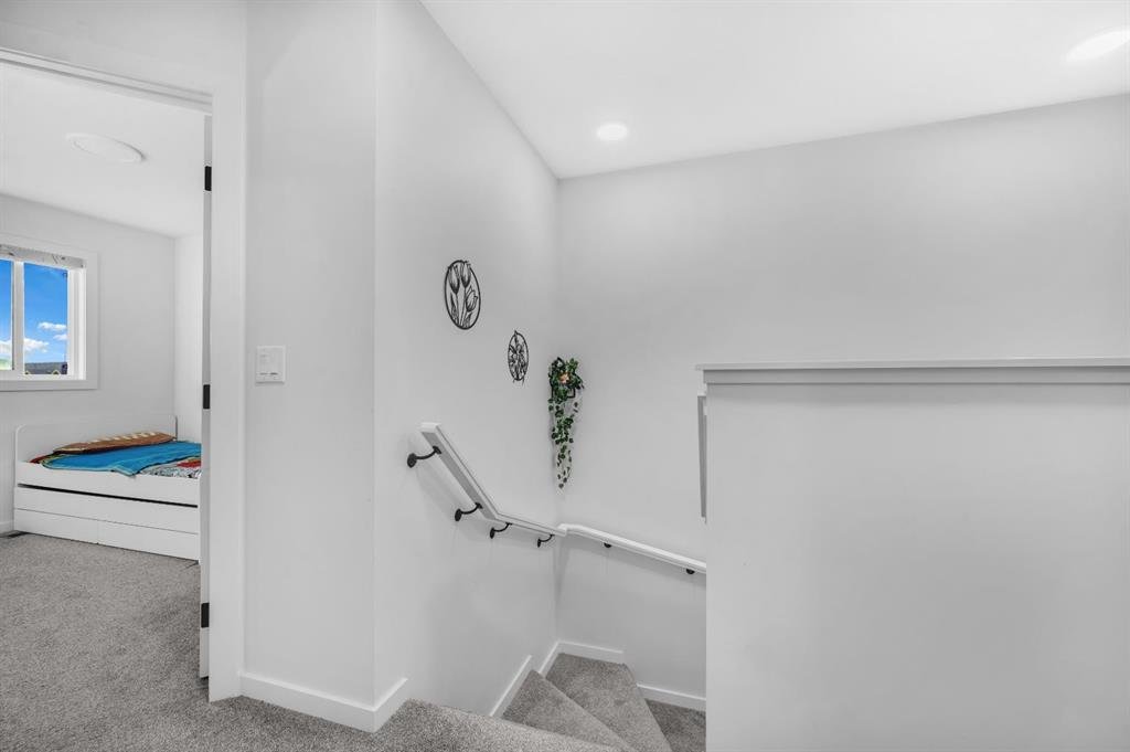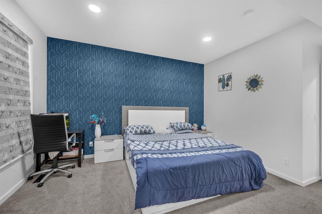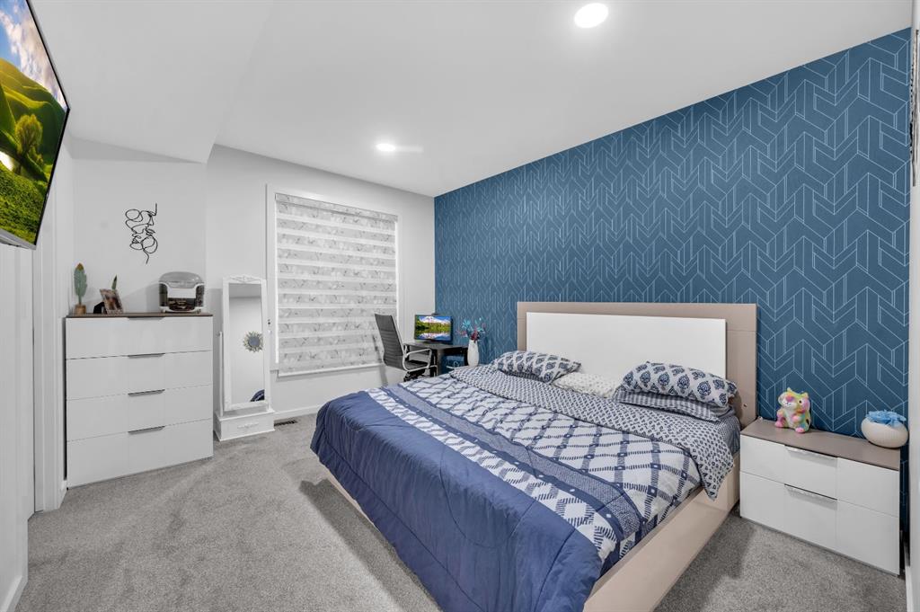 The upper level offers three well-sized bedrooms. The primary suite features a walk-in closet and a private ensuite, while the additional two bedrooms share a full bathroom. Designer wallpaper and feature walls enhance the home with added warmth and character.