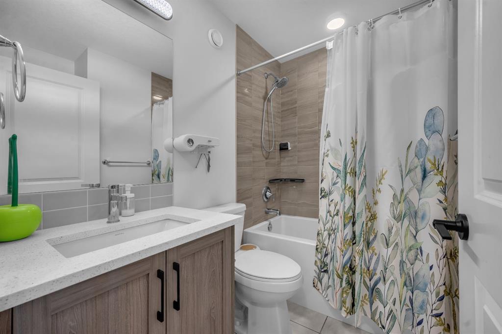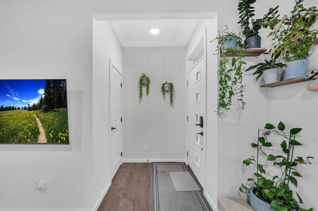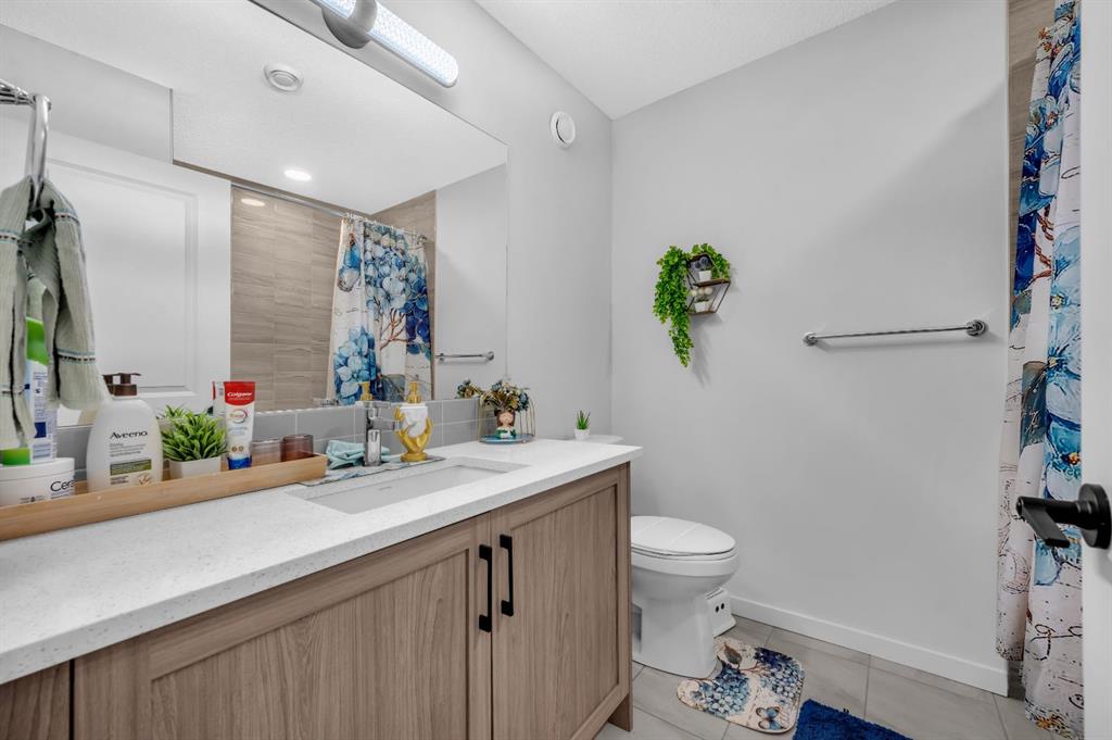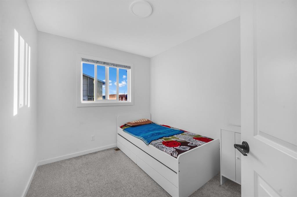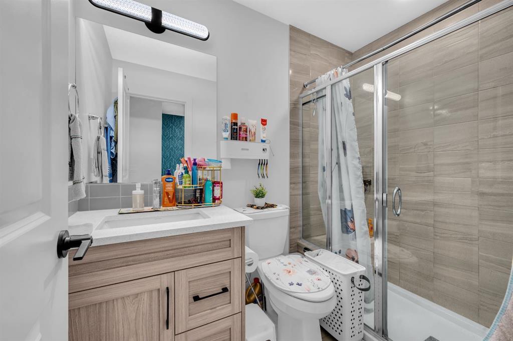 The upper level offers three well-sized bedrooms. The primary suite features a walk-in closet and a private ensuite, while the additional two bedrooms share a full bathroom. Designer wallpaper and feature walls enhance the home with added warmth and character.