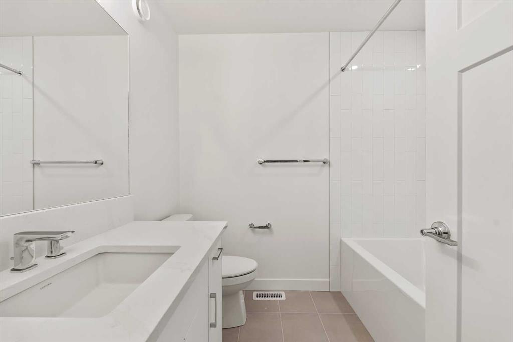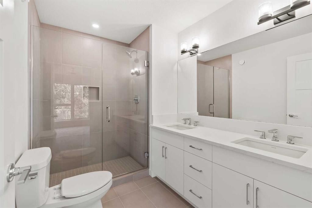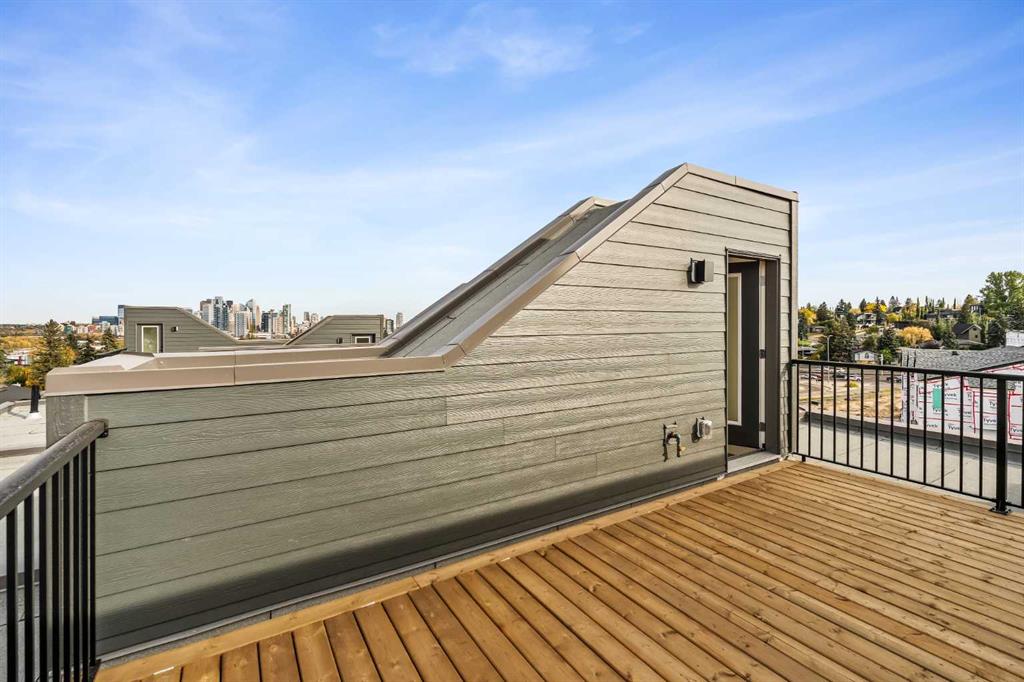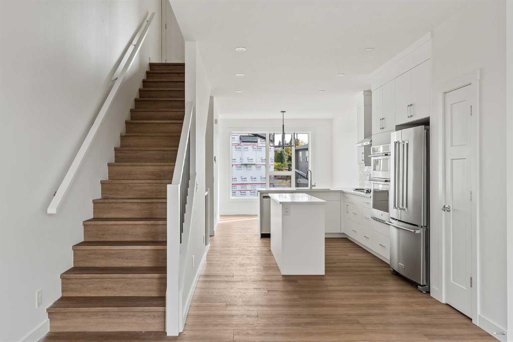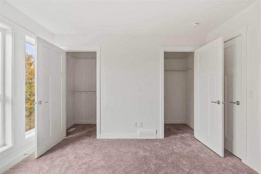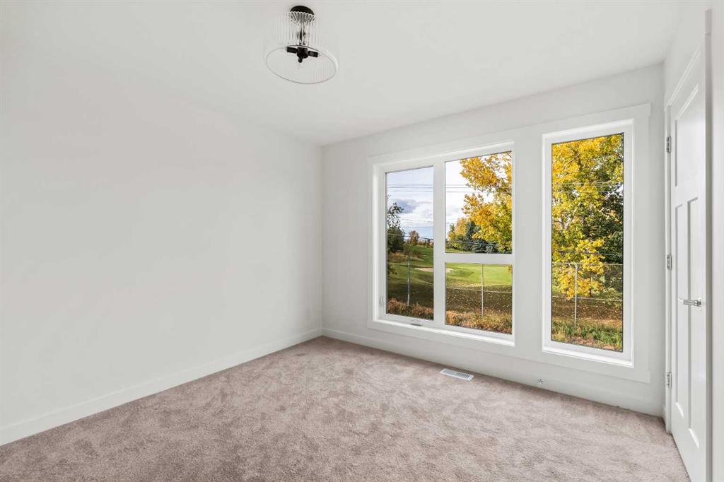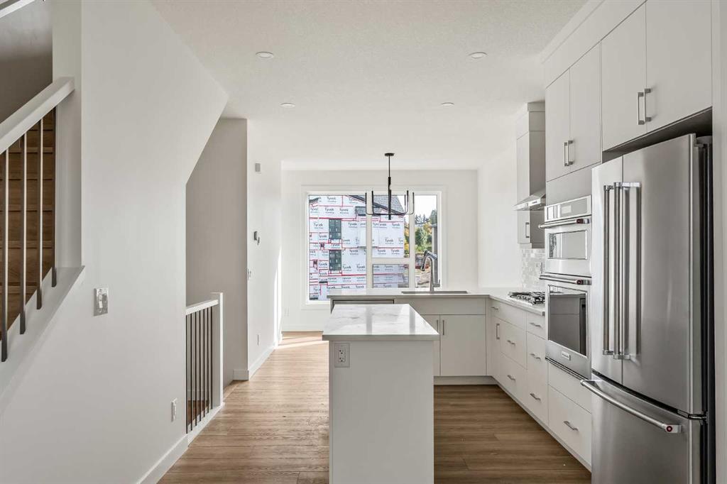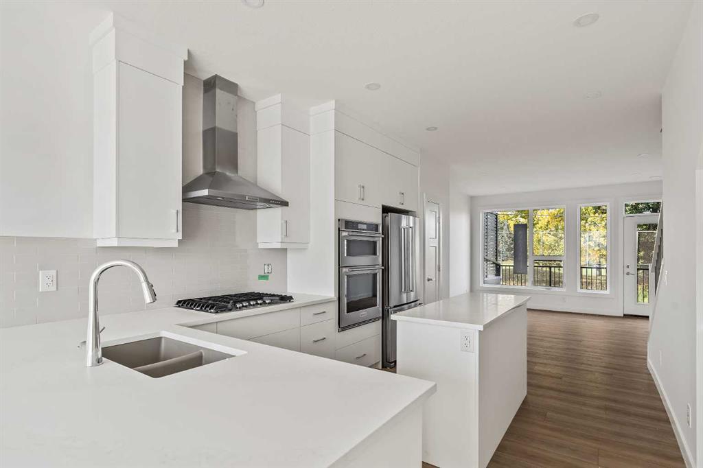 Limited promotion: FREE A/C + 2 YEARS OF FREE CONDO FEES ($13,000 VALUE)! Welcome to The Alameda by Brookfield Residential – where modern design meets urban convenience, just minutes from downtown Calgary with stunning views! This beautiful 2-bedroom, 2.5-bathroom townhome offers over 1,400 sq. ft. of thoughtfully designed living space, complete with a single attached garage and a spacious main-level flex room – perfect for a home office, gym, or creative studio + 3 outdoor living spaces including a rooftop patio! The lower level features an expansive flex room spanning ~14’x14′ with soaring 10′ ceilings and a wall of windows overlooking your private patio and the front street. Experience open-concept living on the main level highlighted by 9’ ceilings throughout with oversized triple-pane windows at either end providing endless natural light all year long. The kitchen is a chef’s dream, featuring KitchenAid gourmet appliances, including a gas cooktop, wall oven/microwave, and a chimney hood fan, all complemented by elegant finishes and generous counter space and a pantry. The kitchen is central to the main level, opening to both the dining area and great room, creating the ideal space for entertaining. The great room has direct access to the main level balcony that spans 15′ x 9’8″ and includes a BBQ gas line for everyday convenience. The upper level features a large primary suite complete with walk-in closet and a private 4pc ensuite with dual sinks and a tiled walk-in shower. A large second bedroom, full bathroom and laundry complete the upper level. The top level of the home is where you’ll spend your summers – soaking up the sun on your private ~200 ft2 rooftop patio with views overlooking the Shaganappi golf course! Complete with 2 living areas, 2 bedrooms, 2.5 bathrooms and 3 outdoor living spaces + a private attached garage, this home is perfect for professionals or down-sizers that appreciate convenience. Located away from Bow Trail, this premium location offers a quiet space for daily living with convenient access to the CTrain and downtown Calgary just minutes away. Additional features include convenient street parking in front, and full builder warranty + Alberta New Home Warranty – allowing you to purchase with peace of mind. This maintenance-free home is fully move-in ready with free legal fees for the purchaser in desirable Crown Park!