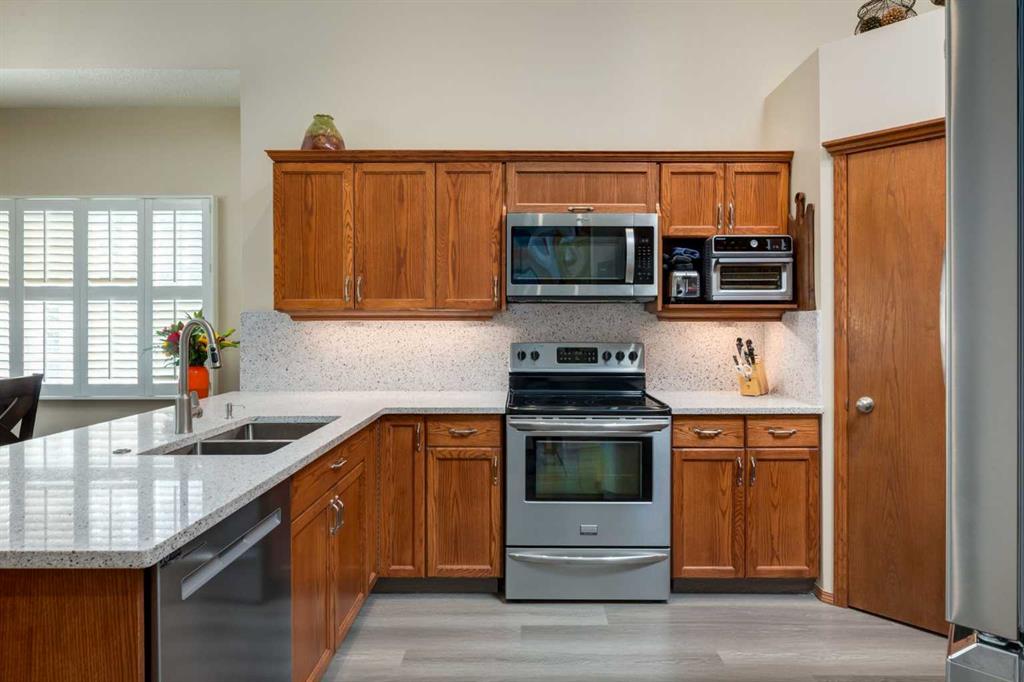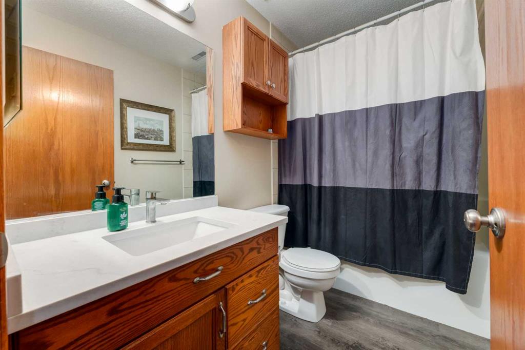 OPEN HOUSE Friday March 20th from 4 to 6 PM. This UPDATED and FULLY DEVELOPED BUNGALOW in the established SW Millrise neighbourhood has almost 2500 square feet of developed space over two levels. There is a long list of extensive and quality interior and exterior improvements completed in past 5+ years. Nicely located on a quiet CUL-DE-SAC with a pie shaped lot backing onto GREEN SPACE, the home has abundant curb appeal with an exterior update by Lummerding Exteriors in 2022, including “heavy wall vinyl” and “class 4” hail impact roof shingles. The double attached garage is heated and finished with “Trimlight” LED lights on front & back of home. The main floor is an open concept layout with VAULTED CEILINGS in primary bedroom, foyer, living, dining, and kitchen areas, plus a skylight. Interior features include updated luxury plank vinyl flooring, custom window coverings, quartz countertops, several updated windows, chrome finish hardware, and updated light fixtures. The kitchen includes a pantry with stainless appliances and adjacent dining area plus eating bar. The exterior door off the living & dining area opens onto a HUGE DECK and PIE SHAPED backyard siding onto GREEN SPACE with walking paths. There is a large, newer window in the family room with a gas fireplace with fan. The primary bedroom offers a walk-in closet and 5-piece ensuite bath with jetted tub and separate shower. The main floor also includes a bright den, convenient half bathroom, and laundry room with newer washer & dryer and back hall closet. The lower level includes a four piece bathroom, two spacious bedrooms and recreation room, each with walk-in closets. This home is in a QUIET LOCATION and in MOVE-IN CONDITION. Millrise offers easy access to both Stoney and Macleod Trail, Fish Creek Park, LRT and numerous restaurants, recreation and retail amenities.