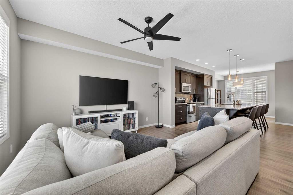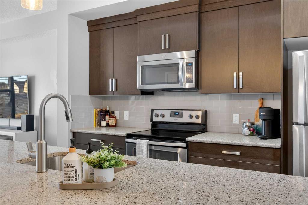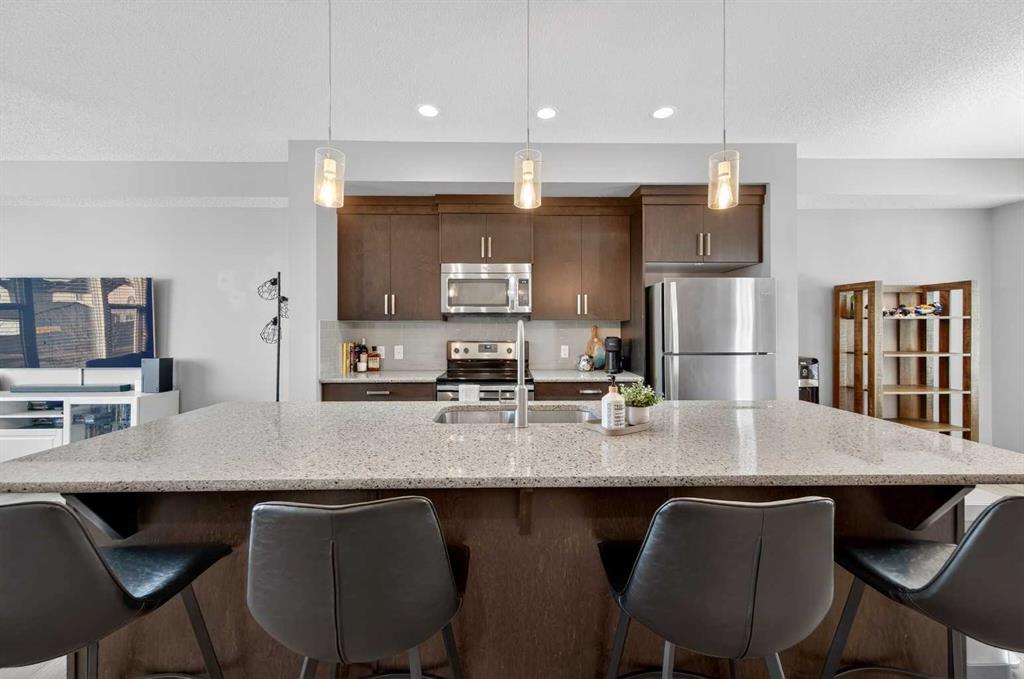 **OPEN HOUSE SATURDAY Feb 7th and SUNDAY Feb 8th 12:00pm – 3:00pm** Welcome to the highly sought after Elements complex in New Brighton! This unit features 1600 of above grade square footage and twice as wide as most townhouses in the area with a true double garage that fits a full-size truck. Spacious open floor concept with modern grey laminate flooring throughout the main floor and large windows flooding the property with natural light. Chef’s dream kitchen with rich espresso-stained cabinetry, granite counters, stainless steel appliances, subway tile backsplash, and huge 12 ft center island with undermount sink! Open to the dining room with a large window and access door to the sunny West balcony with power and natural gas hook up. Good sized living room with picture window and office nook, perfect for those working from home. Head upstairs to the two master suites both with walk-in closets and full ensuite bathrooms with granite counters and tile flooring. This well laid out upper level also features an extra open providing flexibility. A 2-piece powder room and lower-level laundry room with new high end LG front-loading washer and dryer to complete this great space. Fully finished and heated garage that fits a full-size truck, which is rare in even new detached houses these days, let alone a townhome! Central A/C with low dBs added and included to stay comfortable on those hot summer nights. With its excellent location close to shopping, parks, schools, New Brighton Athletic Park, and all the amenities and restaurants on 130th Avenue, this home has everything you’ve been looking for in an established and family-friendly community. Commuting is a breeze with quick access to Stoney Trail Ring Road, 52nd Street, and 22x. This property is a must see!
