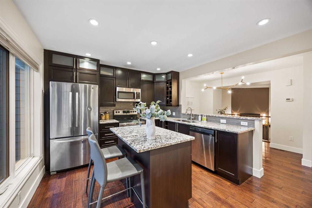 The open-concept kitchen is perfectly designed for both everyday living and entertaining, offering a spacious dining nook, modern light fixtures, GRANITE countertops, stainless steel appliances, dark full-height cabinetry, and a built-in pantry, all complemented by beautiful HARDWOOD floors that flow throughout the main level. This thoughtfully designed layout feels open, warm, and functional while still being stylish and inviting.