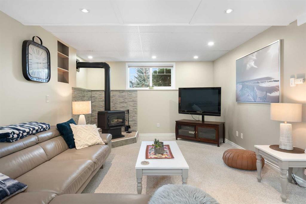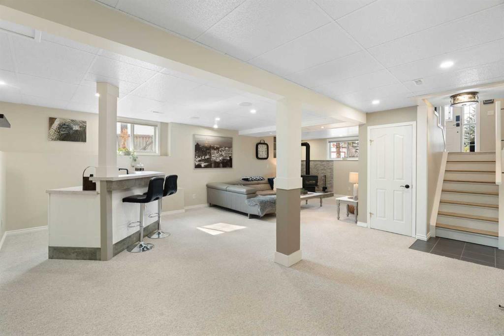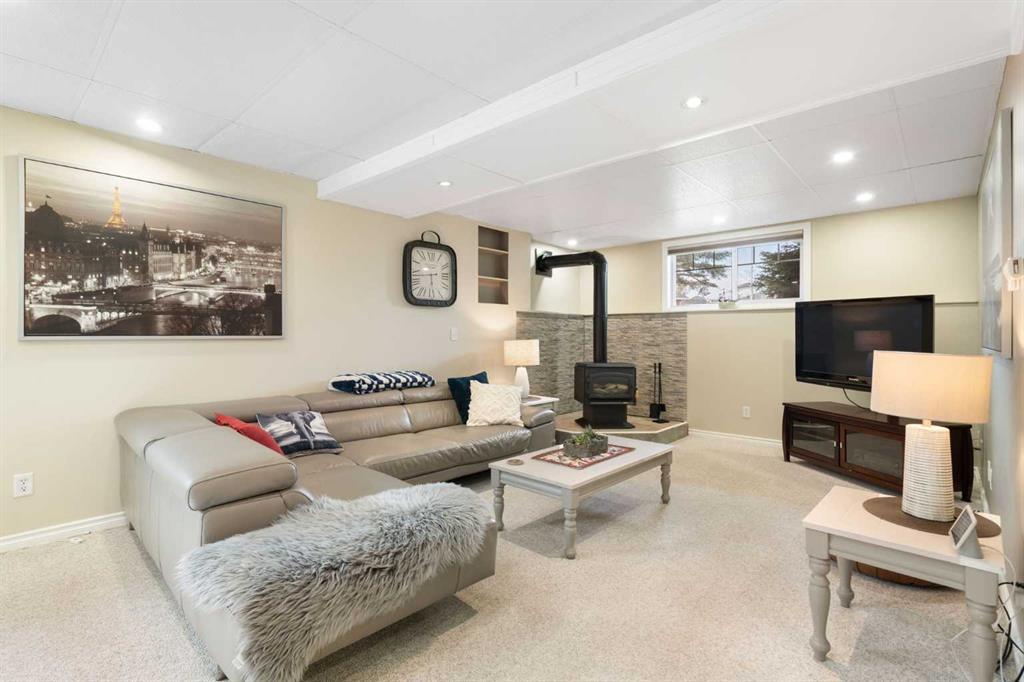 The fully developed lower level offers a spacious rec room with a wet bar, a cozy natural gas fireplace, two additional bedrooms, and a 4-piece bath with heated tile floors. Mechanical integrity is a priority here: Poly-B has been replaced with Pex, the hi-efficiency furnace and central A/C are newer (2023), and attic insulation was upgraded to R55.