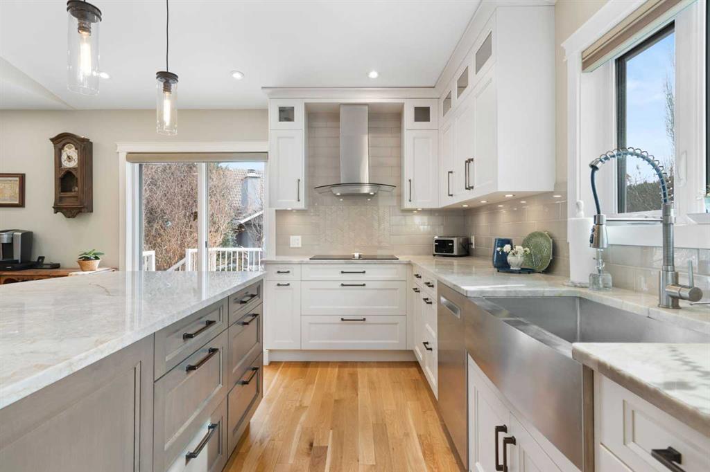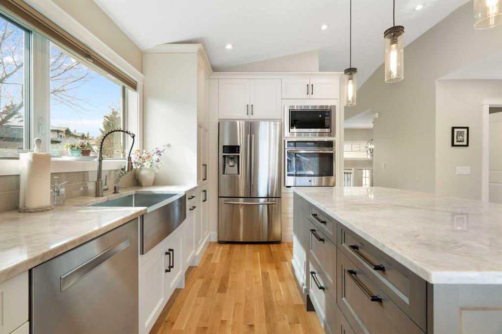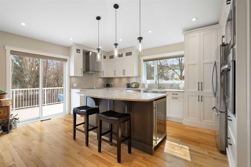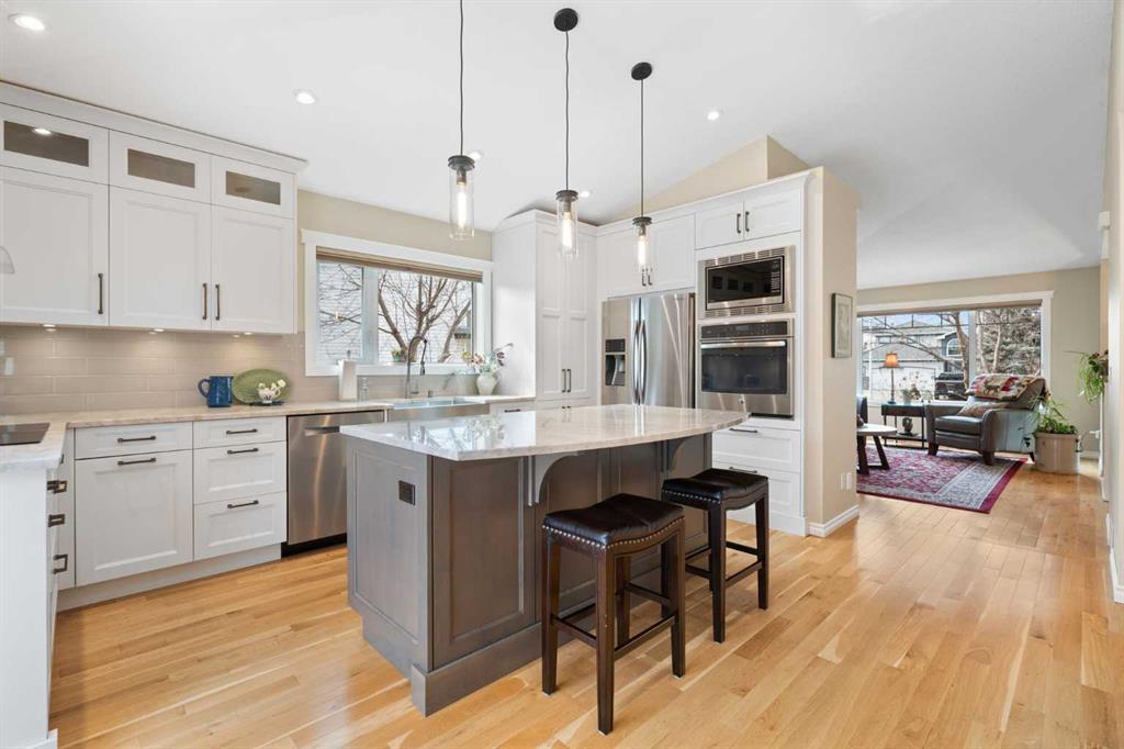 Outside, the massive south-facing backyard is a private oasis with a large deck, private patio and mature trees. Enjoy direct access to walking paths leading to the Bow River, with schools and shopping just minutes away. Complete with an insulated, drywalled, and heated double garage—this home is truly turn-key.
