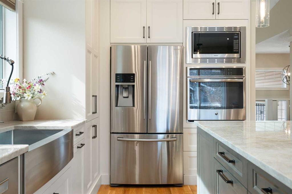 The main floor is a showcase of timeless design, featuring vaulted ceilings and stunning hardwood floors. The gourmet-style kitchen is a masterpiece, boasting quartzite counters, ceiling-height soft-close cabinetry, a farmhouse sink, and a high-end stainless appliance package featuring an induction cooktop and built-in wall oven. A central island with breakfast bar and a built-in beverage cooler make this the ultimate space for entertaining. Retreat to the primary bedroom, complete with a walk-in closet and a 3-piece ensuite with heated floors.