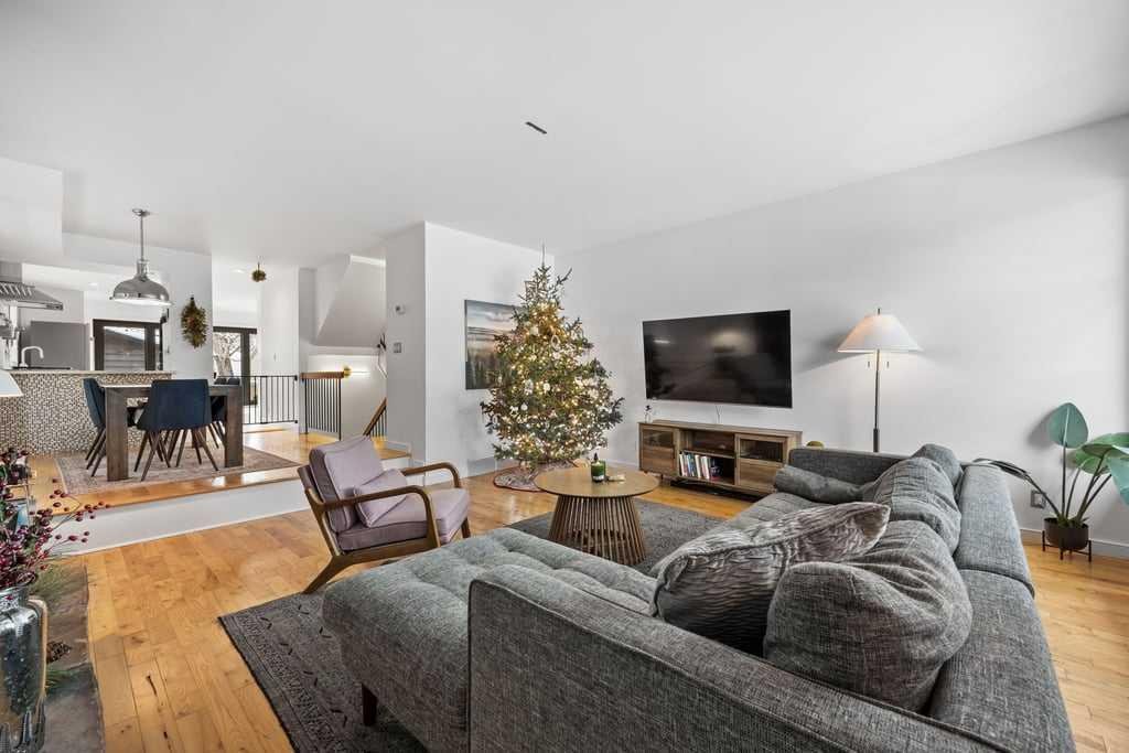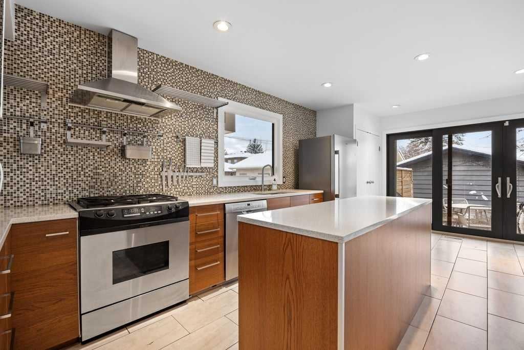 Natural light fills the main floor thanks to large windows and a layout that flows easily into the dining area and refreshed kitchen. Here, sleek contemporary wood cabinetry, quartz countertops, and a trendy tiled backsplash elevate the entire space with a clean, modern look. At the back of the home, magnificent rear glass doors open to a tiered deck—seamlessly connecting indoor and outdoor living.