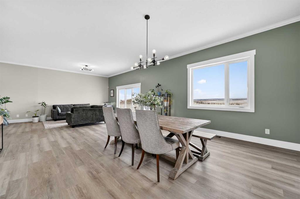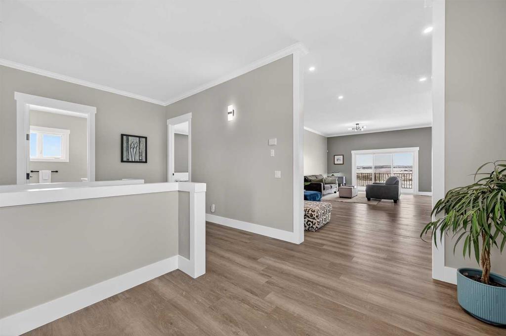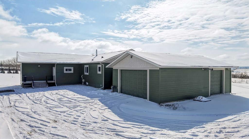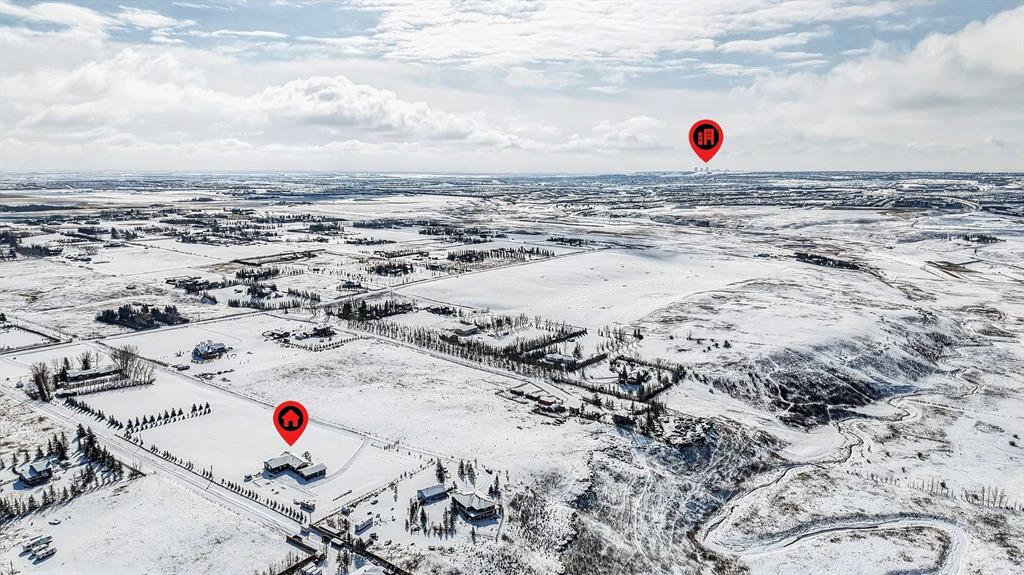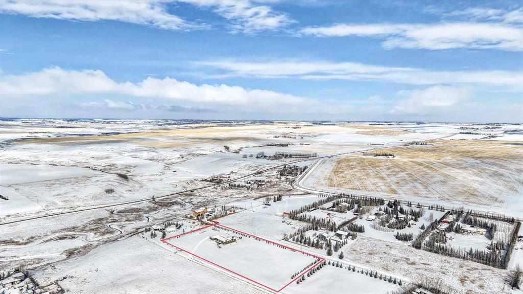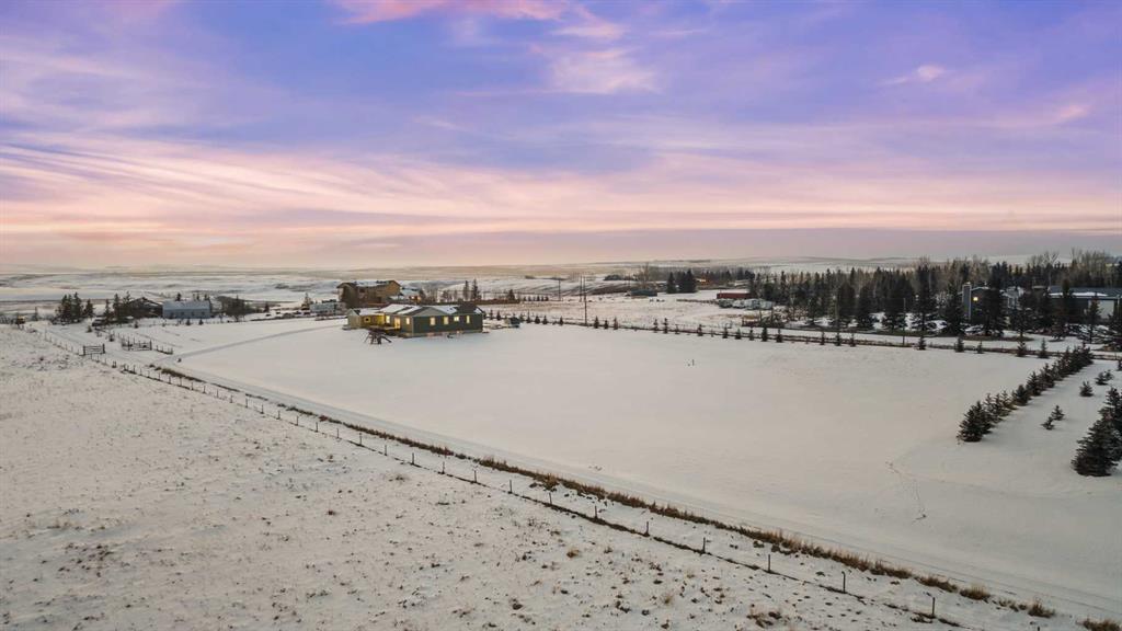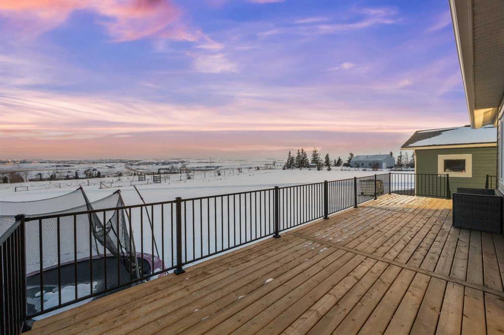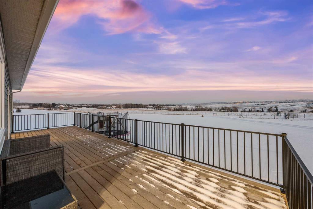 Experience modern luxury acreage living with breathtaking city views, refined design, and extensive upgrades, all set on 5+/- acres just minutes to Calgary, Airdrie, CrossIron Mills, and the airport. Offering 2623 sqft on the main floor, 3 beds, 3 baths, and a triple car garage with radiant heat, this property delivers the perfect blend of comfort, functionality, and elevated style. Step inside to a bright, welcoming entryway that opens into a thoughtfully designed layout featuring NEW vinyl plank flooring throughout and 10’ knockdown ceilings with crown molding across the main floor. Expansive NEW windows throughout the home capture incredible natural light while showcasing the surrounding landscape and distant city skyline. The chef-inspired kitchen is a true focal point, complete with quartz countertops throughout, SS appliances, a flush gas cooktop with downdraft ventilation, reverse osmosis, wall oven and microwave, under-mount farmhouse SS sink, and a spacious walk-in pantry. The impressive 8’ centre island with eating bar and additional storage is ideal for both everyday living and entertaining. A stylish coffee station/dry bar with beverage cooler, floating shelves, and extensive cabinetry further elevate the space. The open-concept living room is anchored by a stunning custom feature wall with built-in cabinetry, creating warmth and architectural interest. The generous dining area is flooded with sunlight from large south-facing windows and offers seamless access to the NEW deck, where panoramic views provide the perfect backdrop for relaxing evenings or hosting. The primary retreat is exceptionally spacious and designed for comfort, featuring a luxurious 4-piece ensuite with a fully tiled floor-to-ceiling walk-in shower, oversized quartz vanity with dual sinks, and modern finishes. Two additional bedrooms are both generously sized and include built-in closets. The 5-piece main bath offers a spa-like feel with a stand-alone tub, second fully tiled walk-in shower, and another oversized dual-sink quartz vanity. Function meets convenience with a laundry room and 1/2 bath located off the garage entry, along with a well-designed boot room featuring built-in cabinetry, drawers, coat hooks, and bench seating. The unfinished basement with 9’ ceilings provides incredible potential for future development, whether you envision additional living space, a home gym, or entertainment area. Extensive upgrades ensure peace of mind and efficiency, including NEW triple pane windows throughout the main floor, NEW basement windows, NEW Hardie board siding, NEW Class 4 shingles, and the complete absence of Poly B plumbing. The home is also a proud recipient of the Greener Homes Grant, adding further value and energy efficiency. Outside, the property is beautifully established and thoughtfully landscaped.This is a rare opportunity to own a turnkey acreage that offers space, style, and convenience—all in one exceptional location with stunning views and easy access to the city.