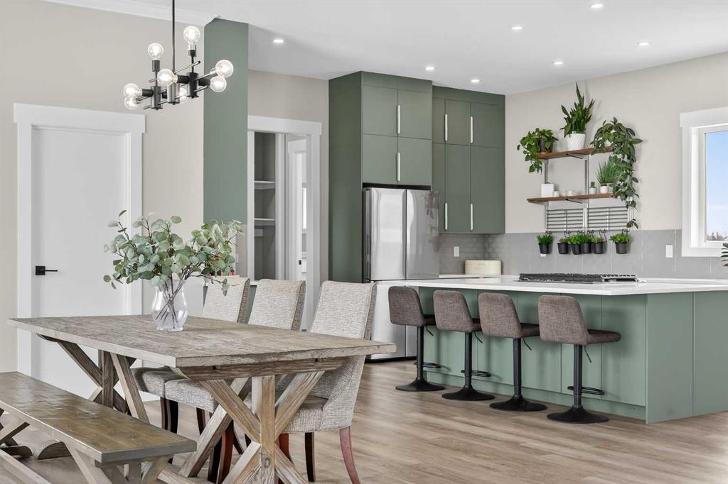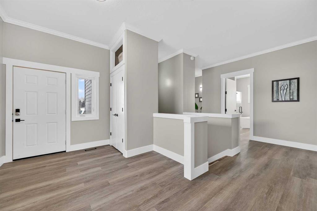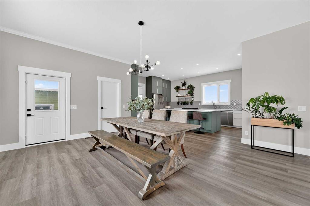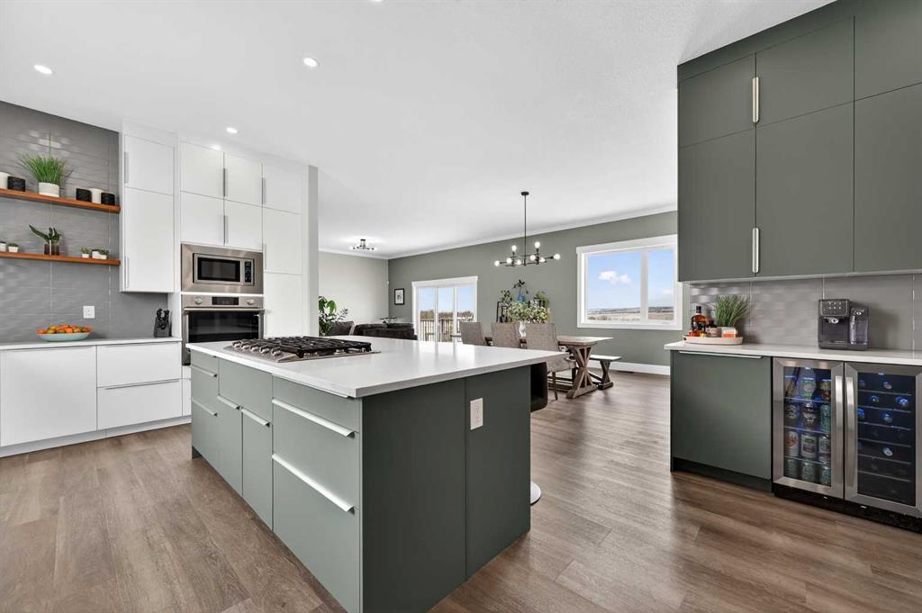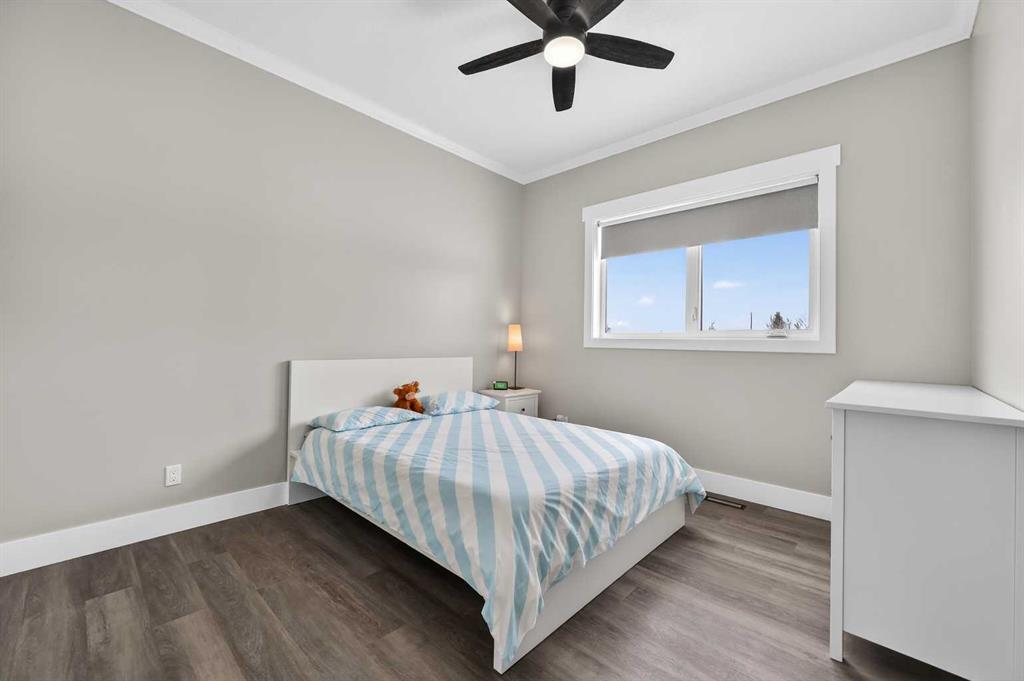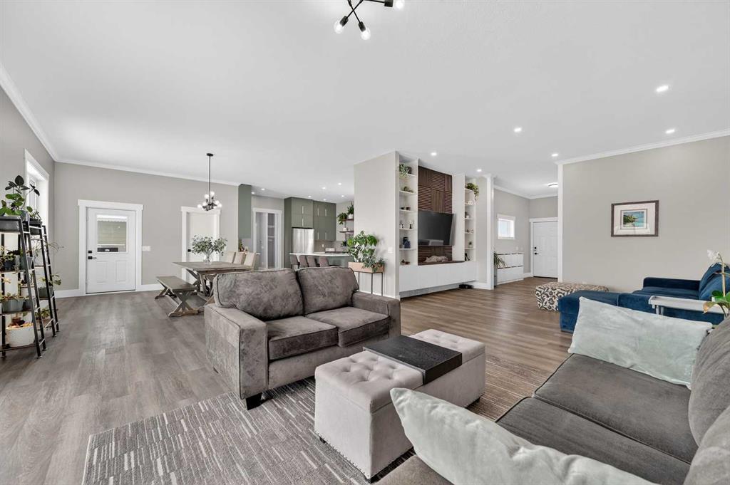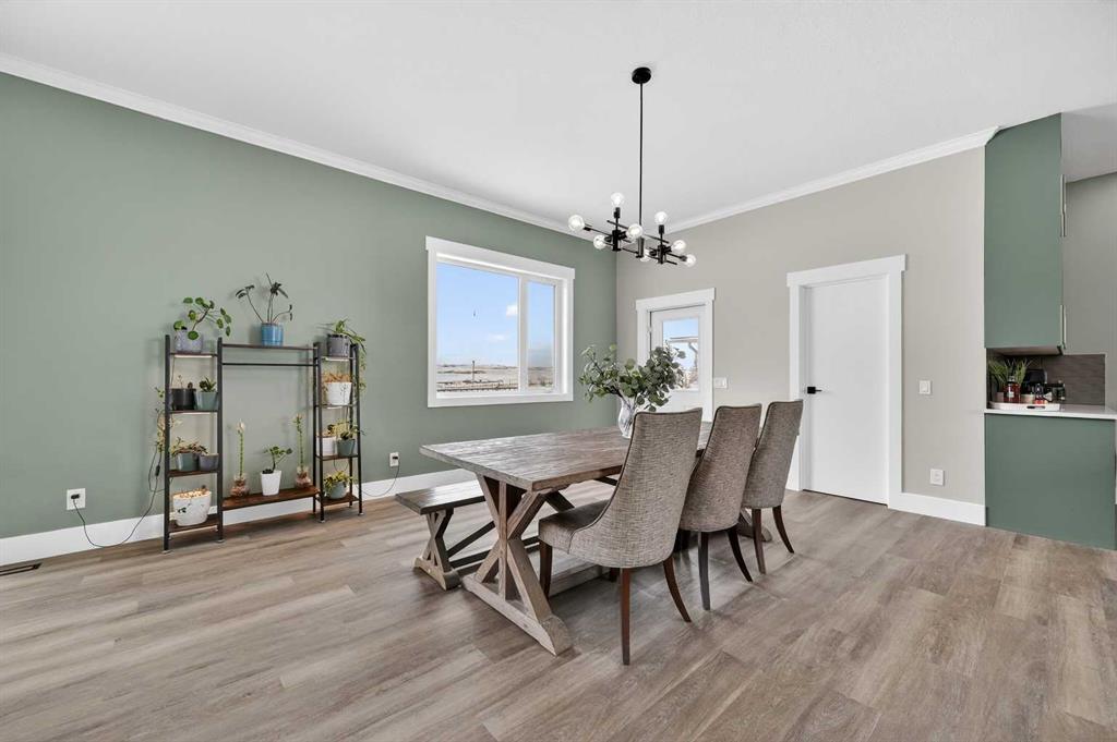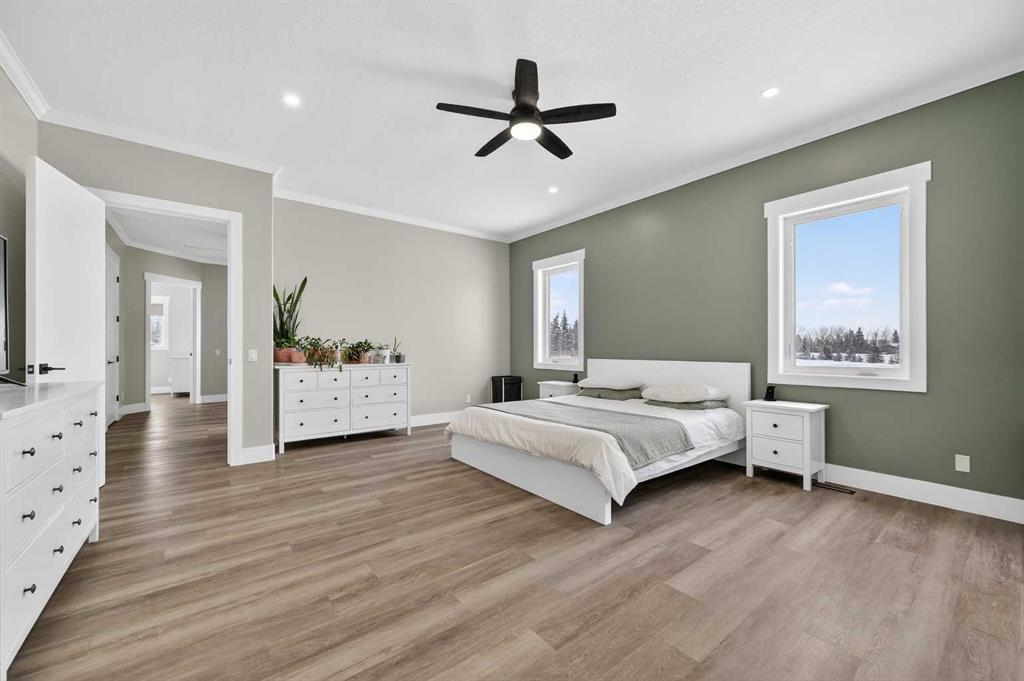 Experience modern luxury acreage living with breathtaking city views, refined design, and extensive upgrades, all set on 5+/- acres just minutes to Calgary, Airdrie, CrossIron Mills, and the airport. Offering 2623 sqft on the main floor, 3 beds, 3 baths, and a triple car garage with radiant heat, this property delivers the perfect blend of comfort, functionality, and elevated style. Step inside to a bright, welcoming entryway that opens into a thoughtfully designed layout featuring NEW vinyl plank flooring throughout and 10’ knockdown ceilings with crown molding across the main floor. Expansive NEW windows throughout the home capture incredible natural light while showcasing the surrounding landscape and distant city skyline. The chef-inspired kitchen is a true focal point, complete with quartz countertops throughout, SS appliances, a flush gas cooktop with downdraft ventilation, reverse osmosis, wall oven and microwave, under-mount farmhouse SS sink, and a spacious walk-in pantry. The impressive 8’ centre island with eating bar and additional storage is ideal for both everyday living and entertaining. A stylish coffee station/dry bar with beverage cooler, floating shelves, and extensive cabinetry further elevate the space. The open-concept living room is anchored by a stunning custom feature wall with built-in cabinetry, creating warmth and architectural interest. The generous dining area is flooded with sunlight from large south-facing windows and offers seamless access to the NEW deck, where panoramic views provide the perfect backdrop for relaxing evenings or hosting. The primary retreat is exceptionally spacious and designed for comfort, featuring a luxurious 4-piece ensuite with a fully tiled floor-to-ceiling walk-in shower, oversized quartz vanity with dual sinks, and modern finishes. Two additional bedrooms are both generously sized and include built-in closets. The 5-piece main bath offers a spa-like feel with a stand-alone tub, second fully tiled walk-in shower, and another oversized dual-sink quartz vanity. Function meets convenience with a laundry room and 1/2 bath located off the garage entry, along with a well-designed boot room featuring built-in cabinetry, drawers, coat hooks, and bench seating. The unfinished basement with 9’ ceilings provides incredible potential for future development, whether you envision additional living space, a home gym, or entertainment area. Extensive upgrades ensure peace of mind and efficiency, including NEW triple pane windows throughout the main floor, NEW basement windows, NEW Hardie board siding, NEW Class 4 shingles, and the complete absence of Poly B plumbing. The home is also a proud recipient of the Greener Homes Grant, adding further value and energy efficiency. Outside, the property is beautifully established and thoughtfully landscaped.This is a rare opportunity to own a turnkey acreage that offers space, style, and convenience—all in one exceptional location with stunning views and easy access to the city.