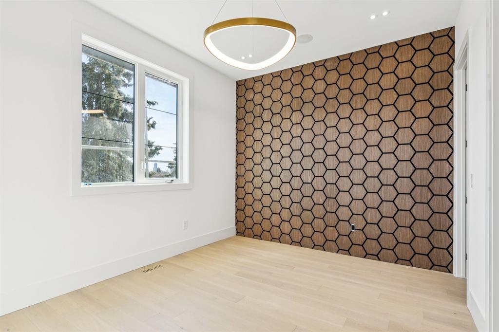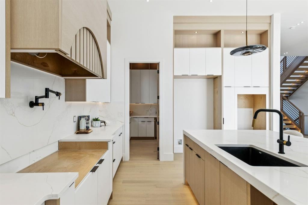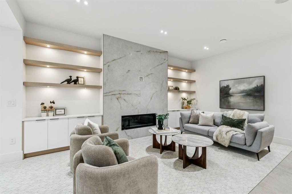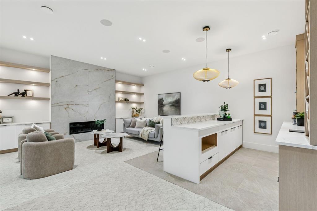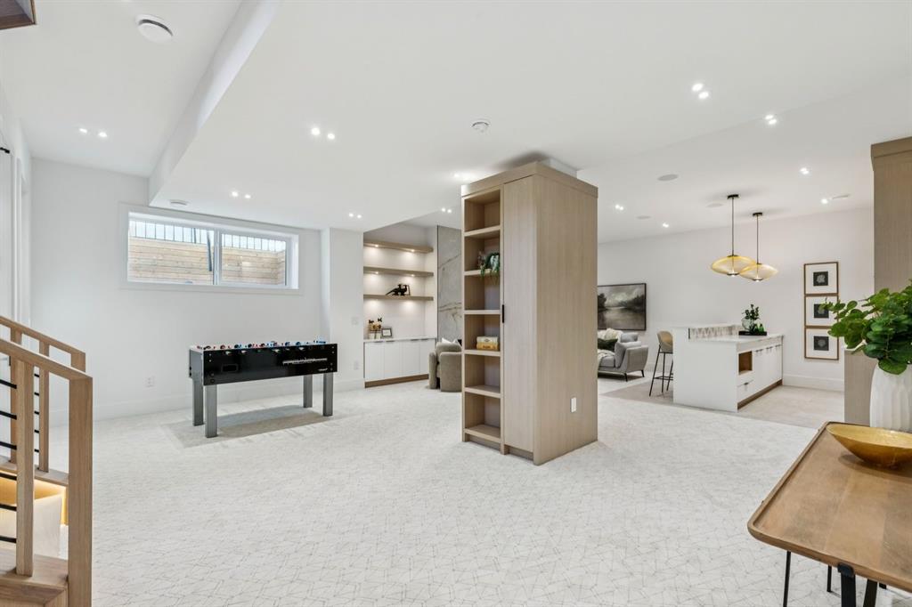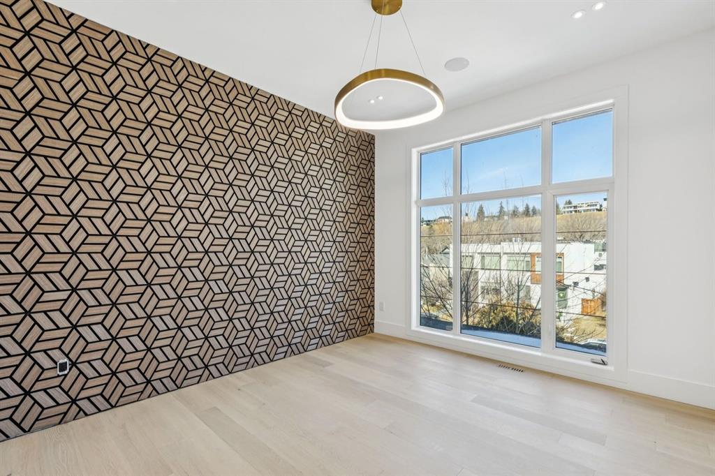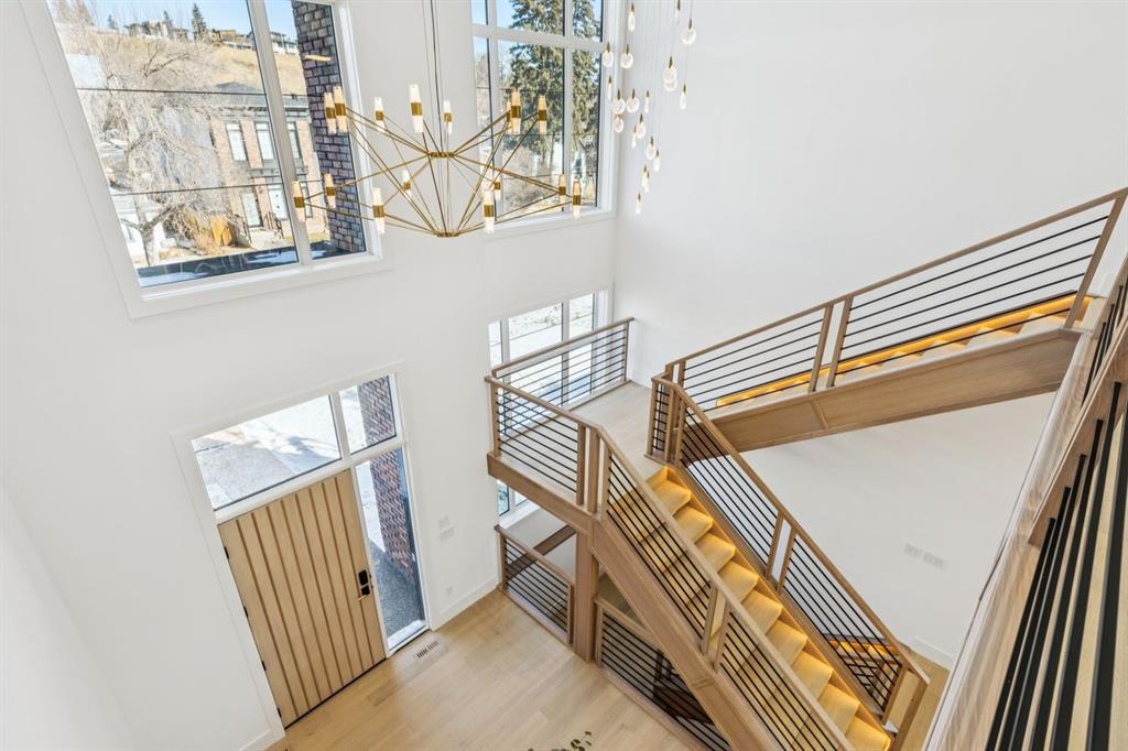 Discover refined living in this exceptional custom build by HeavenView Homes, ideally located in sought after West Hillhurst. Crafted with uncompromising attention to detail, this home sets a new standard for luxury with elevated design, impeccable finishes, and thoughtfully curated spaces throughout. From the moment you enter, a custom solid wood and metal feature railing creates a striking architectural statement, while soaring 12 ft ceilings on the main level and 10 ft ceilings on the upper and basement levels enhance the home’s sense of scale. White oak hardwood floors, dramatic feature walls, more than 200 pot lights, and extensive LED strip lighting elevate the interior, while oversized triple pane windows flood the home with natural light and complement whole house spray foam insulation for superior efficiency. The elegant dining room flows into the living room, separated by a custom LED-lit architectural feature wall, while bespoke millwork frames a sleek linear gas fireplace. Expansive sliding doors open to a premium exposed concrete patio with an outdoor gas fireplace, seamlessly blending indoor and outdoor living while overlooking the sunny South facing backyard. The statement kitchen is equipped with premium JennAir appliances including a gas cooktop, built-in oven, microwave, and coffee system, complemented by quartz counters, an oversized island, and extensive custom cabinetry. A wraparound butler’s pantry provides abundant storage, shelving, and dedicated wine storage. A spacious mudroom with built-ins connects to the triple attached garage, finished with epoxy flooring and a heater, while AC will also be installed to the home for added comfort. Upstairs, natural light fills the open riser staircase and leads to a well appointed laundry room, coffee/beverage station, and four generous bedrooms, each with feature walls and private ensuites. Bathrooms are enhanced with upgraded Japanese toilets, blending advanced technology with refined design. The primary retreat features a custom walk-in dressing room and a luxurious 6pc ensuite with a deep soaker tub and glass encased steam shower with body sprays. The lower level is designed for relaxation and entertaining with radiant boiler in-floor heat, plush carpets, expansive games and rec areas, a fully equipped wet bar, and extensive wine storage. A dedicated home gym with rubber flooring and mirrored walls, a fifth bedroom with its own ensuite, and an additional powder room complete the space. Technology is seamlessly integrated with 20+ pairs of KEF in-ceiling speakers throughout. The South facing backyard will also feature a fully new fence and professional landscaping once weather permits. Ideally located minutes from Westmount Charter School, Helicopter Park, the off-leash dog park, Foothills Medical Centre, and the Bow River Pathway, this remarkable residence seamlessly blends timeless elegance with modern sophistication.