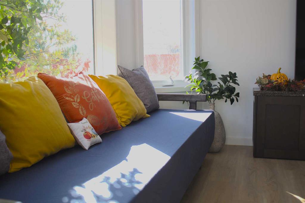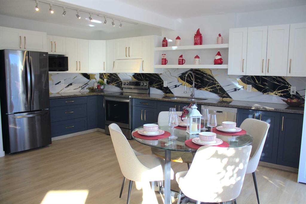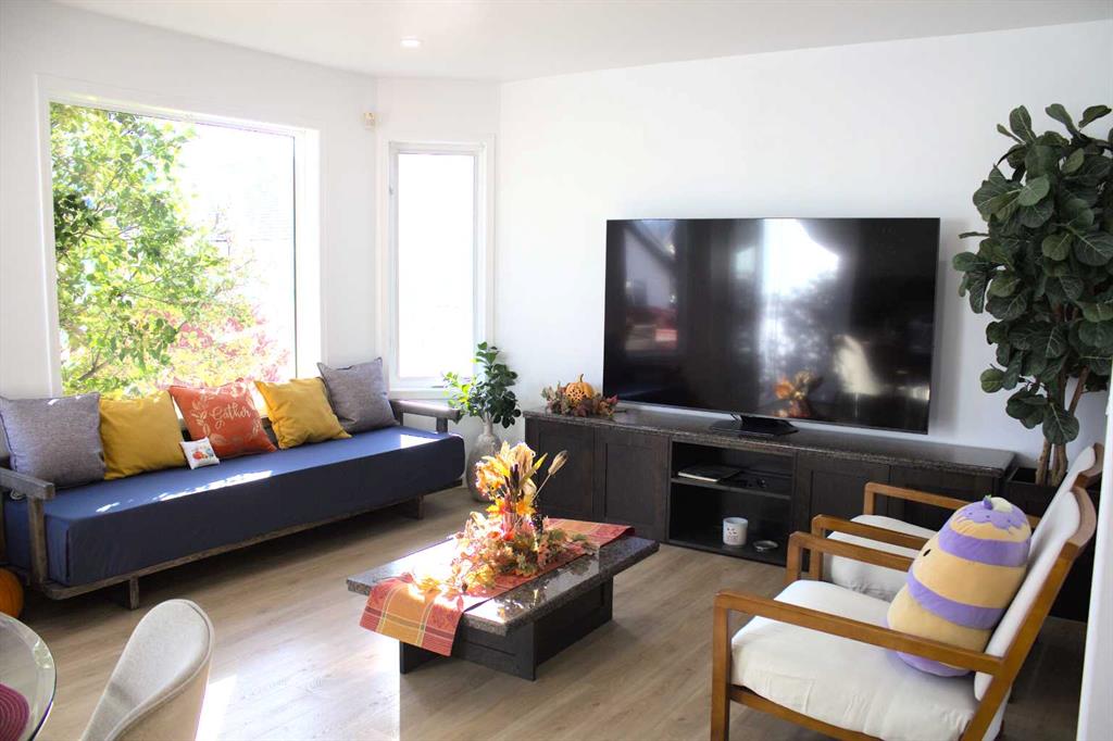 The main floor welcomes you with a generous foyer that opens into an expansive, light-filled living area. Culinary enthusiasts will appreciate the brand new, beautifully designed kitchen, complete with modern appliances, abundant cabinetry, and ample counter space for effortless meal preparation. The inviting dining area is highlighted by a dramatic floor-to-ceiling window and direct access to a fully fenced, landscaped backyard—perfect for children or entertaining—featuring mature trees, a garden, fire pit, and convenient RV parking via the back lane. A full bathroom on the main level adds flexibility and convenience for families and guests.