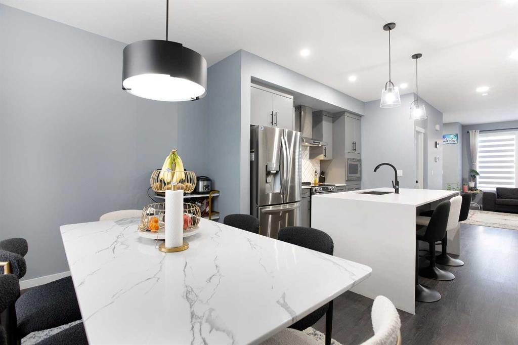 Welcome to this beautifully updated 3-bedroom, 2.5-bath Morrison-built home located in the vibrant, family-friendly community of Belmont, Calgary. Thoughtfully upgraded and meticulously maintained, this home combines modern style with exceptional functionality—perfect for families, professionals, or anyone seeking a move-in-ready home in a rapidly growing area. Step inside to an open and inviting main floor featuring luxury vinyl plank flooring, contemporary finishes, and large windows that fill the space with natural light. The stylish kitchen stands out with quartz countertops, stainless steel appliances, upgraded cabinetry, and a spacious island ideal for cooking, hosting, or casual dining. The adjoining living and dining areas create a seamless flow, making the space perfect for both everyday living and entertaining. Upstairs, you’ll find three generous bedrooms, including a serene primary suite complete with a walk-in closet and a private 4-piece ensuite. Two additional bedrooms, a full bathroom, and a convenient laundry area complete the upper level. Every room feels fresh, modern, and move-in ready. Outside, the property features a well-sized backyard with plenty of room for play, pets, or future personalization. Located just down the street from one of Belmont’s many upcoming commercial plaza, homeowners will soon enjoy walkable access to shops, services, and dining. Several parks, pathways, and playgrounds are within easy walking distance, making it an ideal setting for outdoor lovers and families. With extensive updates, quality construction, and an unbeatable location in one of Calgary’s fastest-growing communities, this Morrison-built home is an exceptional opportunity. Move in and enjoy comfort, convenience, and a lifestyle that continues to improve as the neighbourhood grows. Don’t delay, book your showing today.