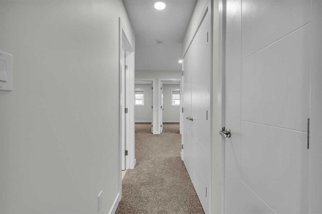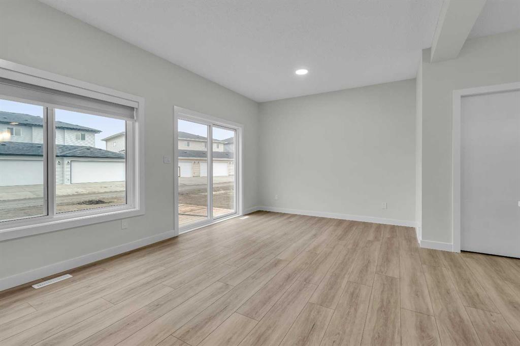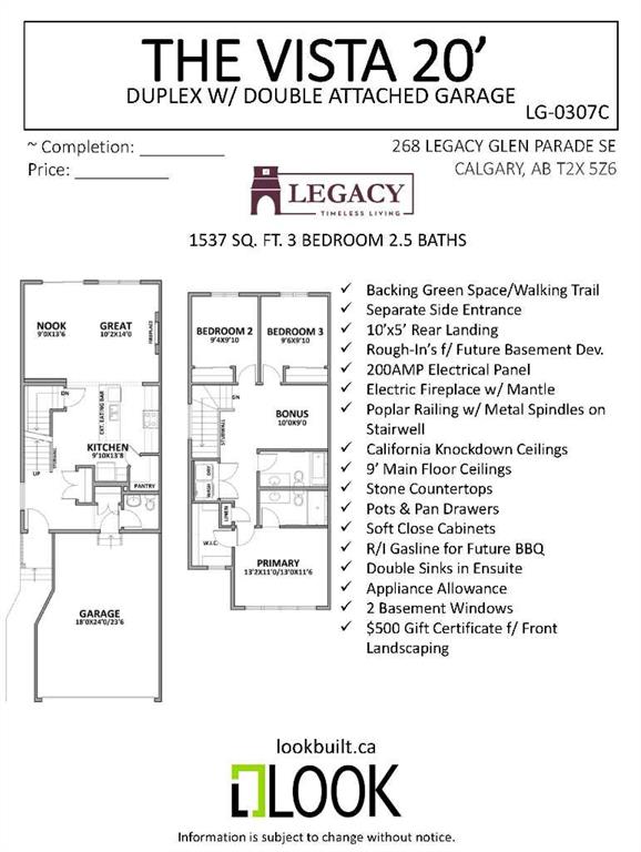 Located in family-friendly Legacy and backing onto a peaceful GREEN SPACE with a WALKING TRAIL, this brand new home is currently under construction with a tentative completion in February 2026. Thoughtful design, upgraded finishes, and future-ready systems come together to create a comfortable and flexible layout ideal for a range of lifestyles. The main level offers 9’ CEILINGS and CALIFORNIA KNOCKDOWN texture for an open, airy feel, while wide windows capture the afternoon and evening light from the SOUTHWEST BACKING YARD. An electric FIREPLACE with a clean-lined mantle anchors the GREAT ROOM, providing warmth and character. In the KITCHEN, STONE COUNTERTOPS, SOFT CLOSE CABINETRY, POTS AND PAN DRAWERS and the full-height tile detail creates a polished backdrop that elevates the hood fan area. The ISLAND includes built-in microwave cabinetry, and a 12” bulkhead above the cabinets adds architectural definition. The adjacent nook provides an inviting space for daily dining with views toward the green space. Upstairs, the primary bedroom features a generous layout, upgraded window design, and a well-appointed ENSUITE for everyday convenience. Two additional BEDROOMS and a BONUS ROOM offer comfortable flexibility for families, guests, or work-from-home arrangements. The upper-level laundry is enhanced by added lighting for improved usability. This home is also equipped with valuable structural and mechanical upgrades, including a 200AMP ELECTRICAL PANEL, rough-in gasline for a future BBQ, and both a SIDE ENTRANCE and extensive ROUGH-INS for FUTURE BASEMENT DEVELOPMENT. These include provisions for laundry, a wet bar, a range hood, dryer vents, and a 2ND FURNACE, allowing future owners to maximize the lower level with ease. Two BASEMENT WINDOWS, including an added 60″x30″ slider, support natural light for potential bedroom development. Exterior enhancements elevate both curb appeal and durability, with HARDIE SIDING, upgraded SMARTBOARD TRIMS, a 10’x5’ REAR LANDING with aluminum railing, and stone details carried across key elevations. The DOUBLE ATTACHED GARAGE is finished with layout adjustments suited to the lot design. Window coverings are included, along with an appliance allowance and a $500 landscaping gift certificate for future finishing touches. With its southwest exposure, upgraded finishes, green space backdrop, and future-ready infrastructure, this home in Legacy delivers comfort, style, and long-term flexibility in a growing, well-connected SE community.